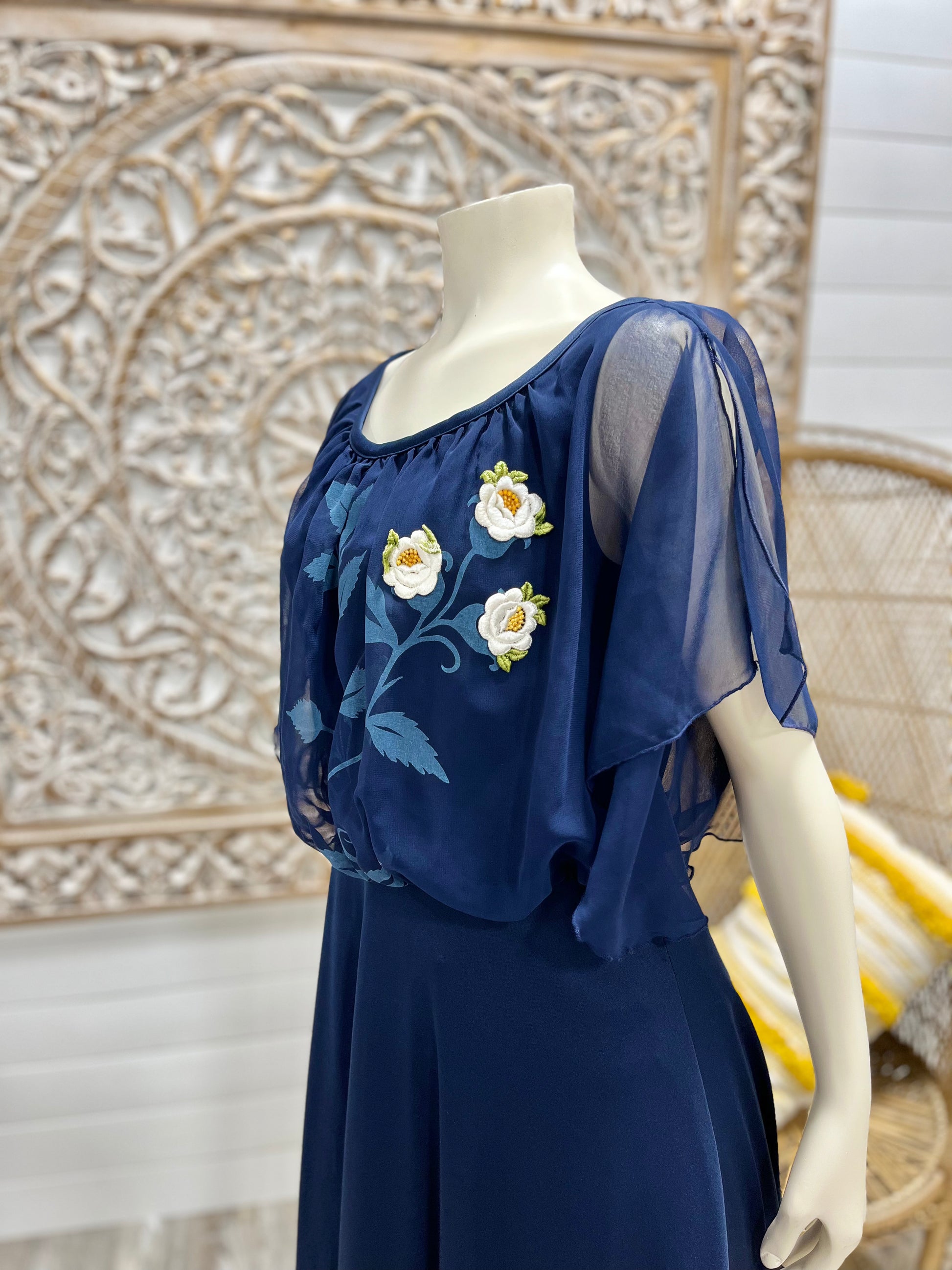 70s Floral Vintage Flutter Sleeve Navy Blue Sheer Boho Dress