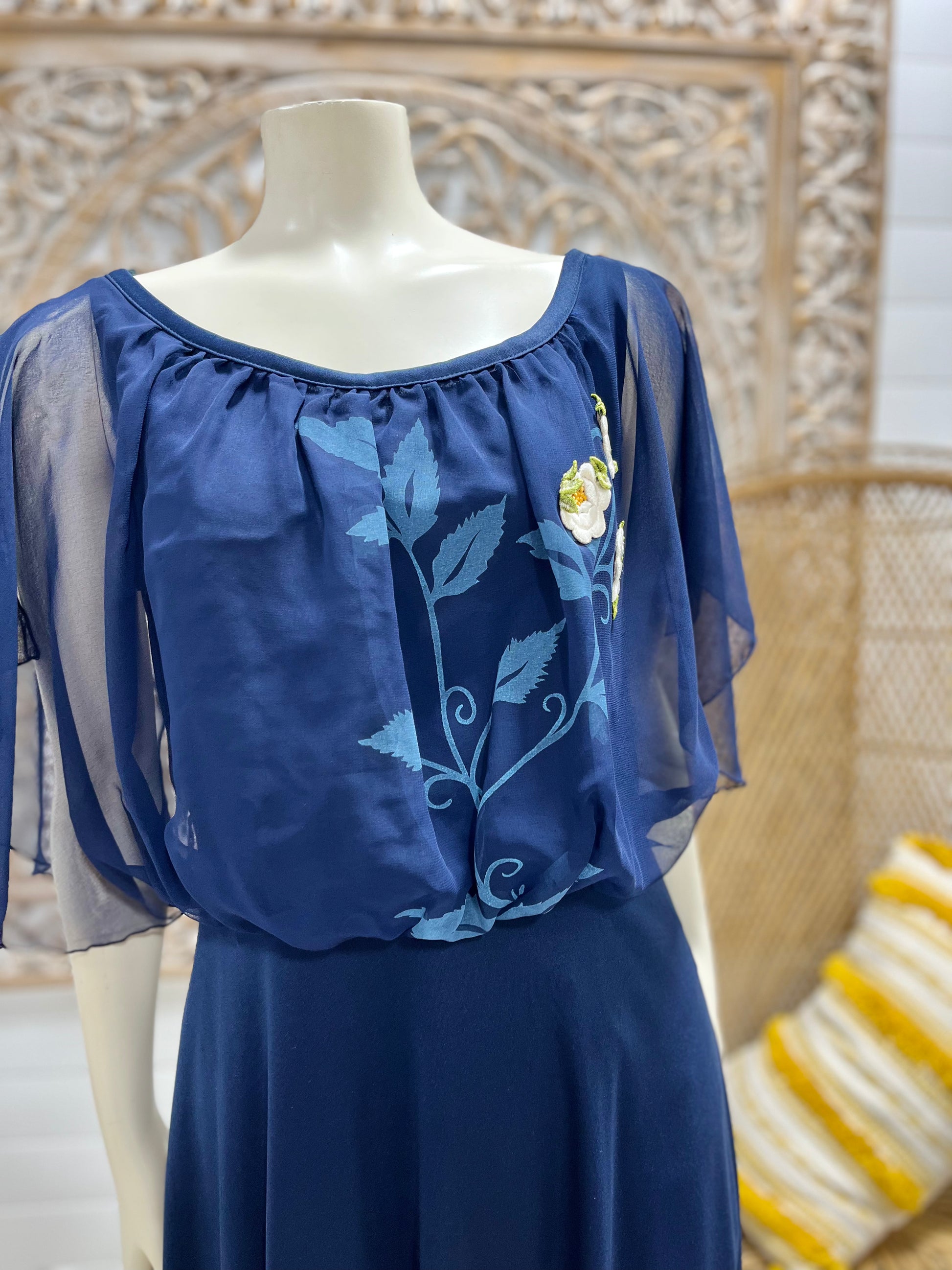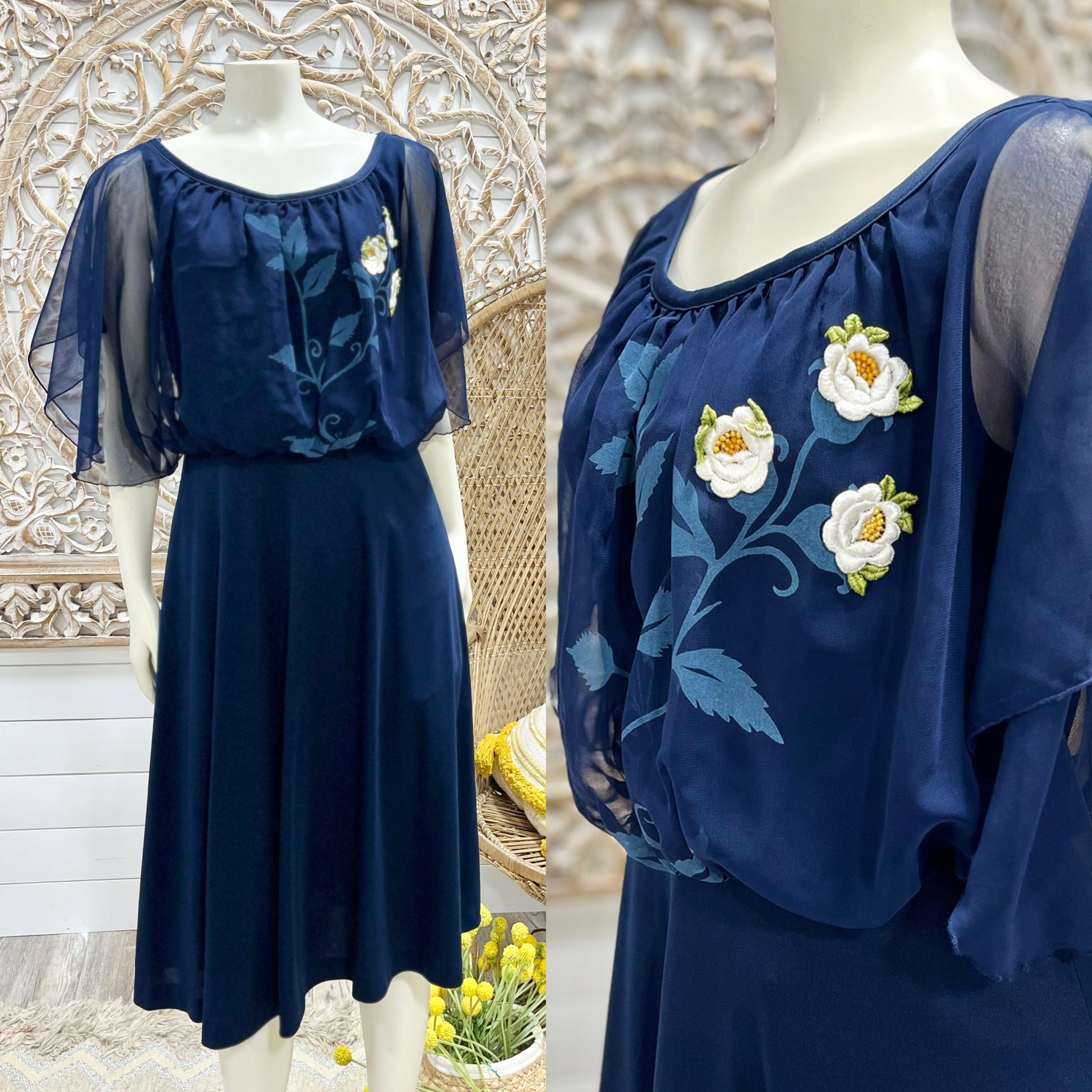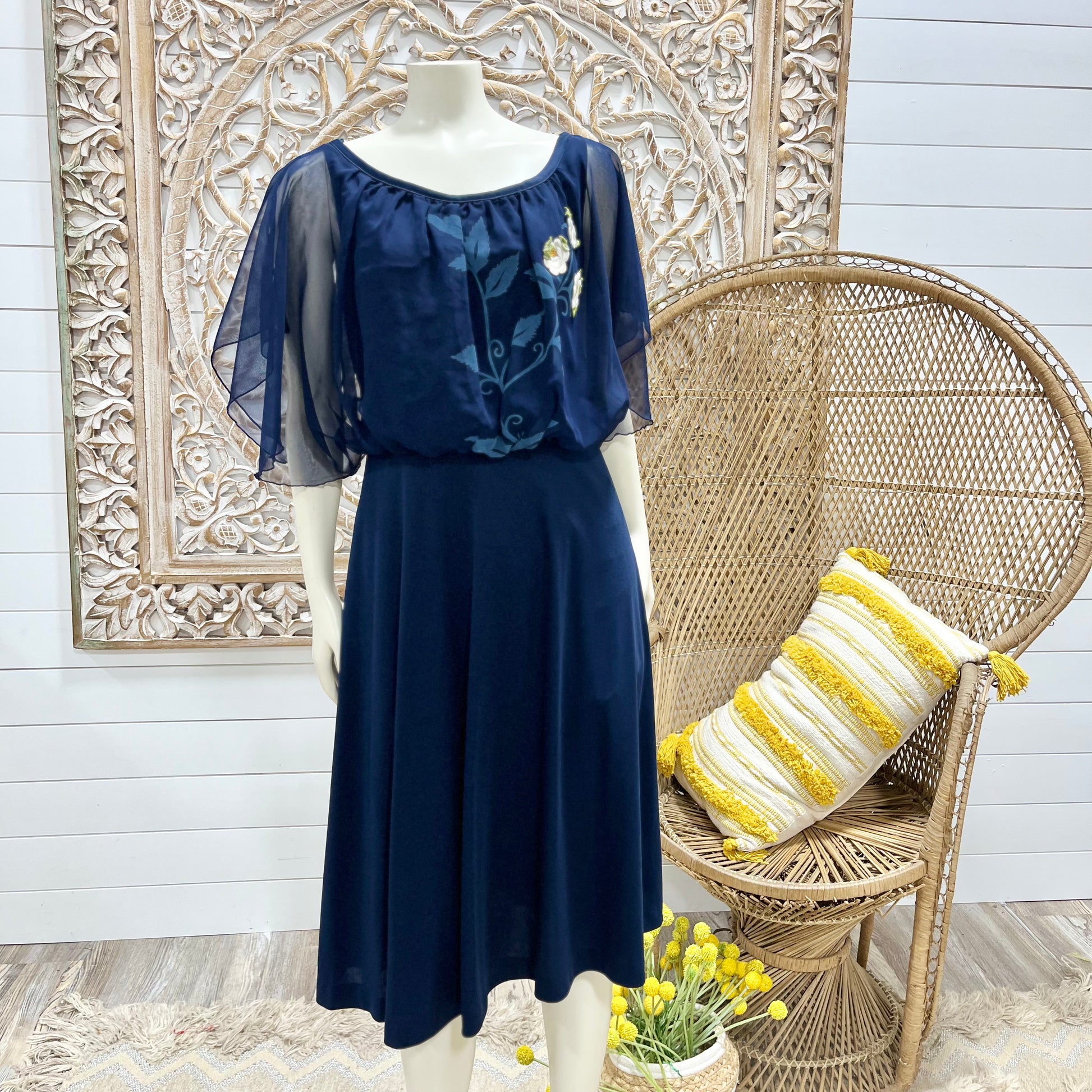 70s Floral Vintage Flutter Sleeve Navy Blue Sheer Boho Midi Dress M