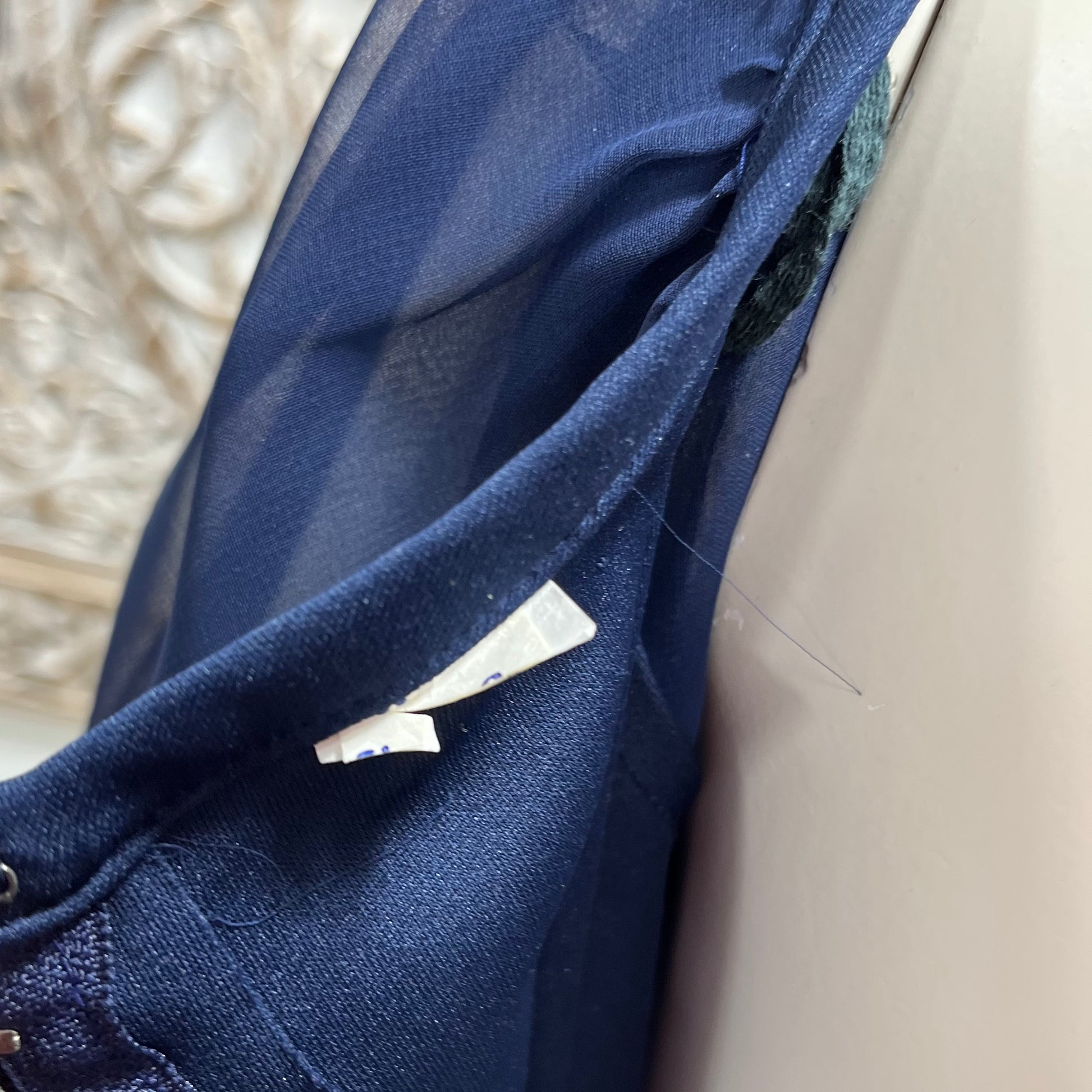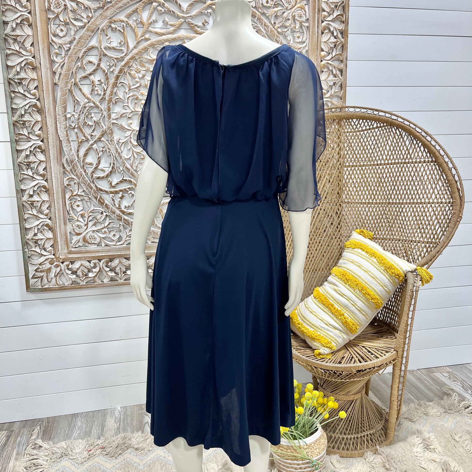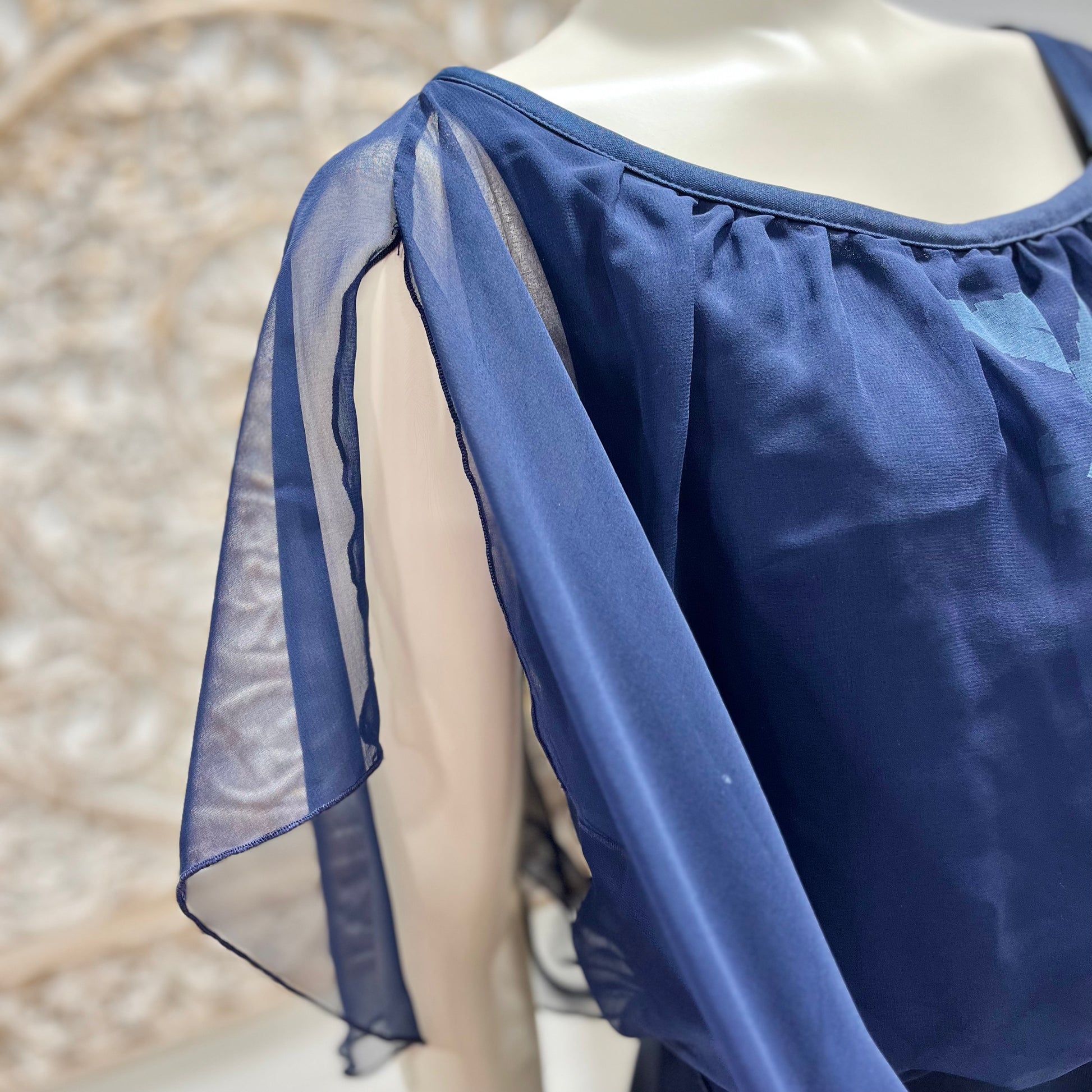 70s Floral Vintage Flutter Sleeve Navy Blue Sheer Boho Midi Dress M