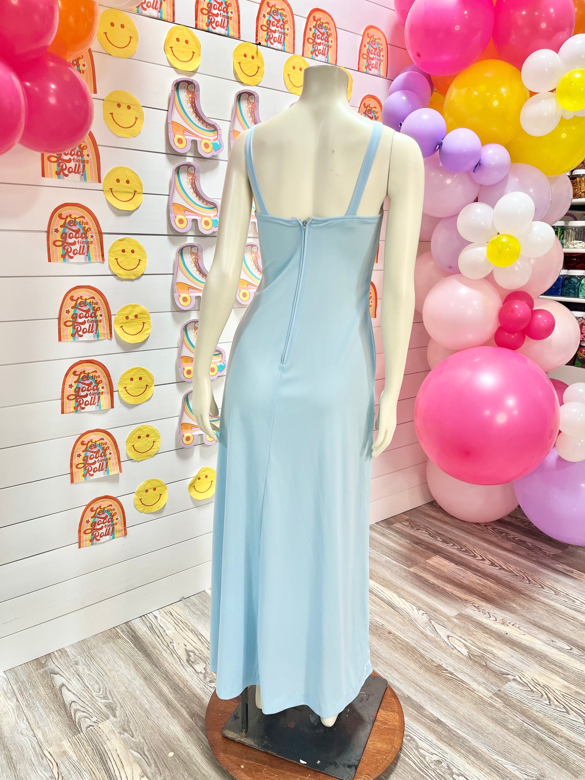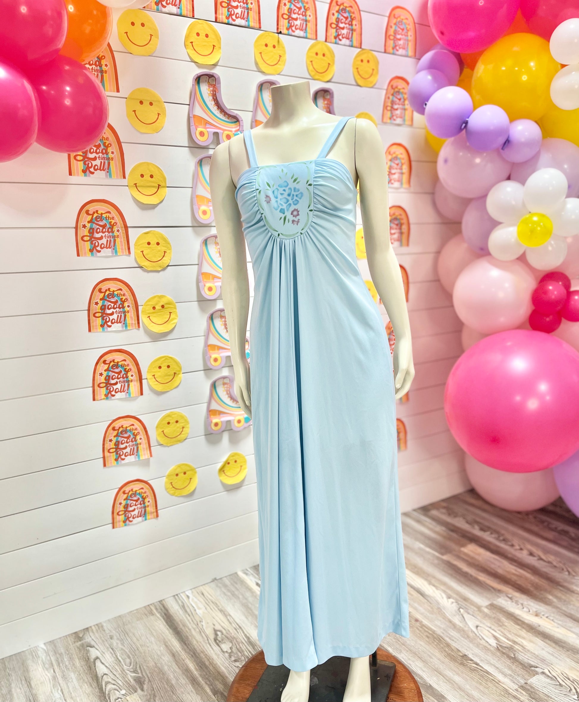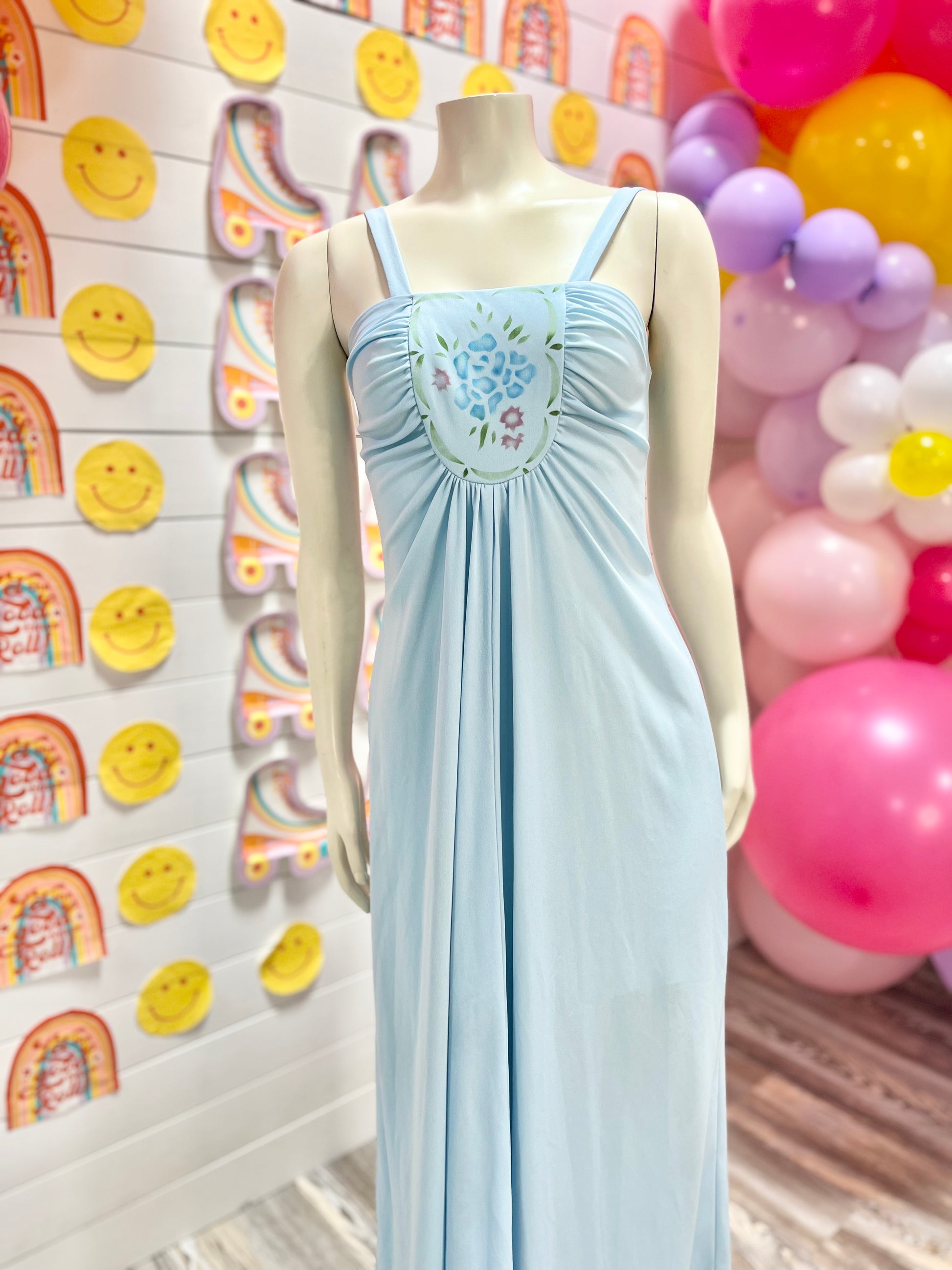 70s Floral Mosaic Gathered Bust Baby Blue Vintage Maxi Dress