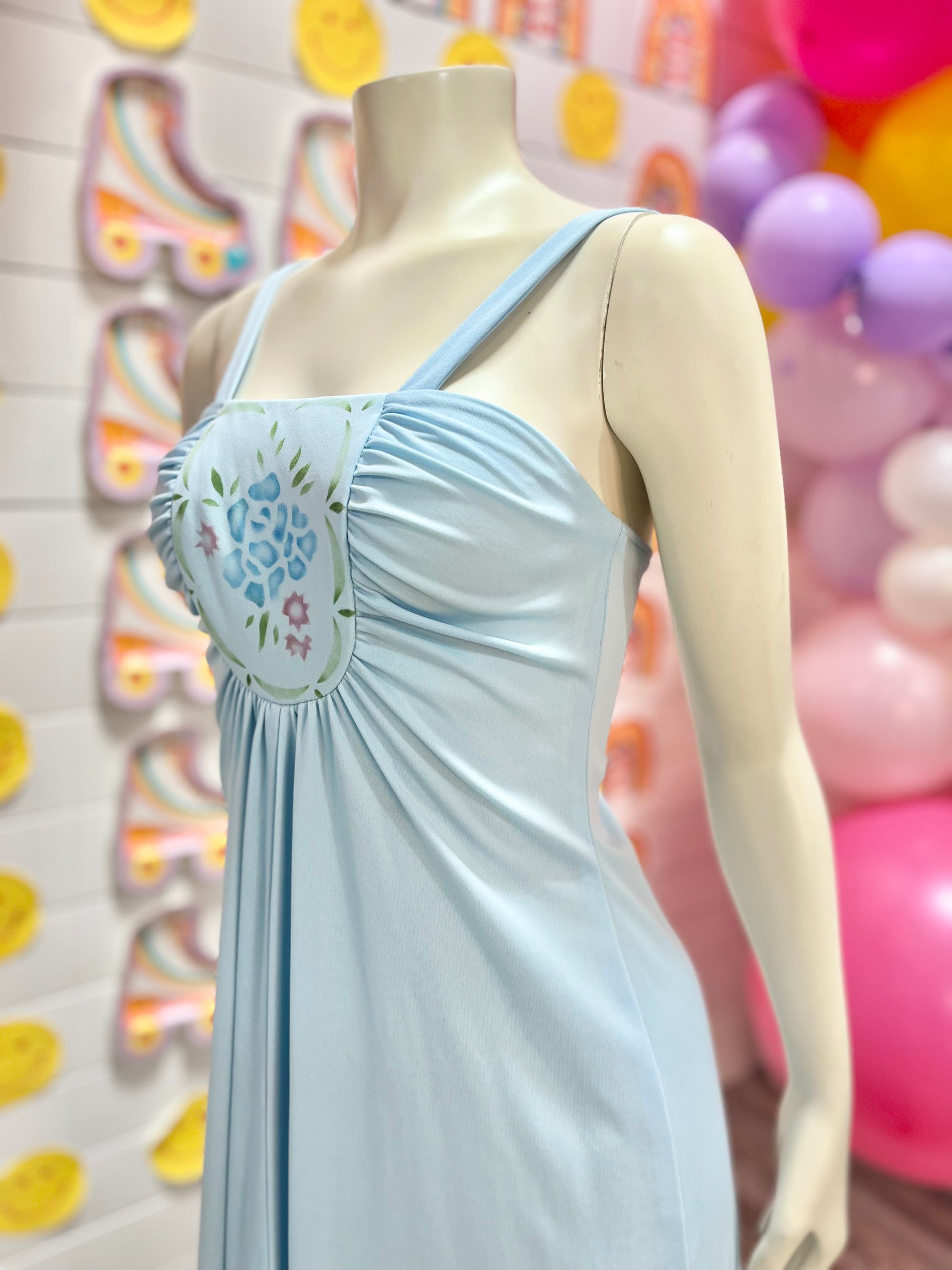 70s Floral Mosaic Gathered Bust Baby Blue Vintage Maxi Dress XS