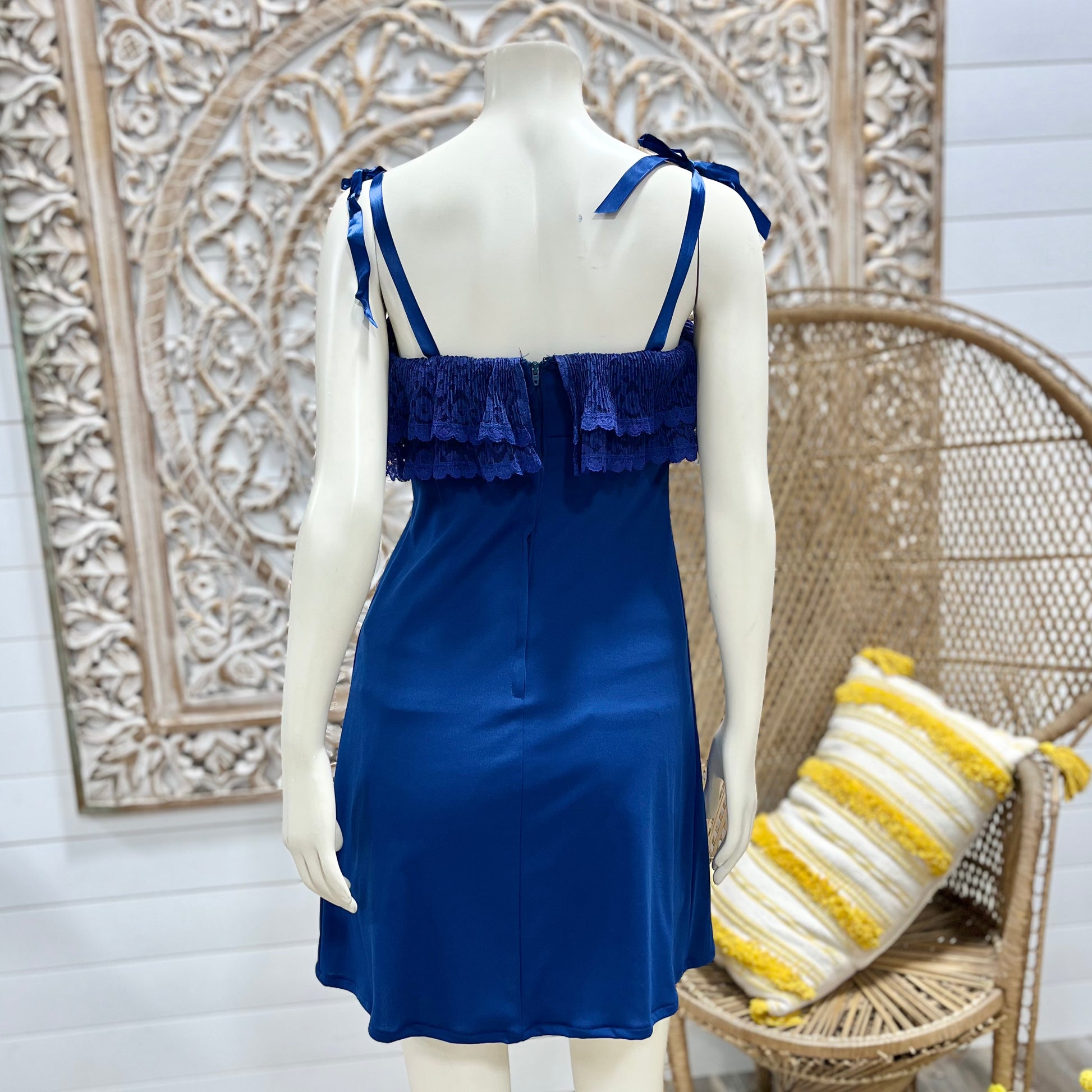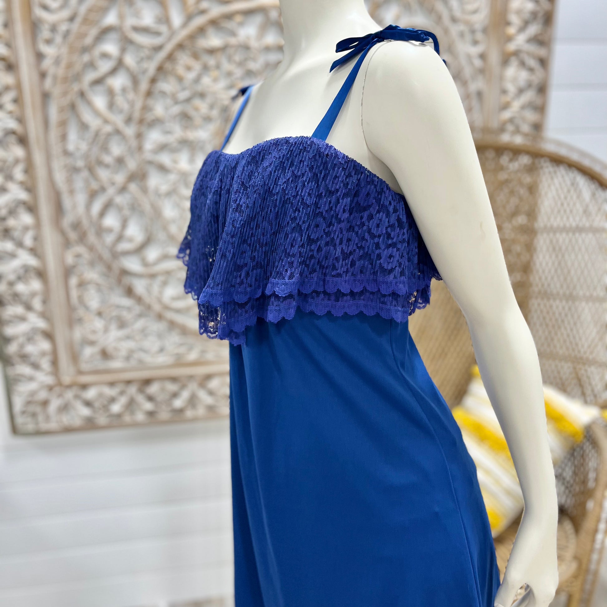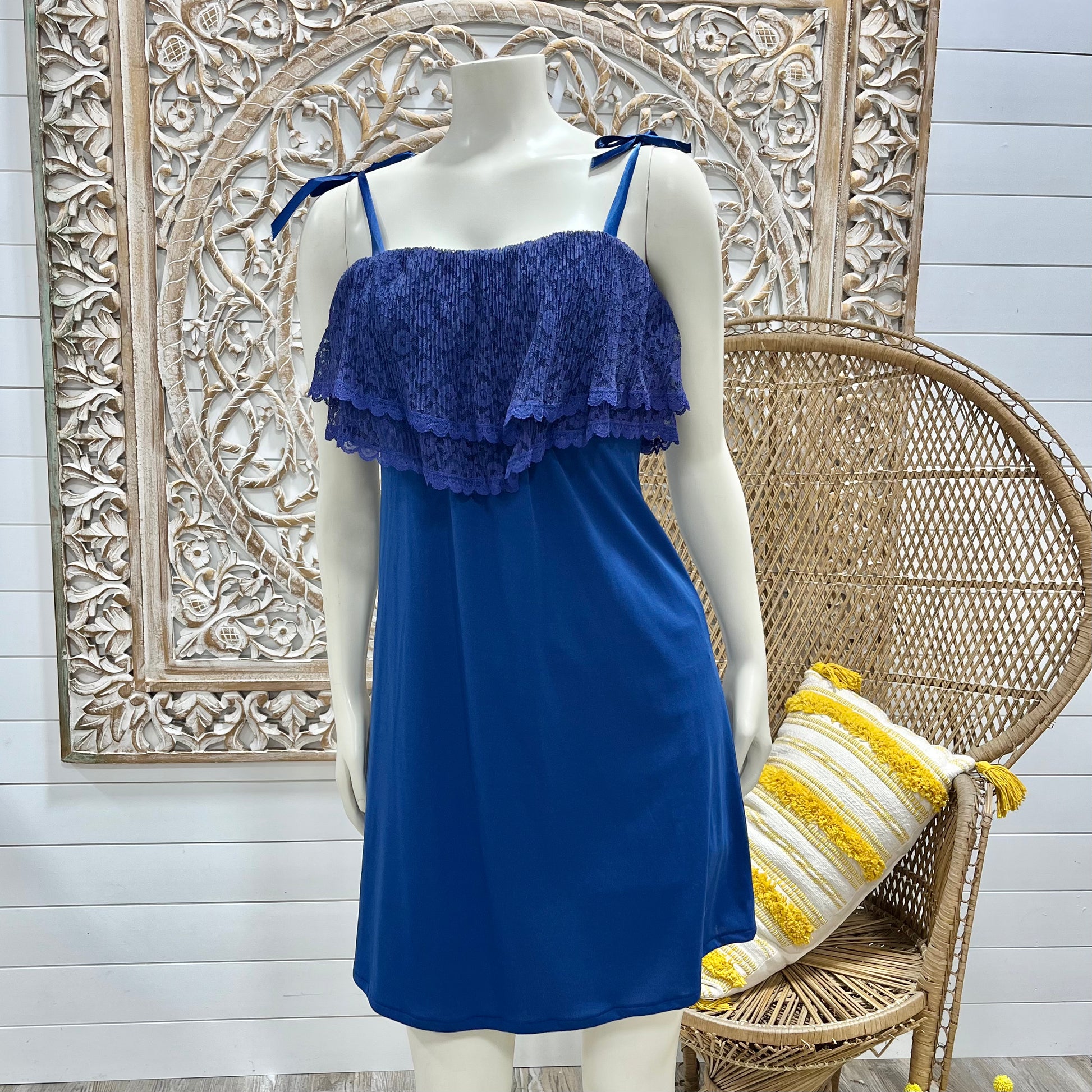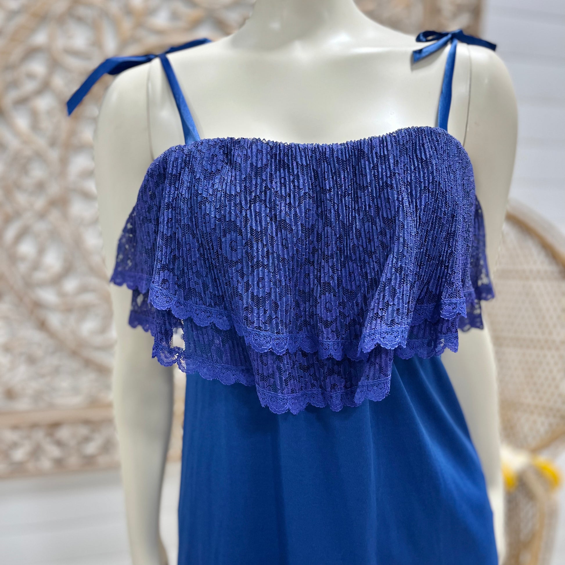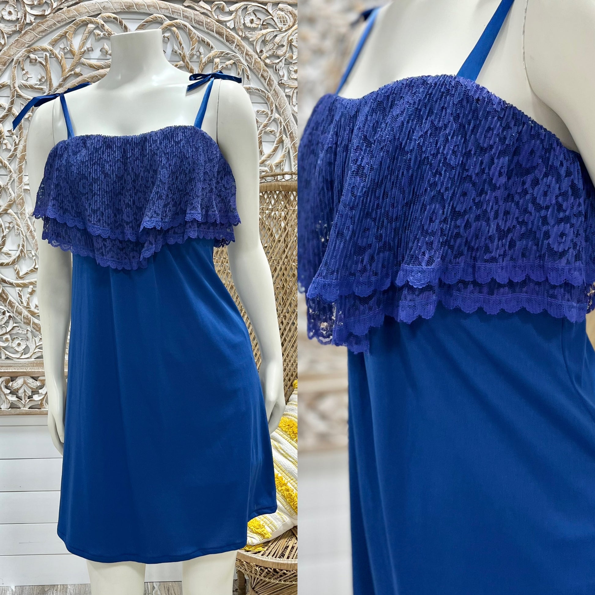 70s Pleated Lace Sexy Blue Empire Mini Vintage Dress XS/S