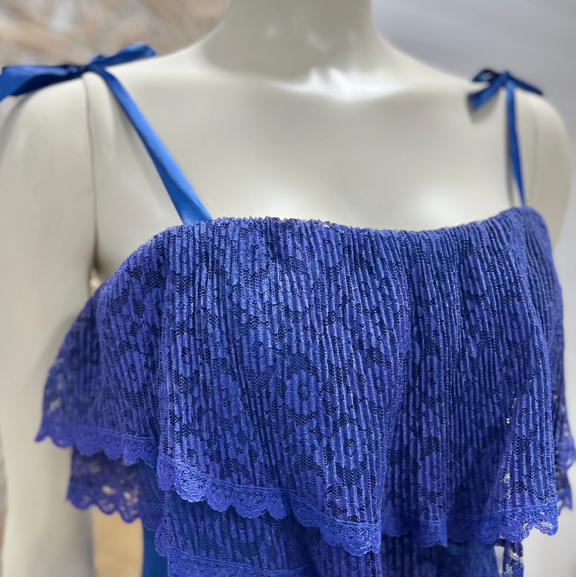 70s Pleated Lace Sexy Blue Empire Mini Vintage Dress