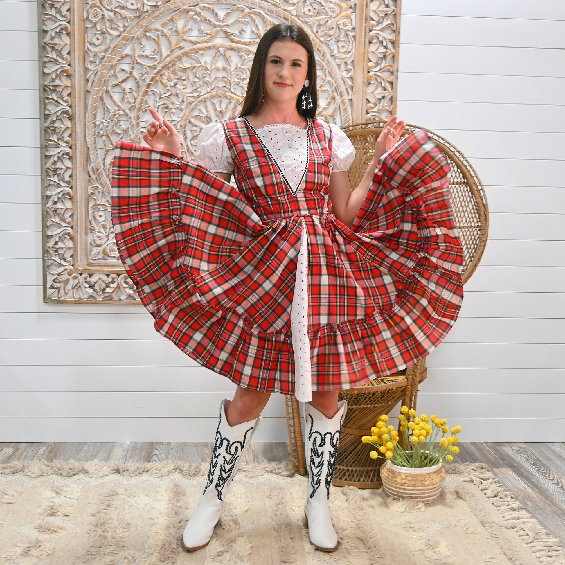 Plaid Mini Dress Western Rodeo 1970s Lace Puff Sleeves Vintage S