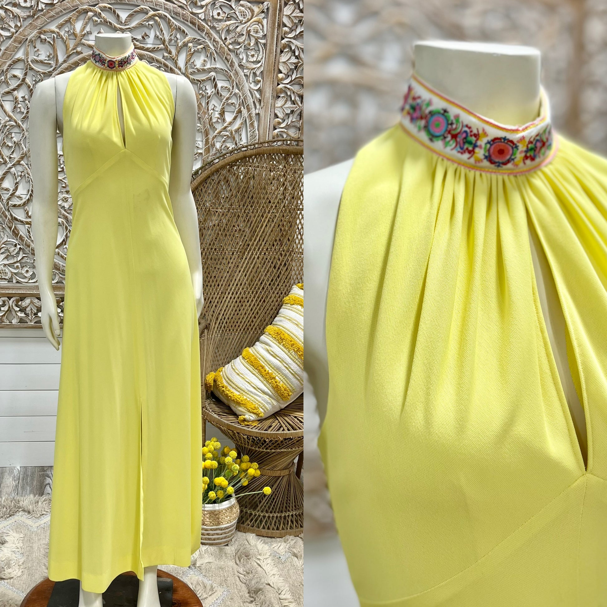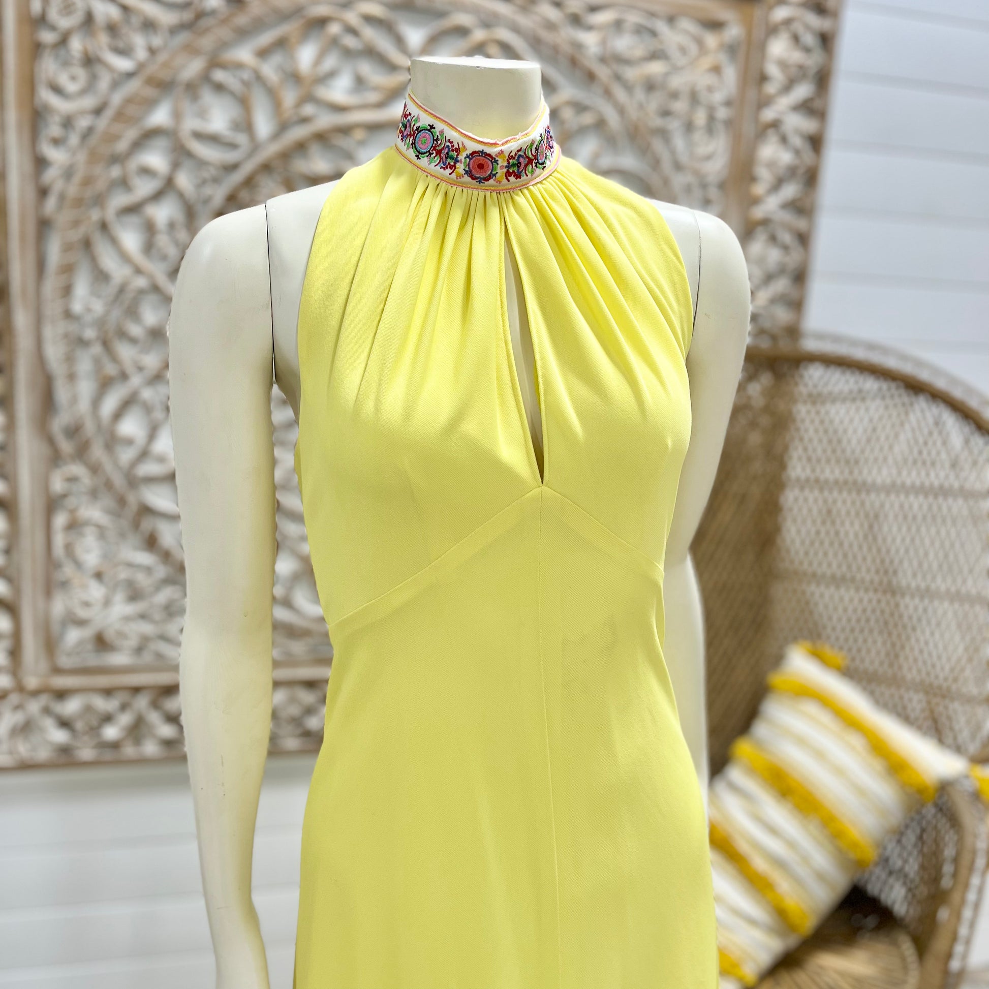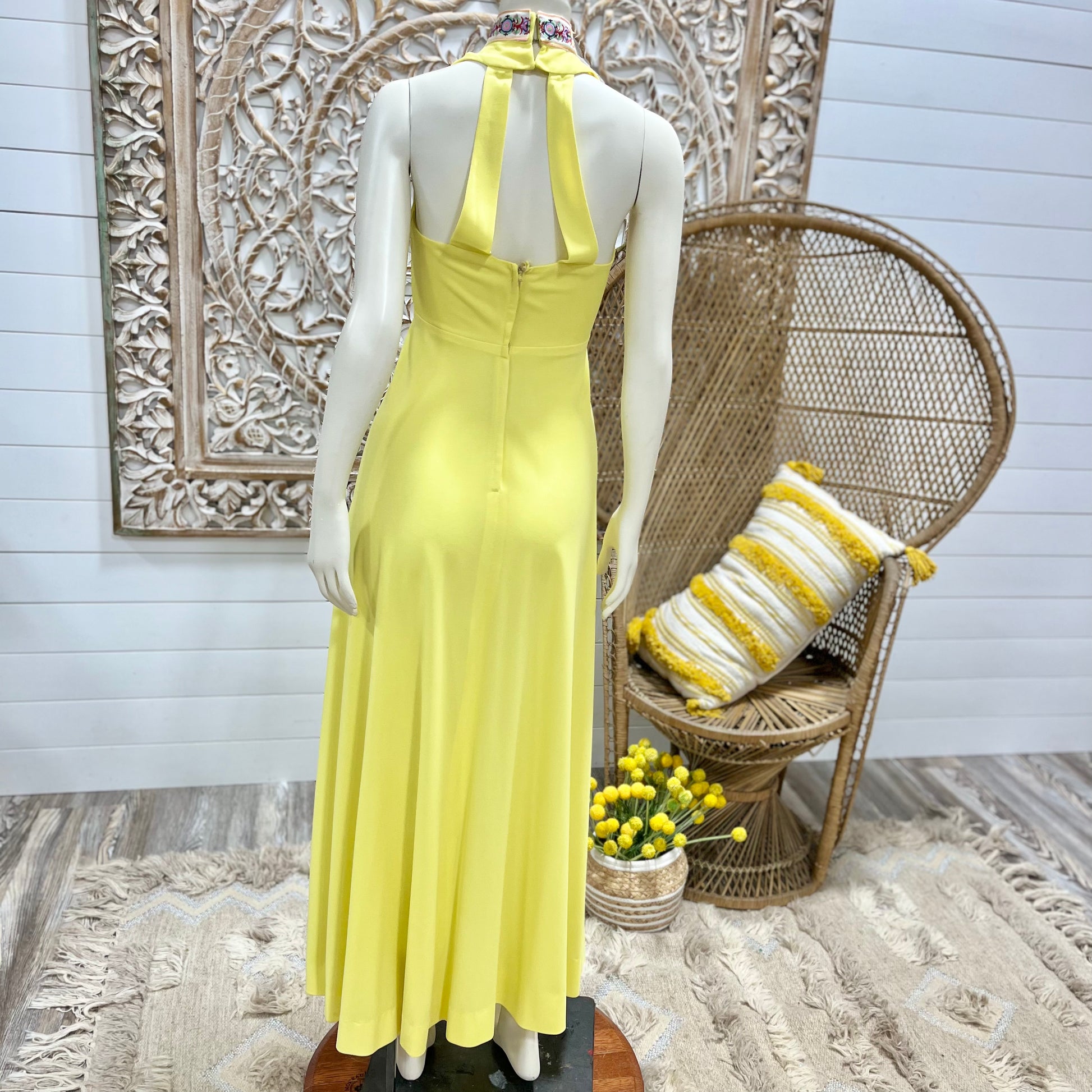 70s Sexy Yellow High Collar Jacquard Halter Hippie Vintage Maxi Dress