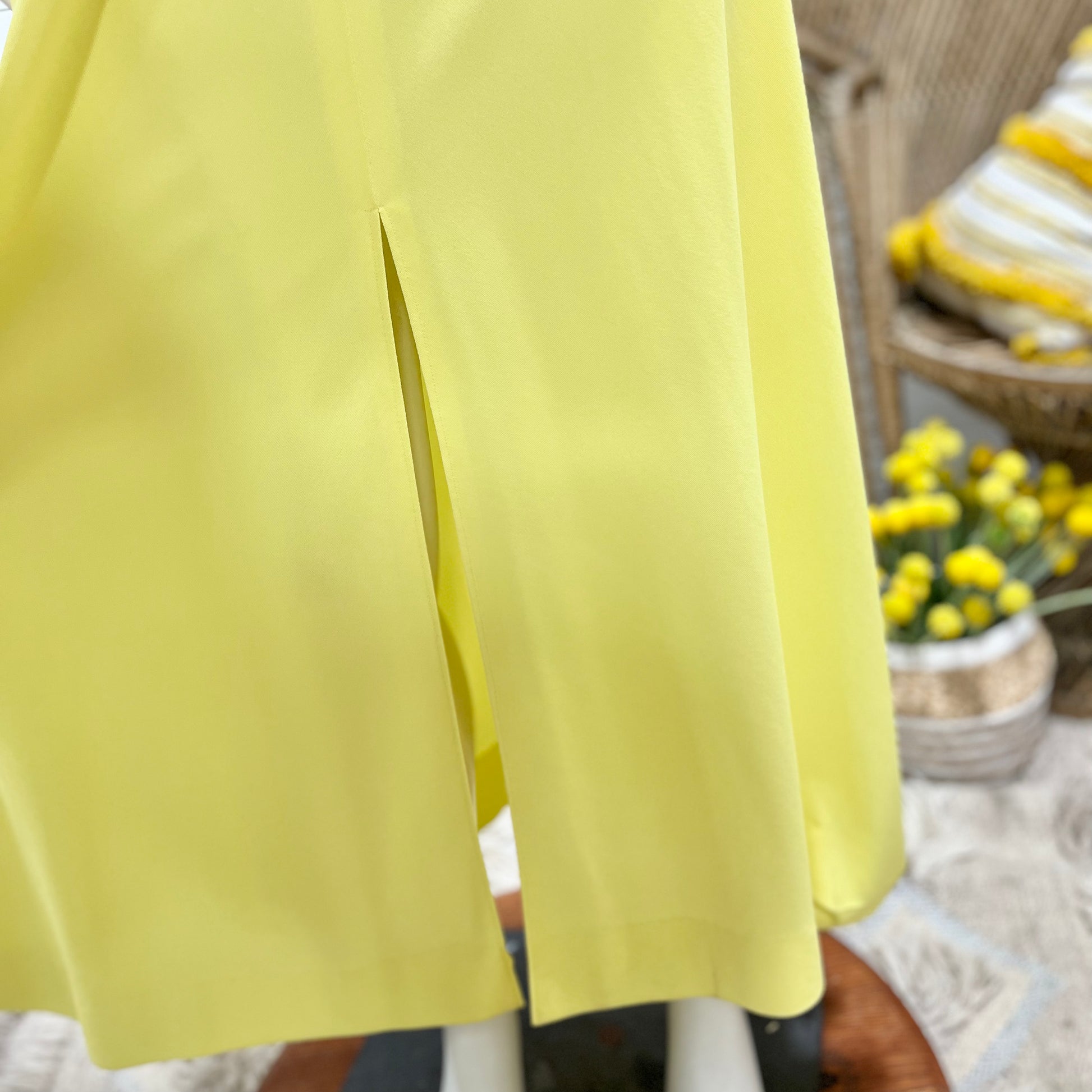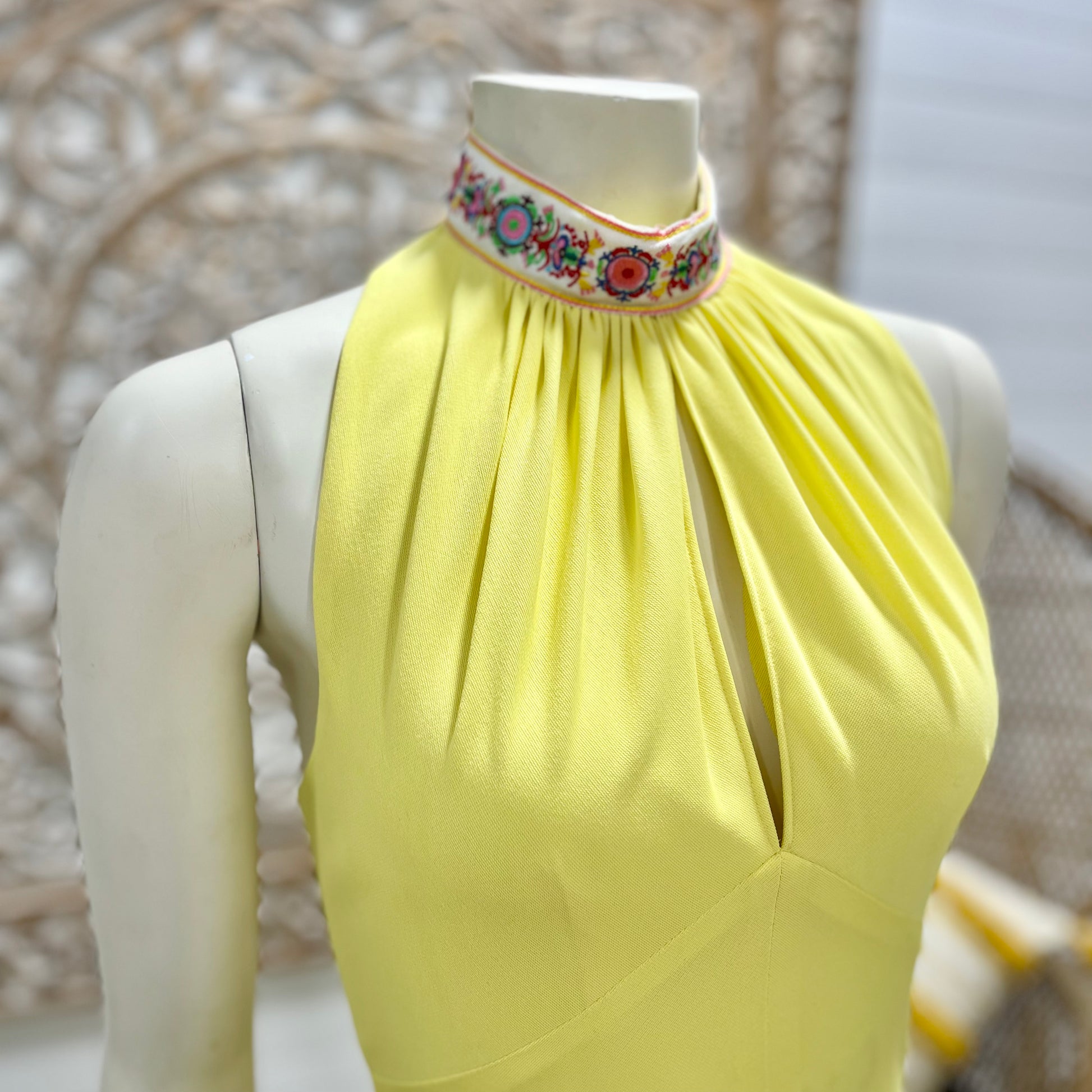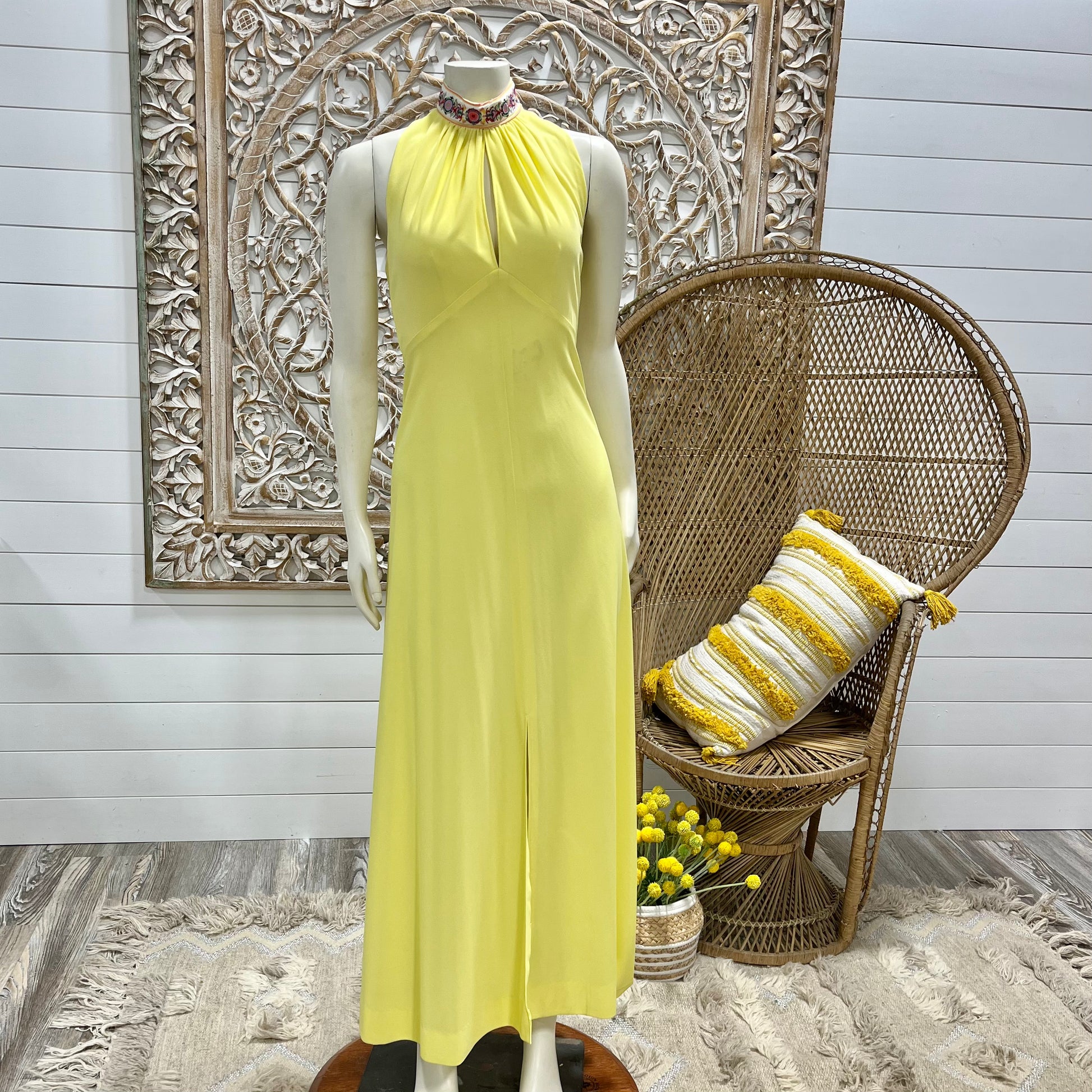 70s Sexy Yellow High Collar Jacquard Halter Hippie Vintage Maxi Dress