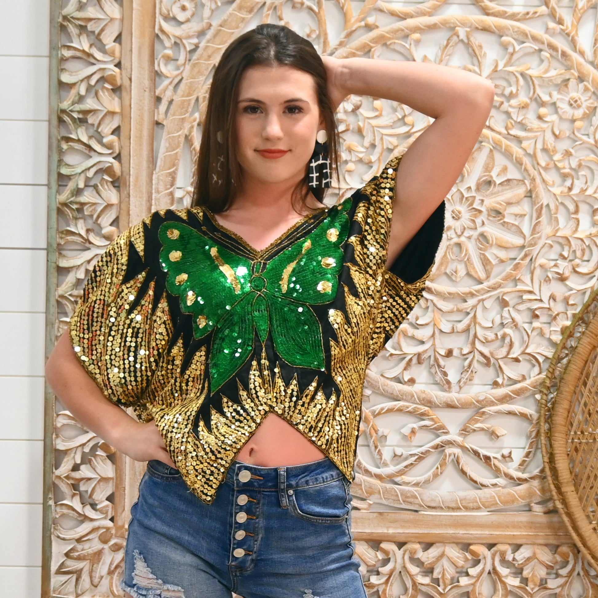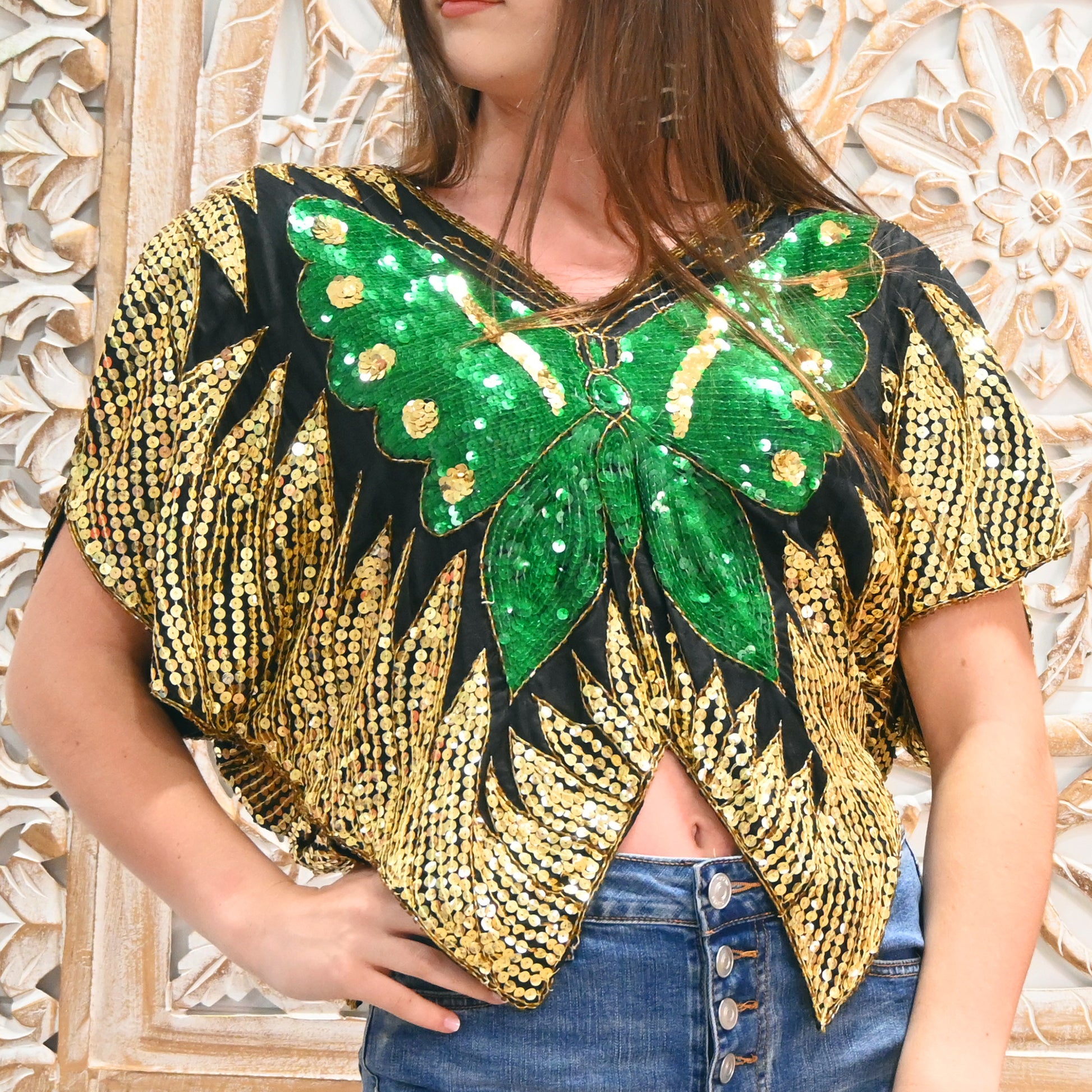 70s Vintage Emerald Gold Butterfly Sequin and Silk Shirt