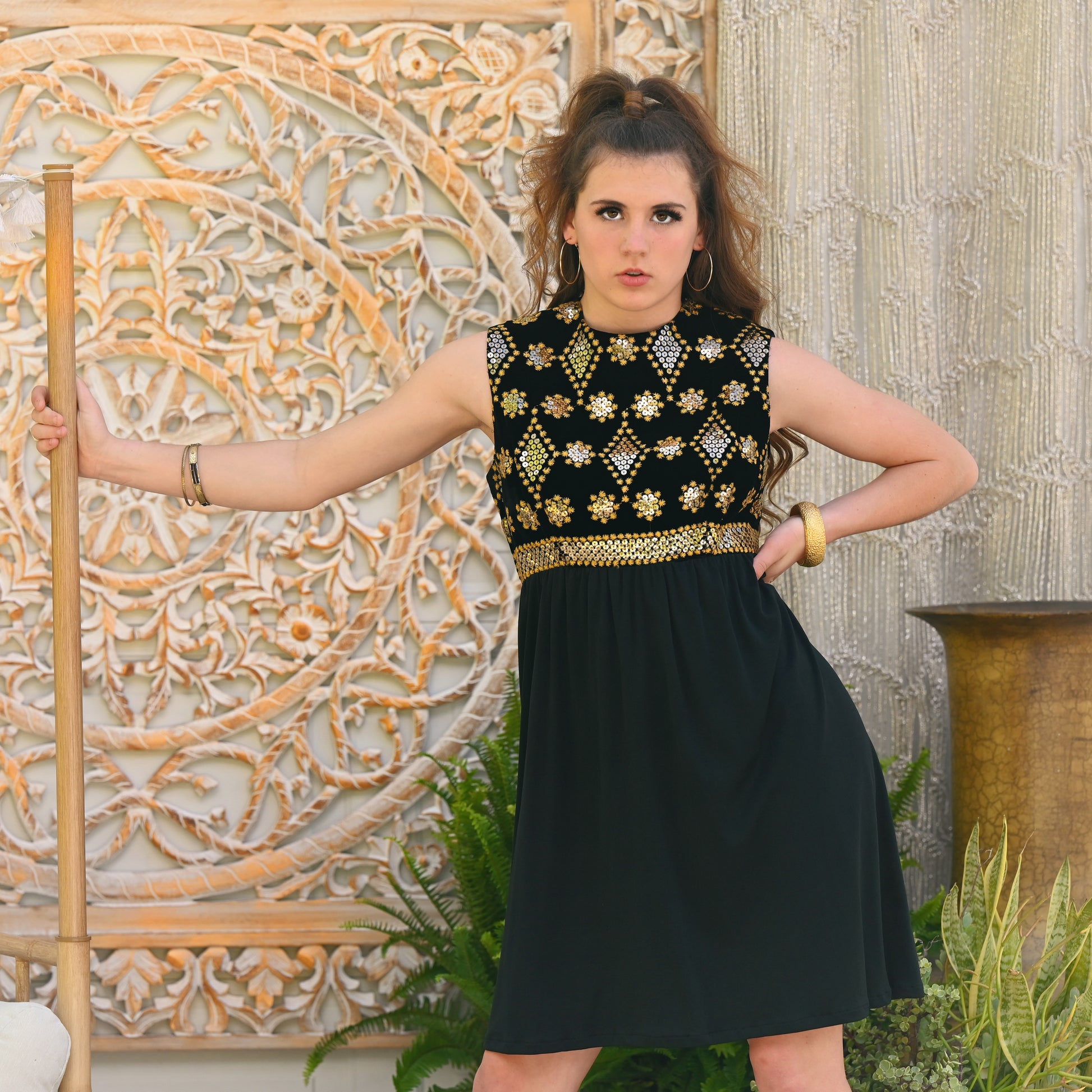 70s Vintage Gold Metallic Sequin Diamonds Empire Mini Dress