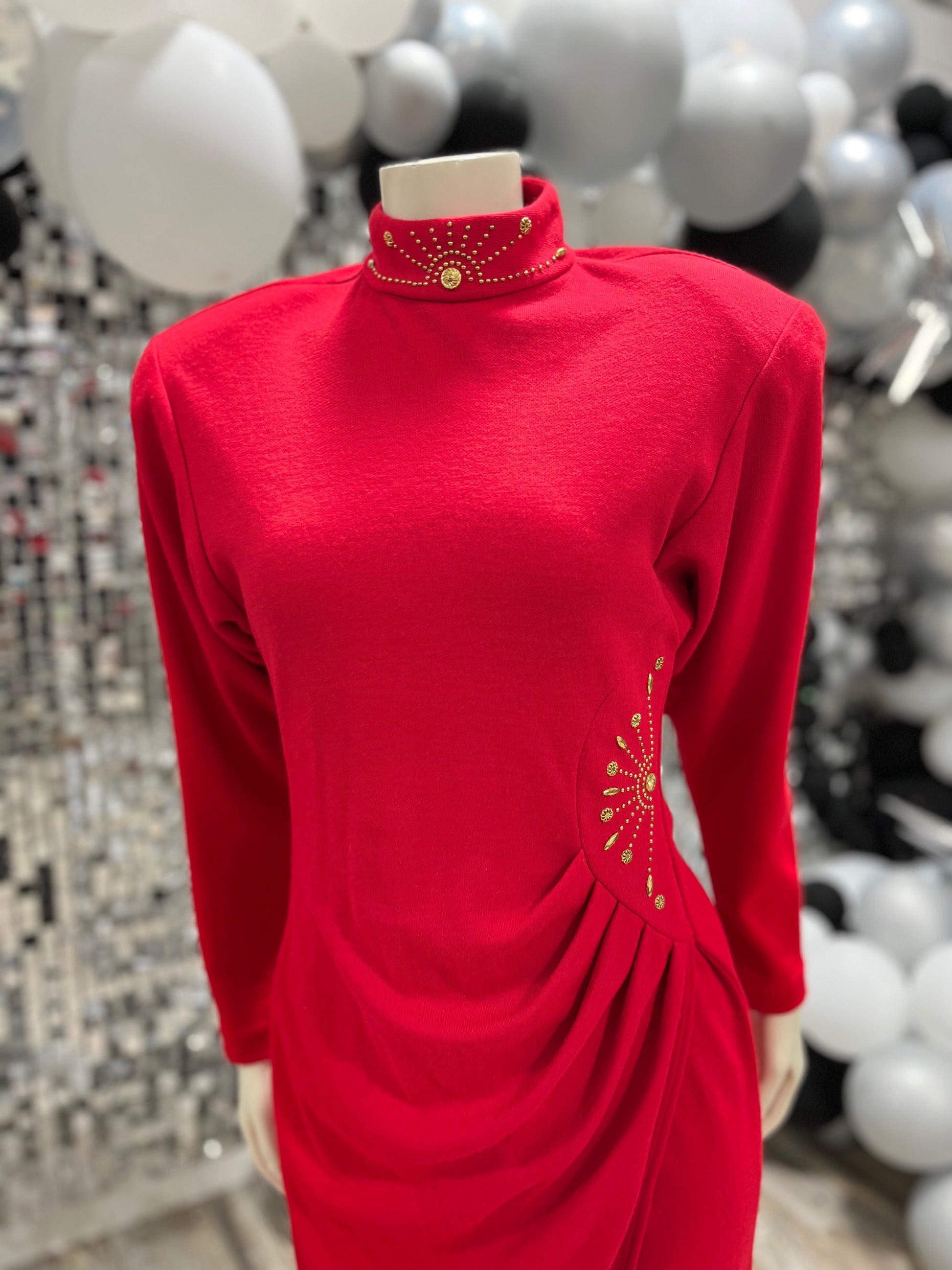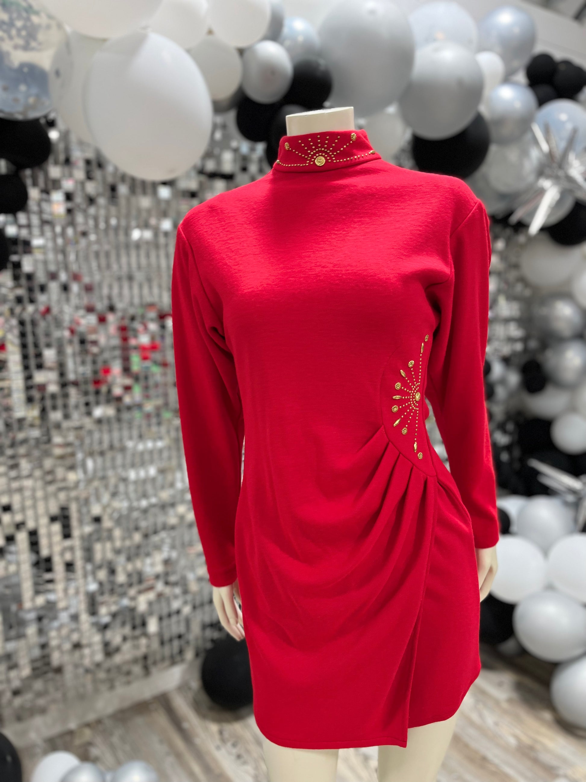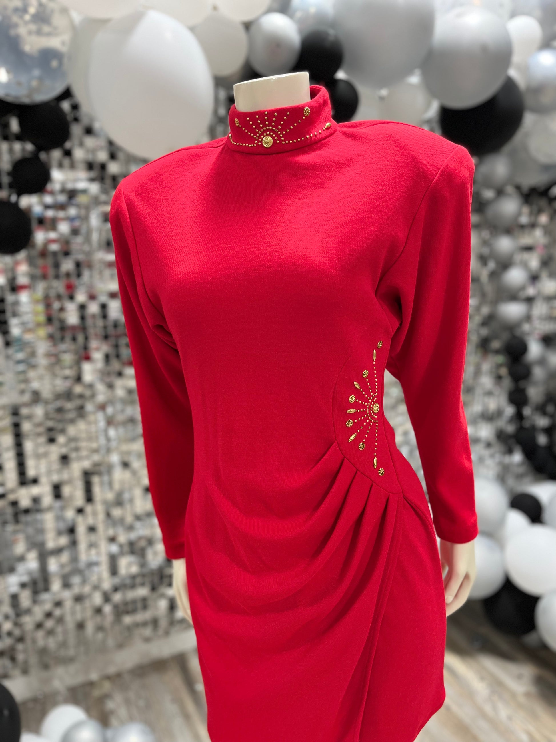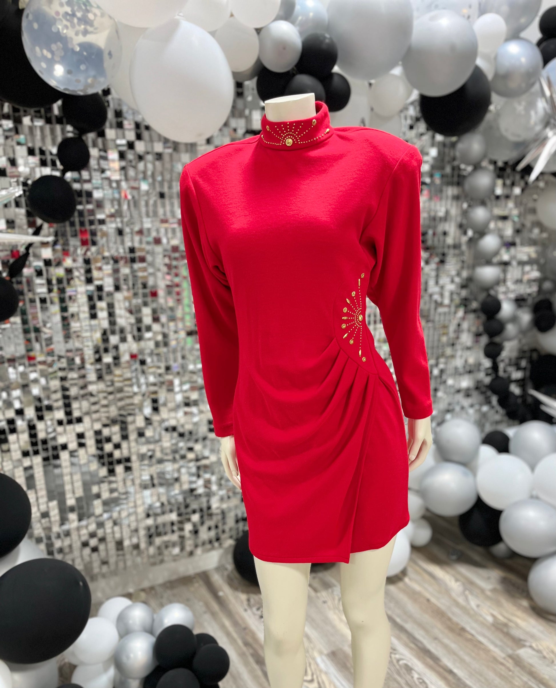 Vintage 80s Gold Studded Red Pleated Dawn Joy Mini Party Dress M