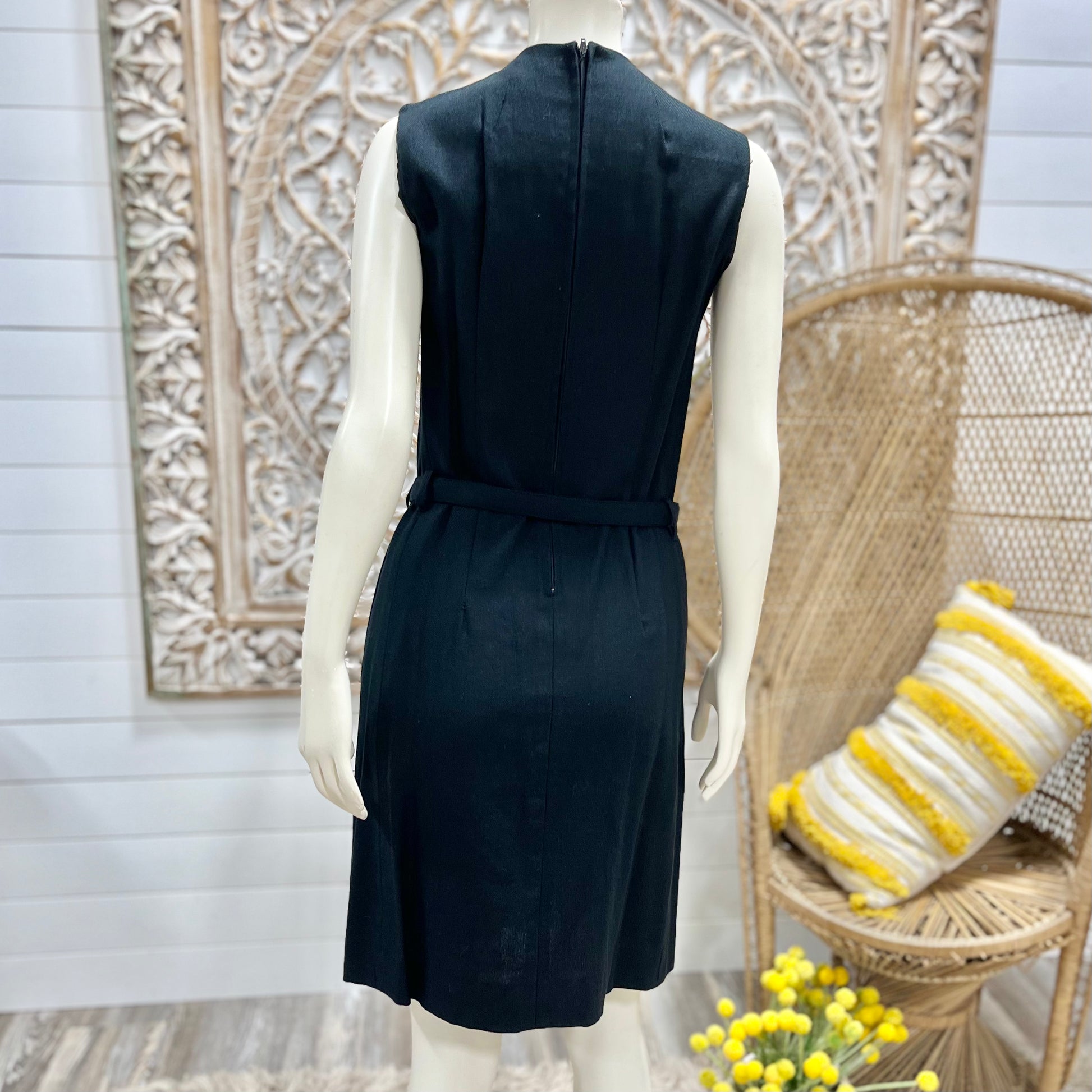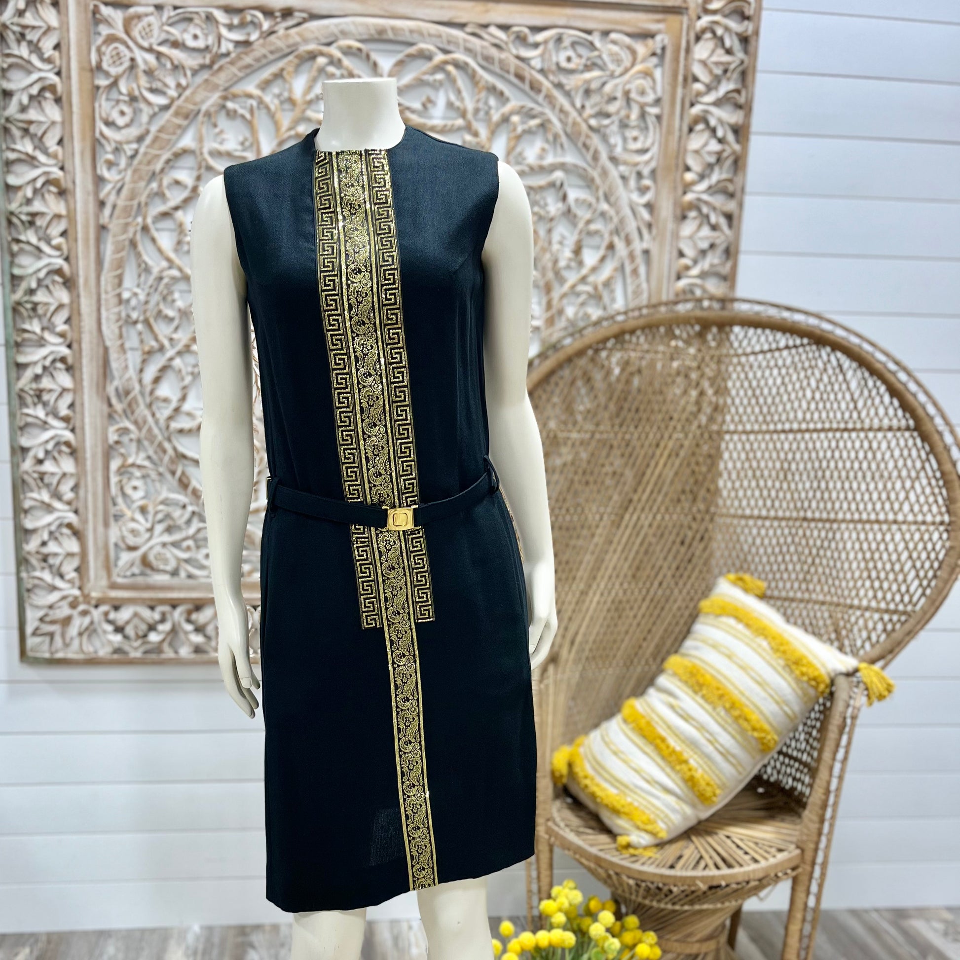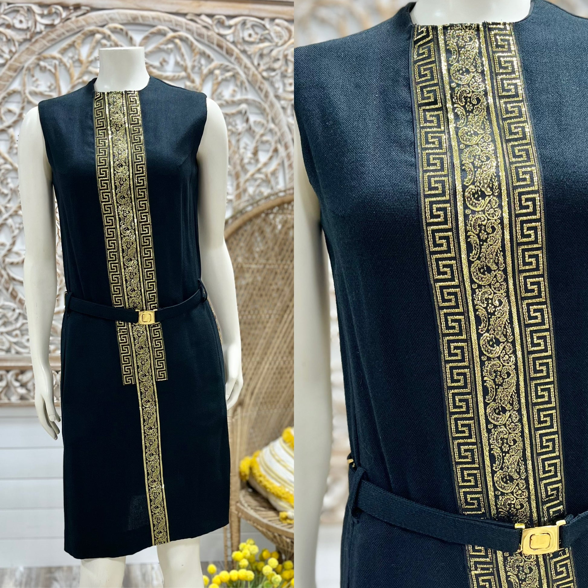 Vintage 1960s Mod Rosecrest Greek Key Black Gold Metallic Dress