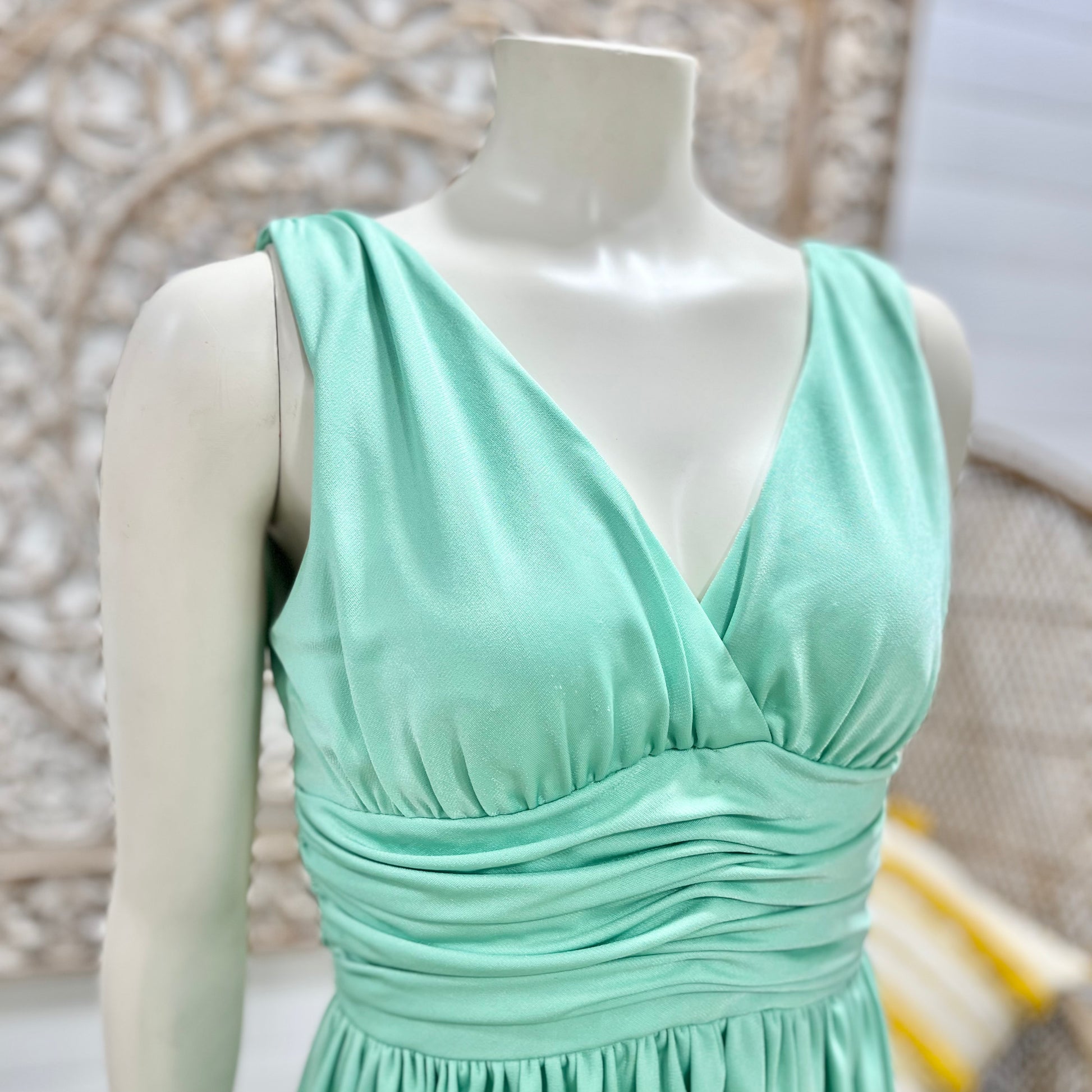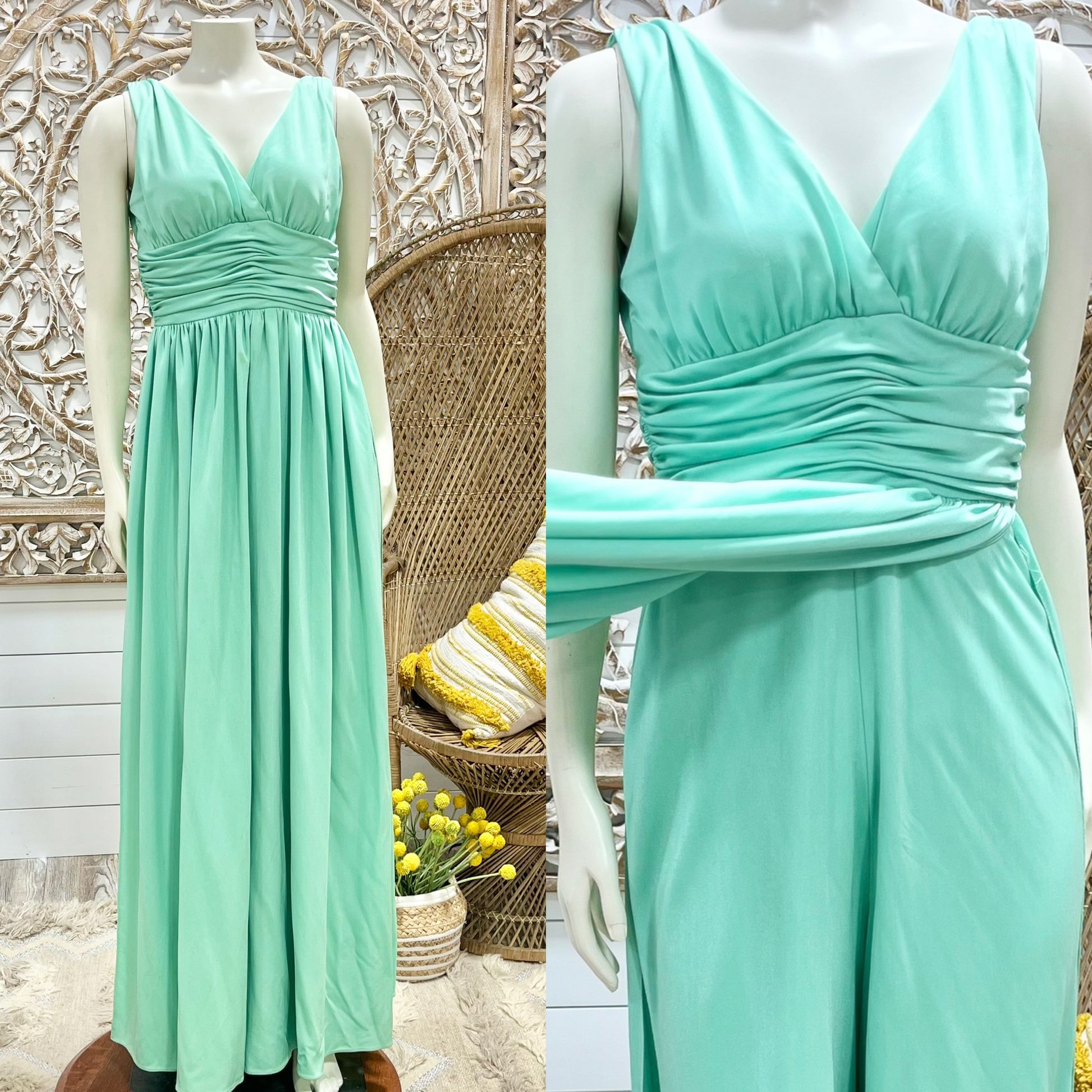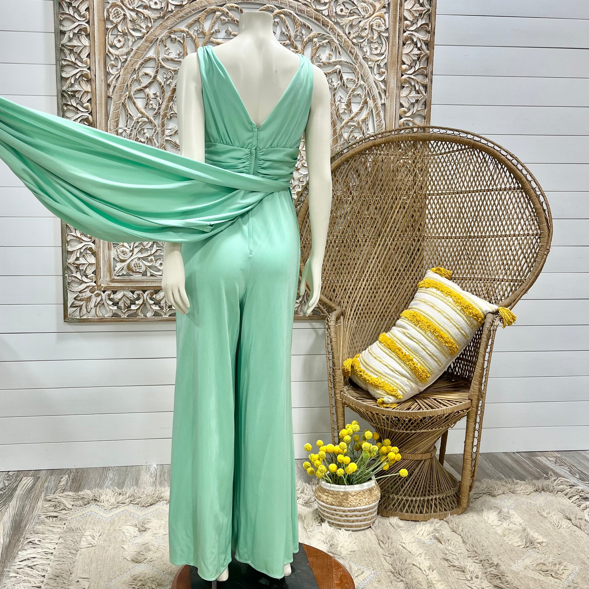 Vintage 70s Mint Green Ruched Cummerbund Dress Palazzo Jumpsuit S