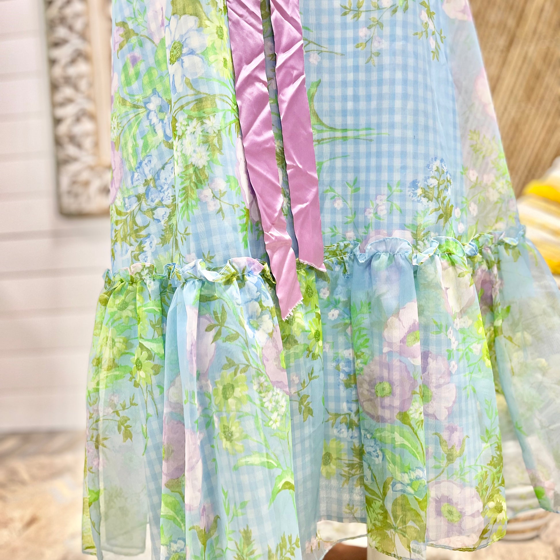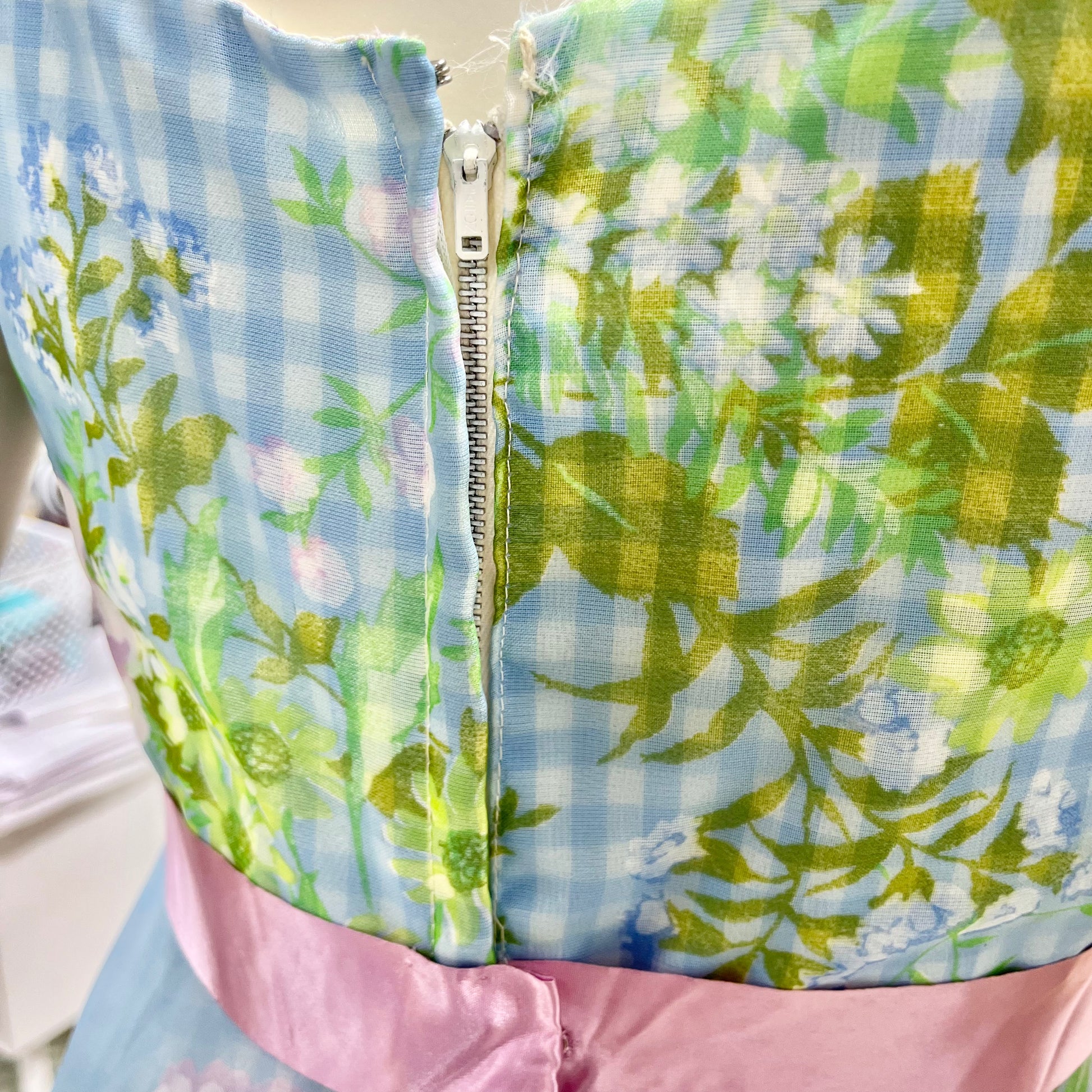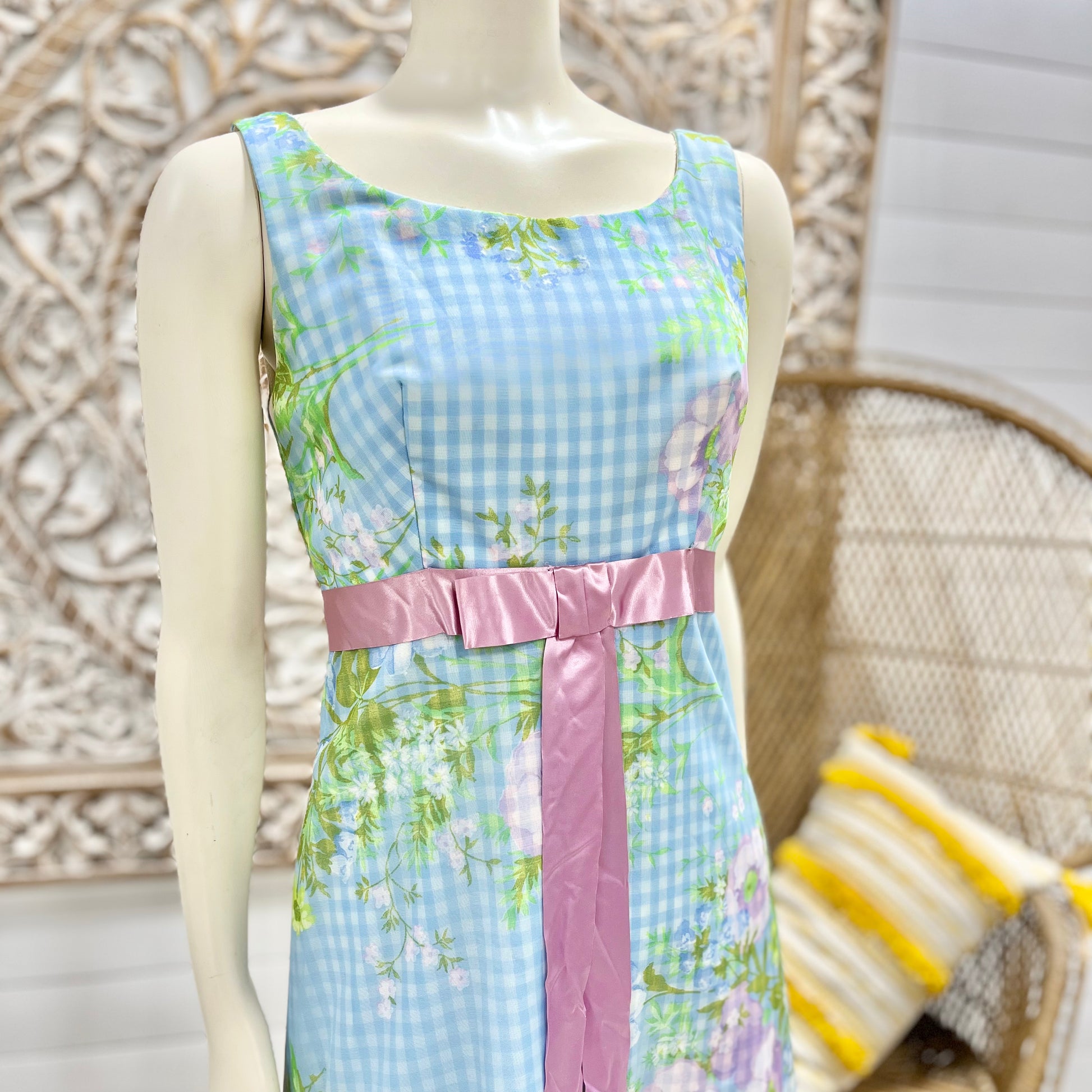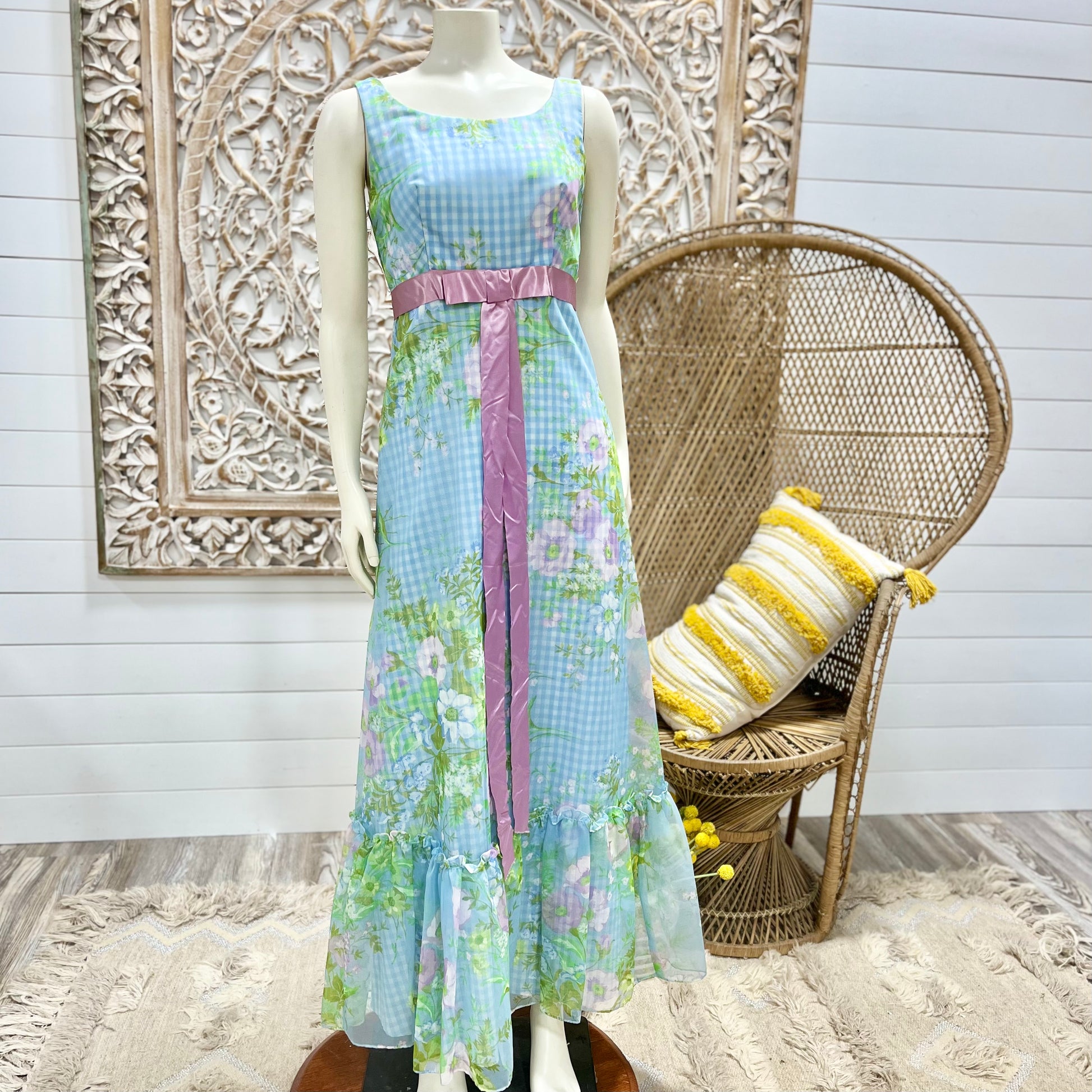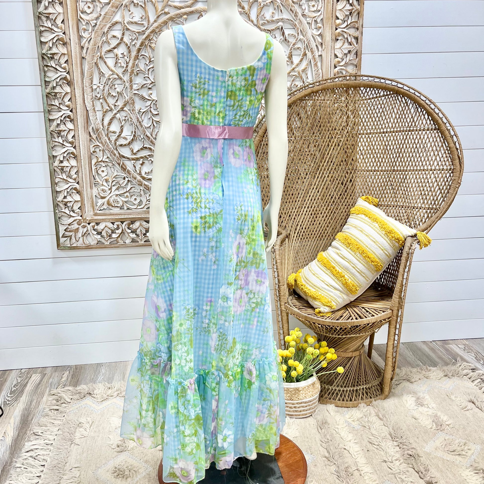 Vintage 60s Cotton Blue Gingham Cottage Core Floral Maxi Dress S
