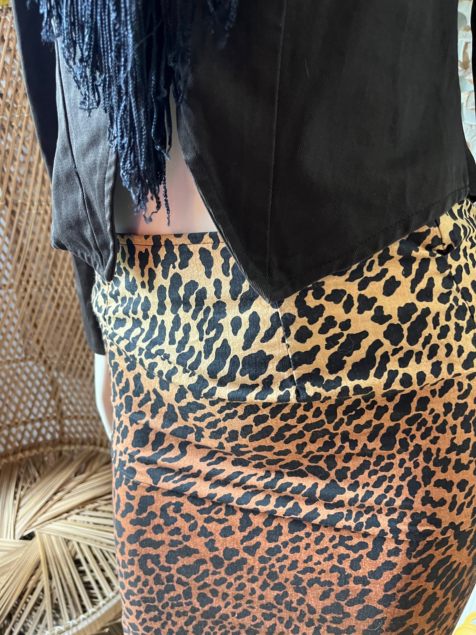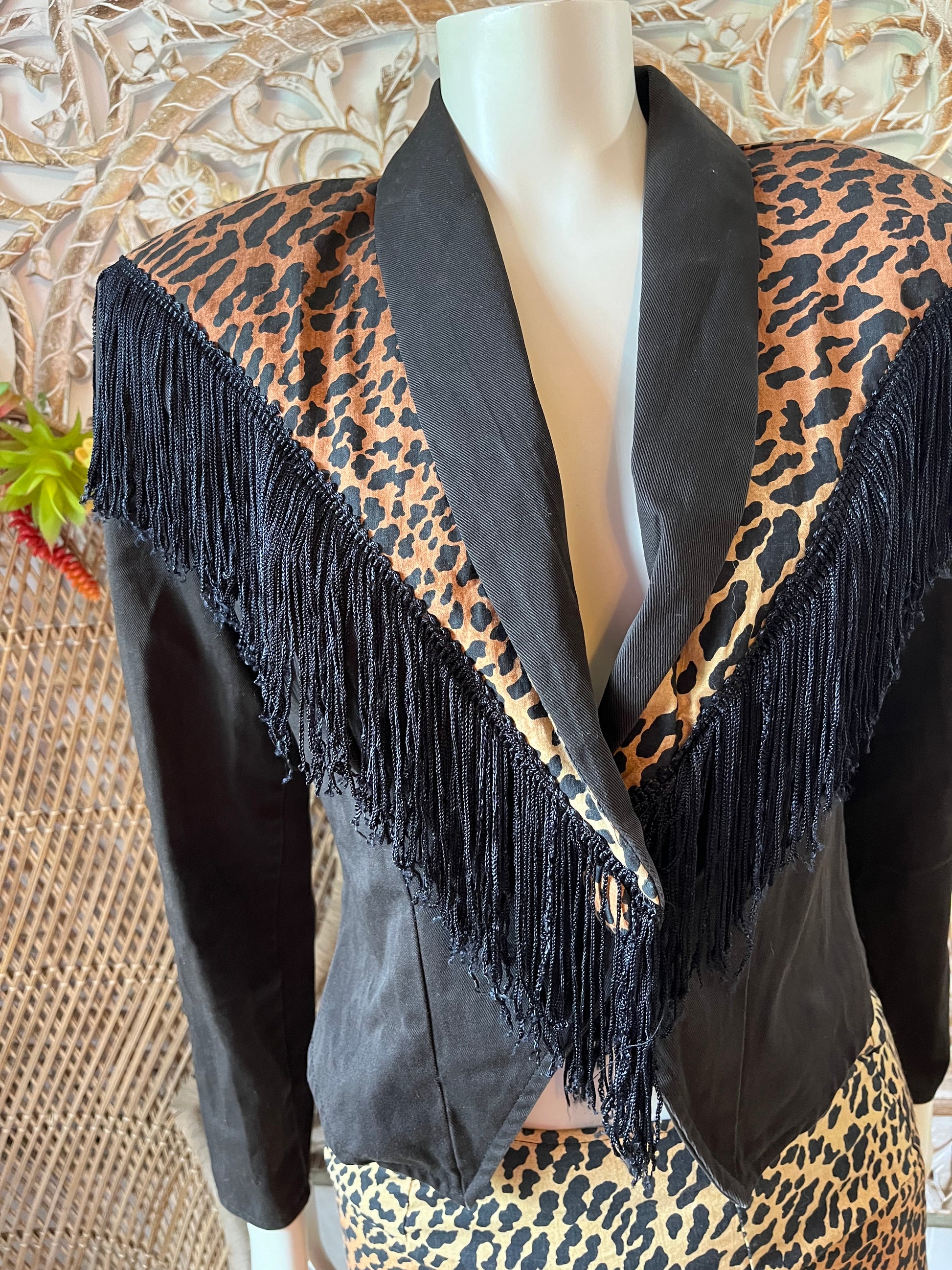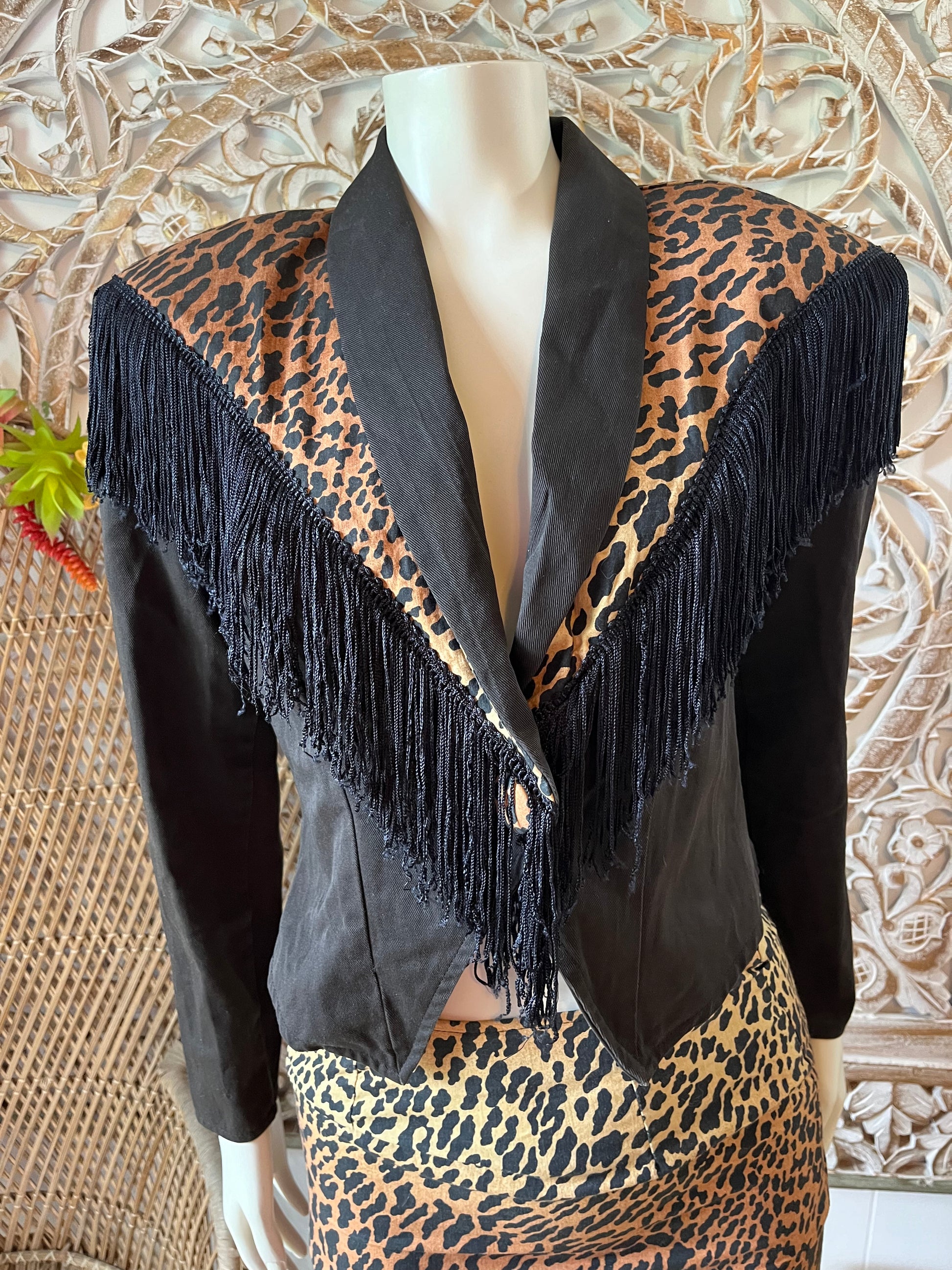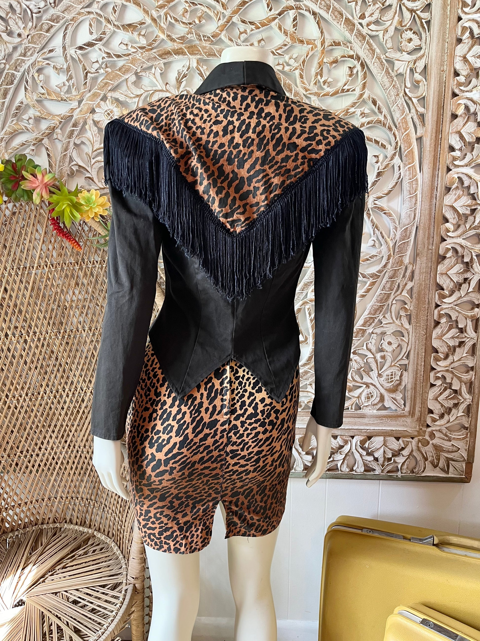 Vintage 80s Fredrick’s of Hollywood Leopard Print Fringe Jacket and Skirt