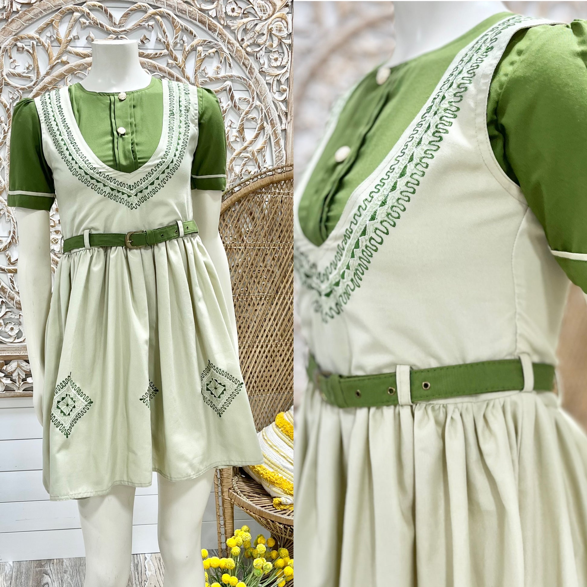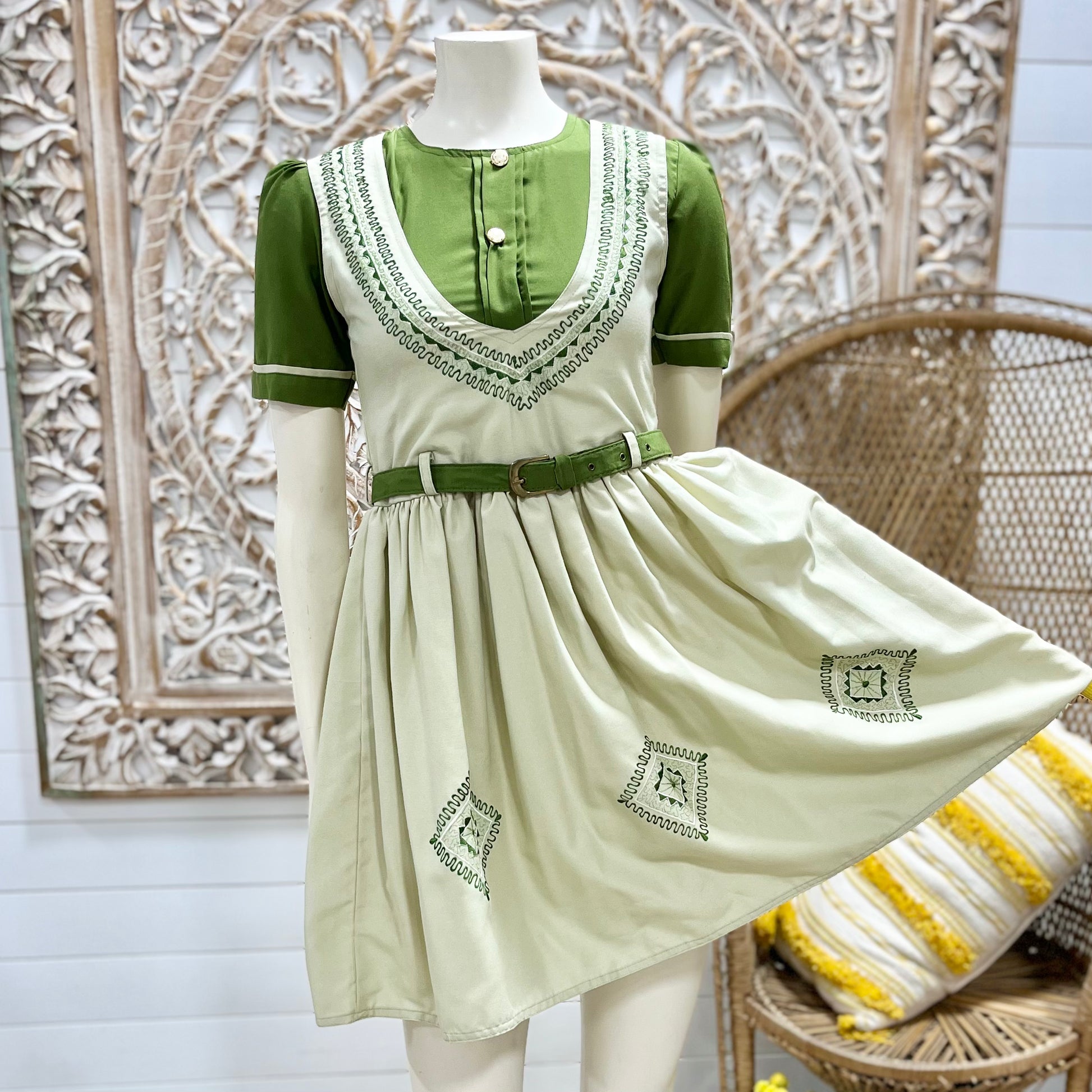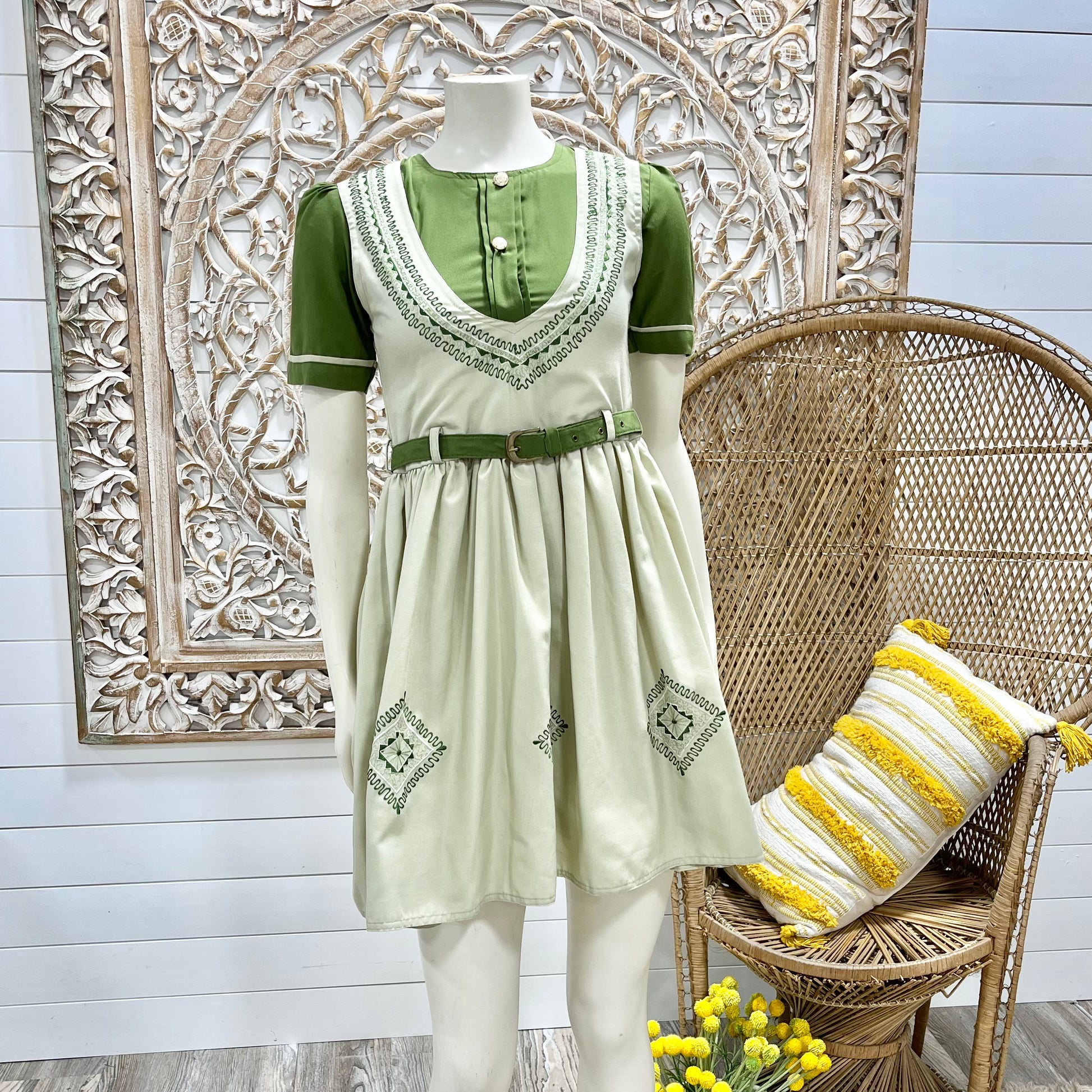 Vintage 50s Style Embroidered Two Tone Green Belted Jumper Girls Dress