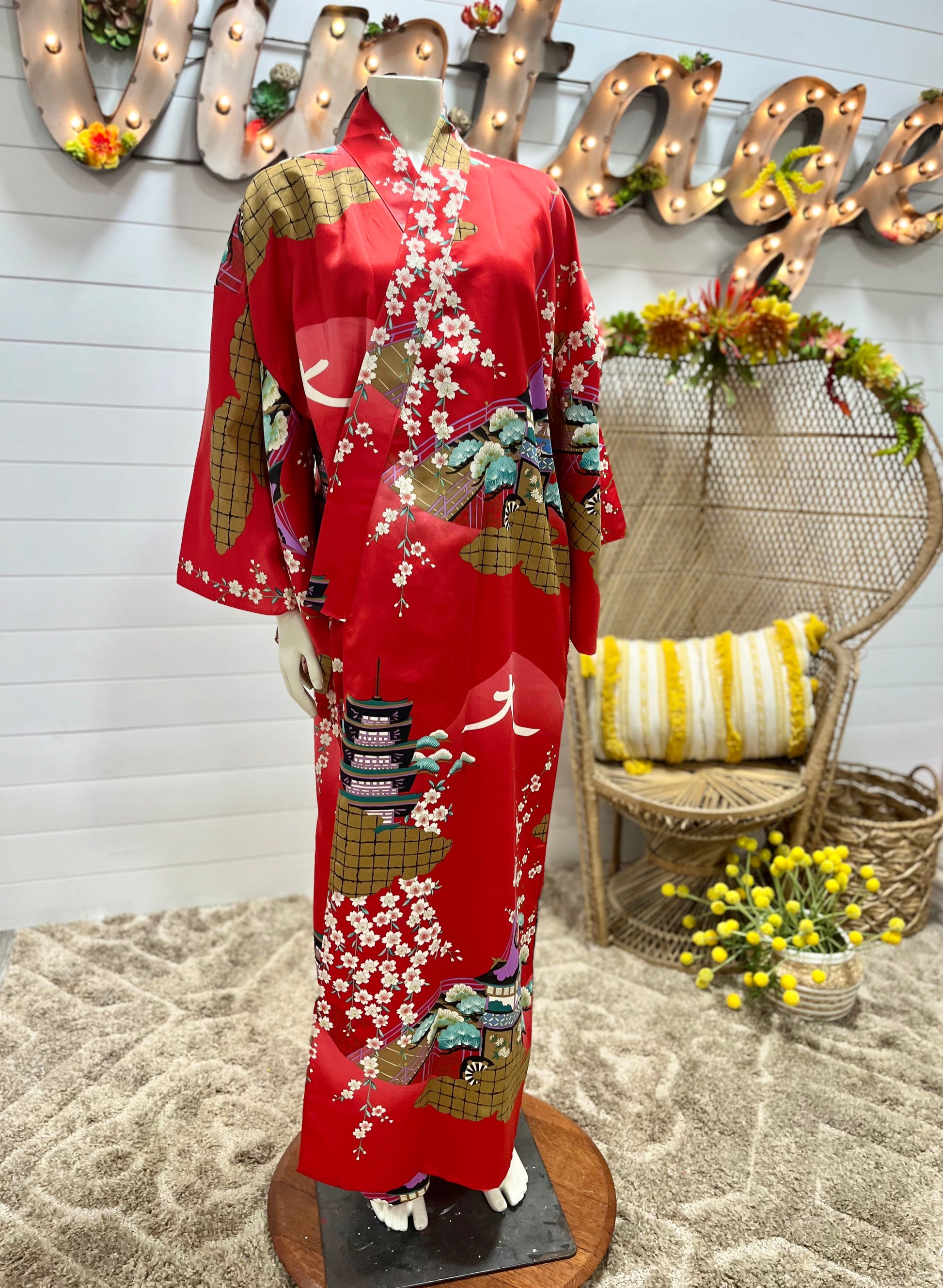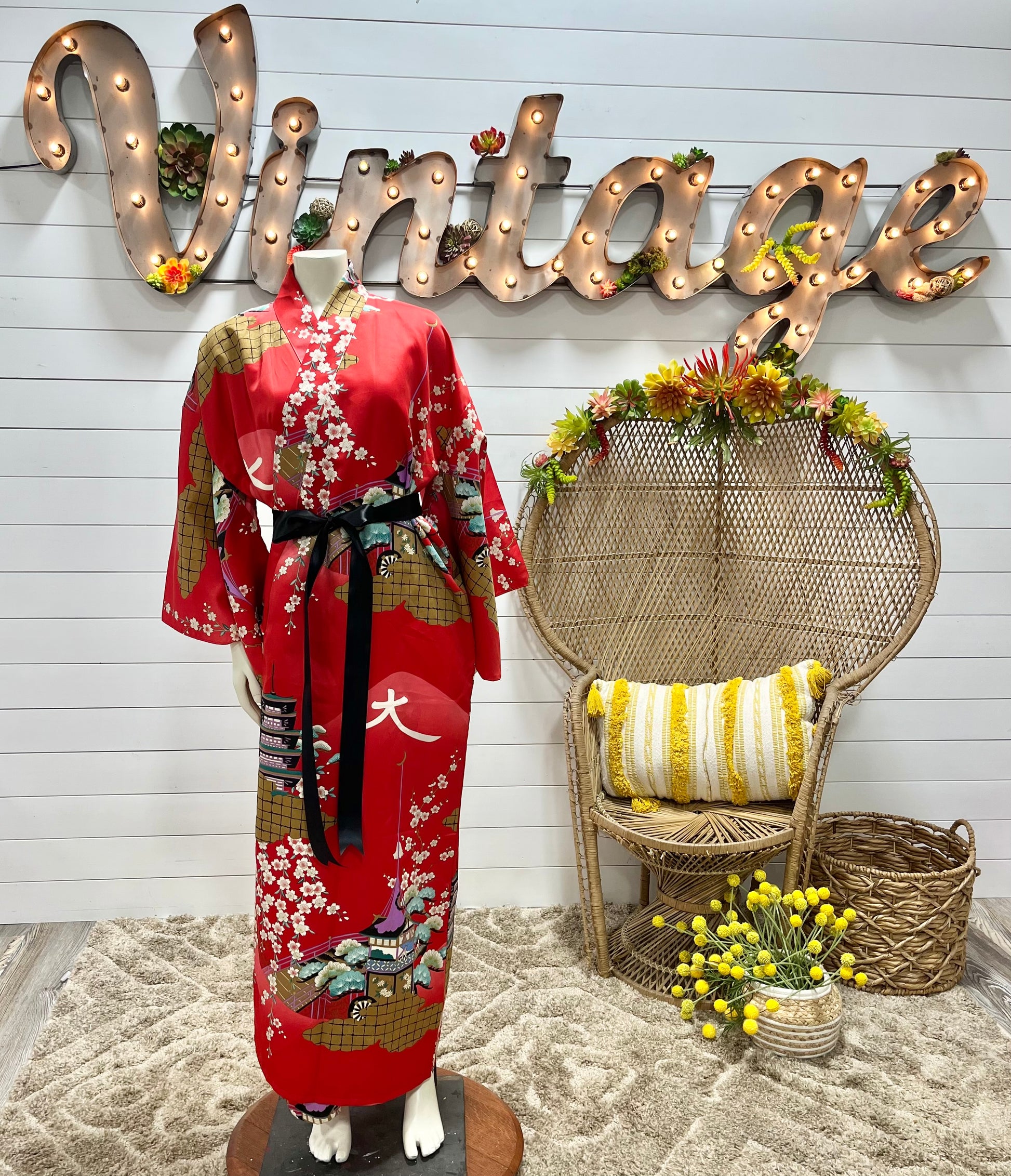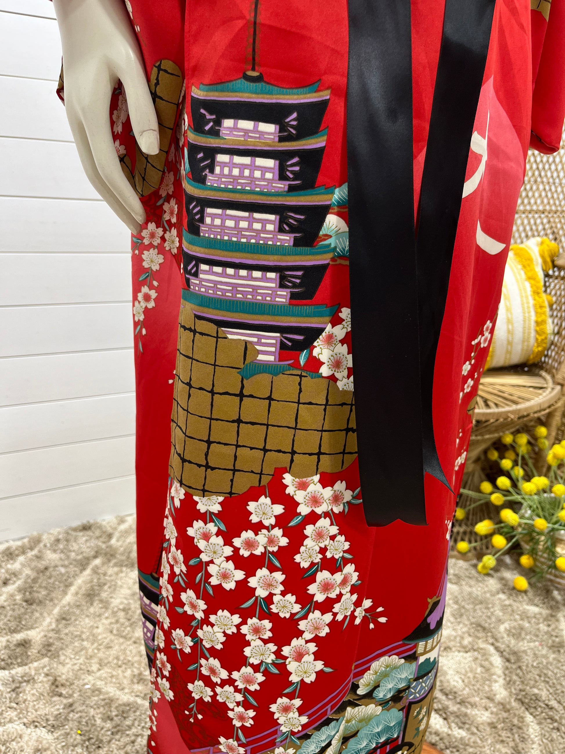This stunning 80s Asian Wrap Cherry Blossom Kimono is a charming, vintage piece featuring flowing sleeves, a wrap around design, and a high collar. It is elegant and versatile, suitable for various occasions. It is in excellent condition. The belt is made of satin ribbon and isn't original to the kimono but will be included with the kimono. Sizing varies and is made for several sizes. Can be worn as a coat, dress or duster.