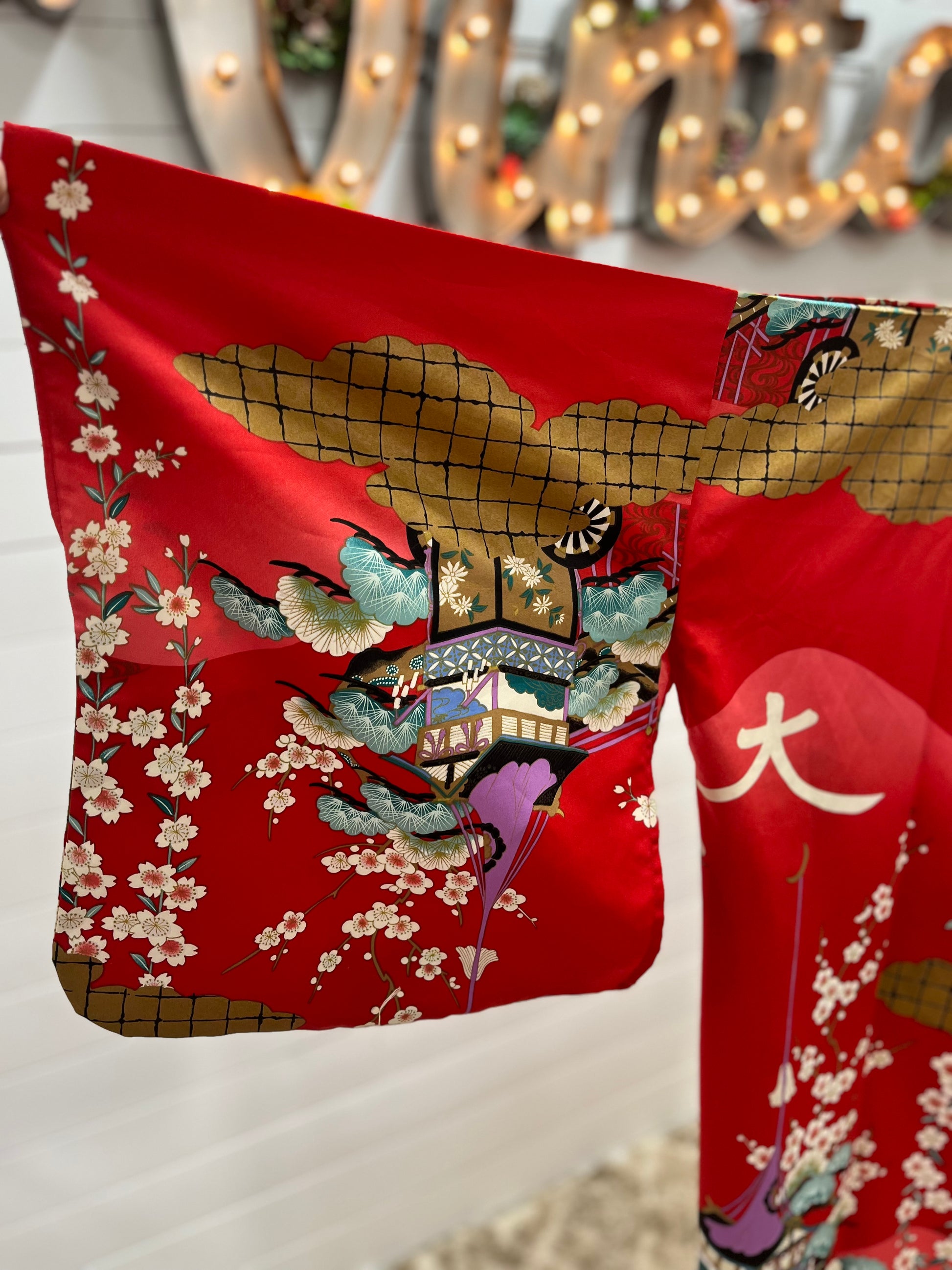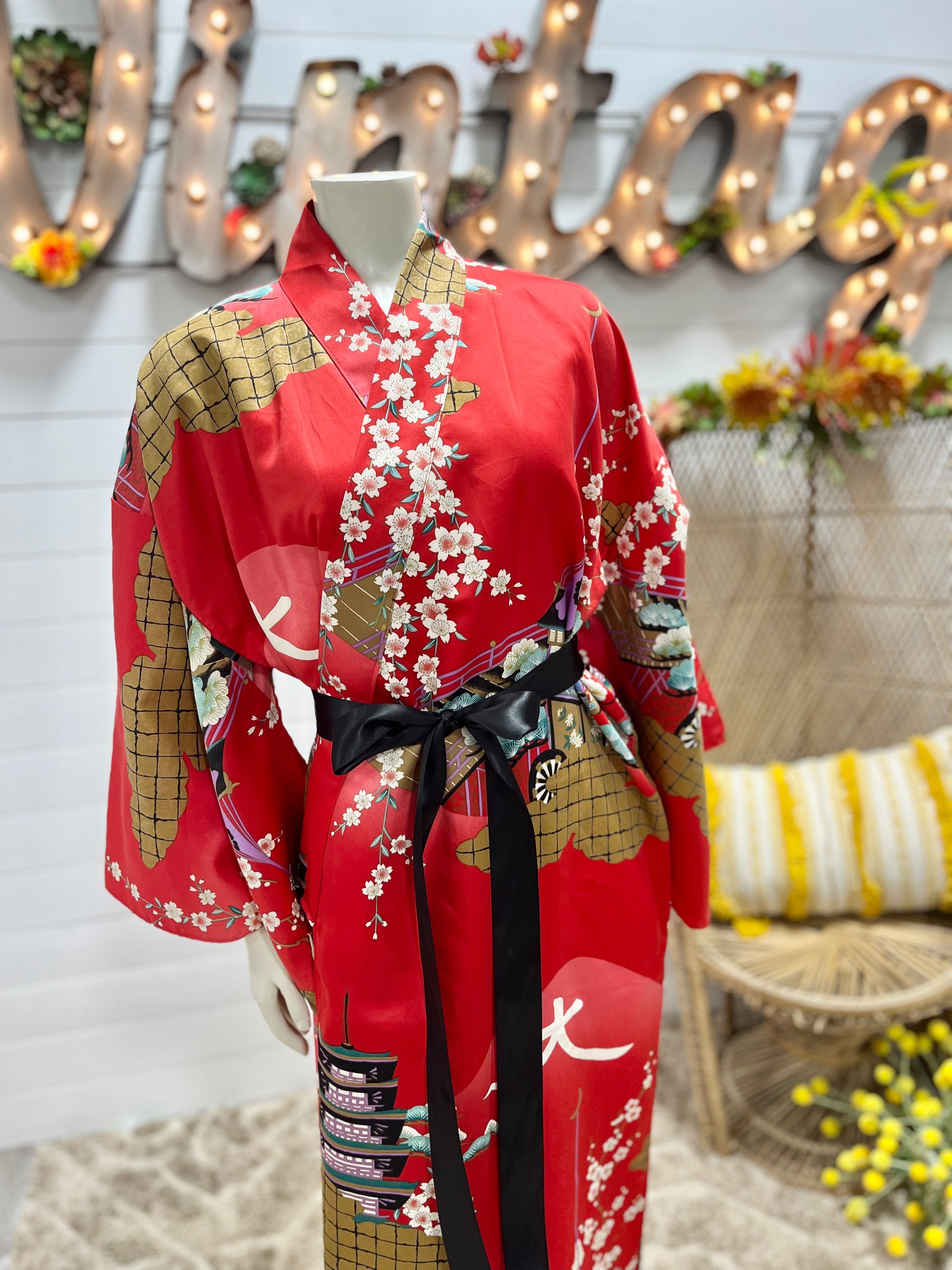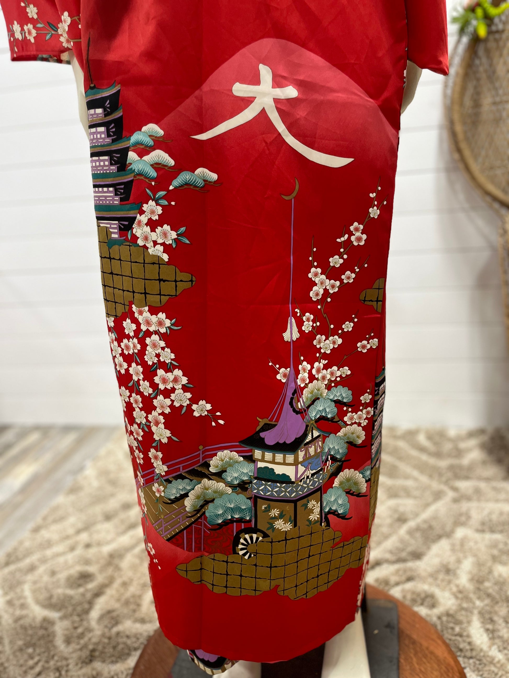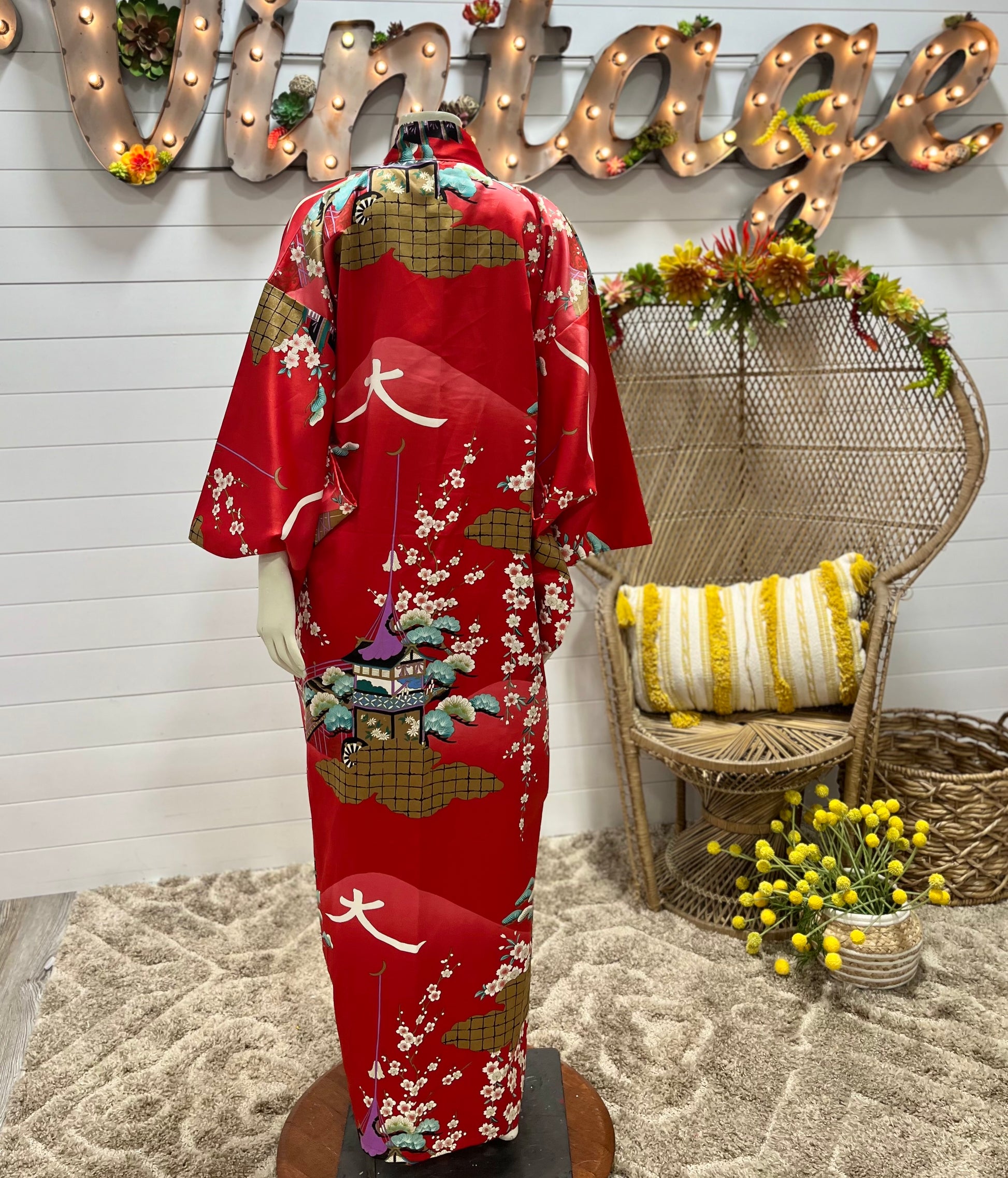 This stunning 80s Asian Wrap Cherry Blossom Kimono is a charming, vintage piece featuring flowing sleeves, a wrap around design, and a high collar. It is elegant and versatile, suitable for various occasions. It is in excellent condition. The belt is made of satin ribbon and isn't original to the kimono but will be included with the kimono. Sizing varies and is made for several sizes. Can be worn as a coat, dress or duster.