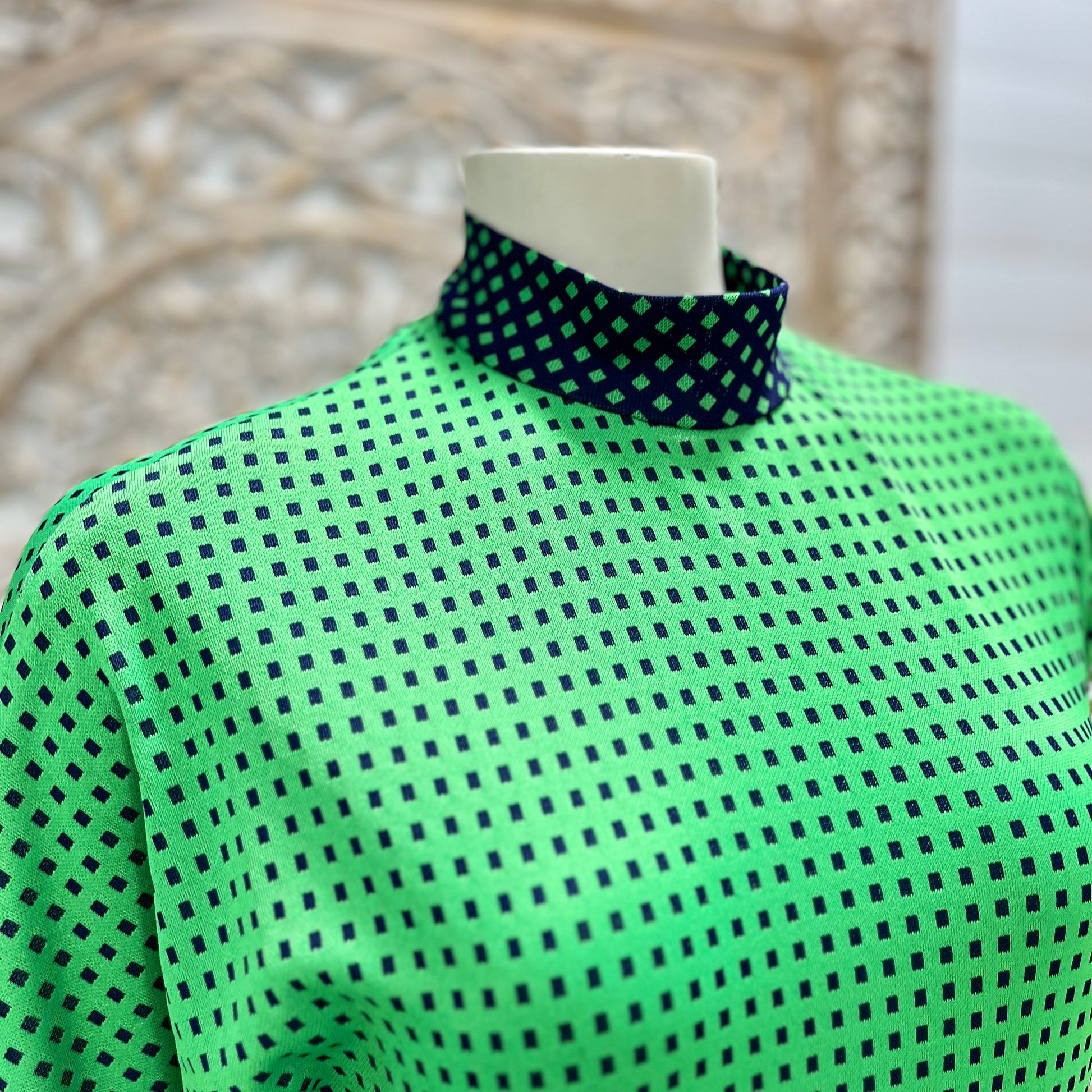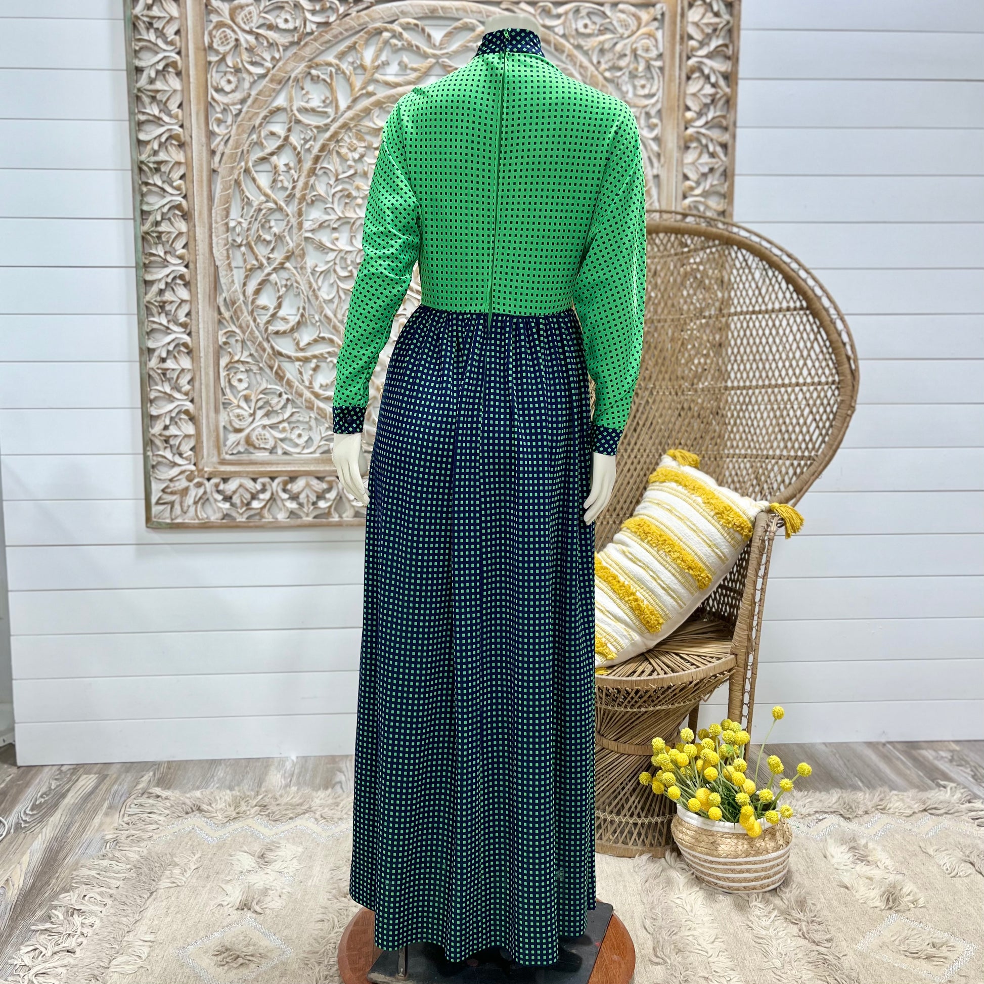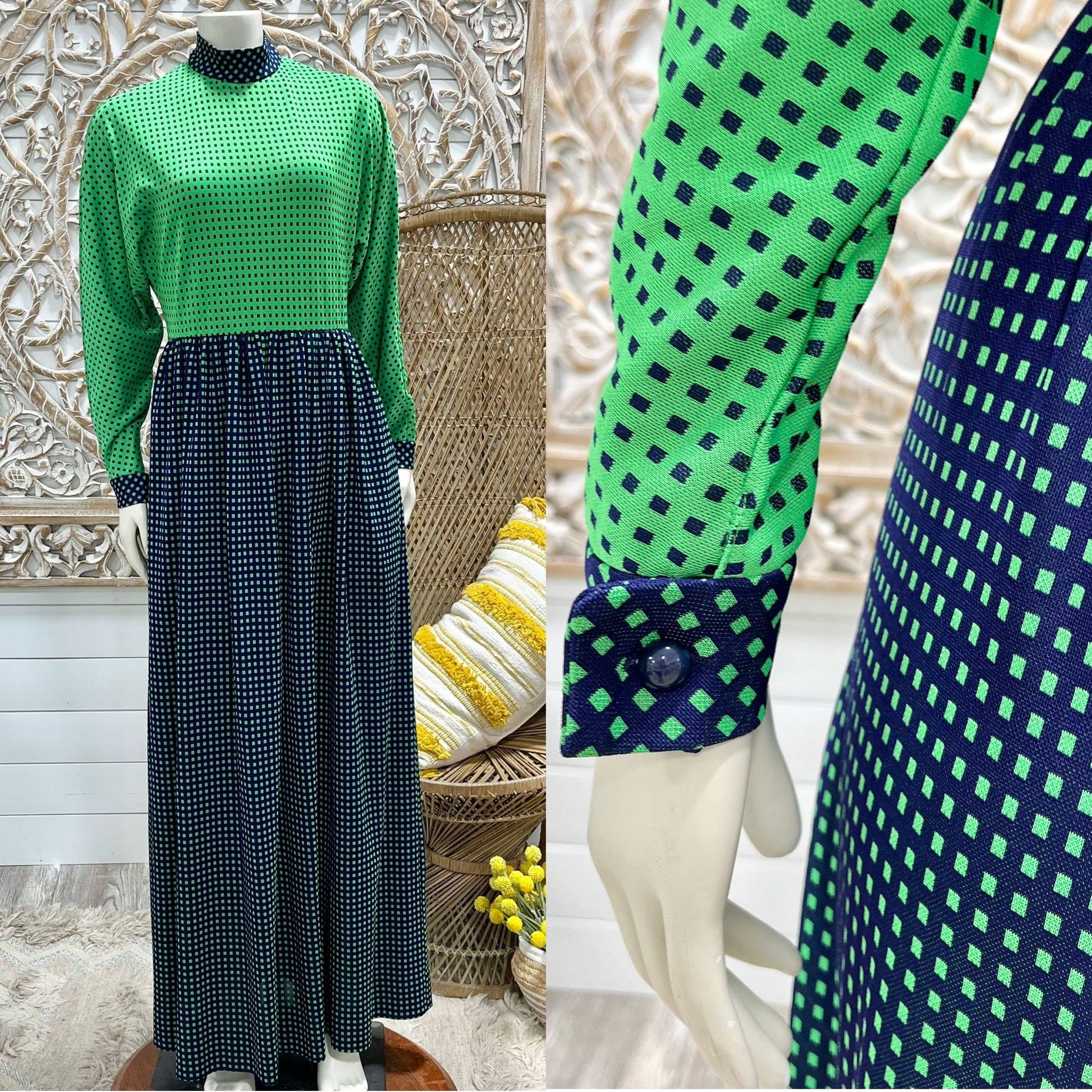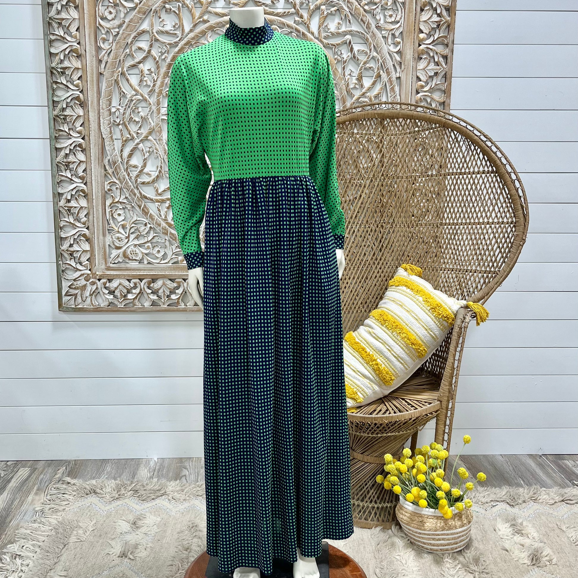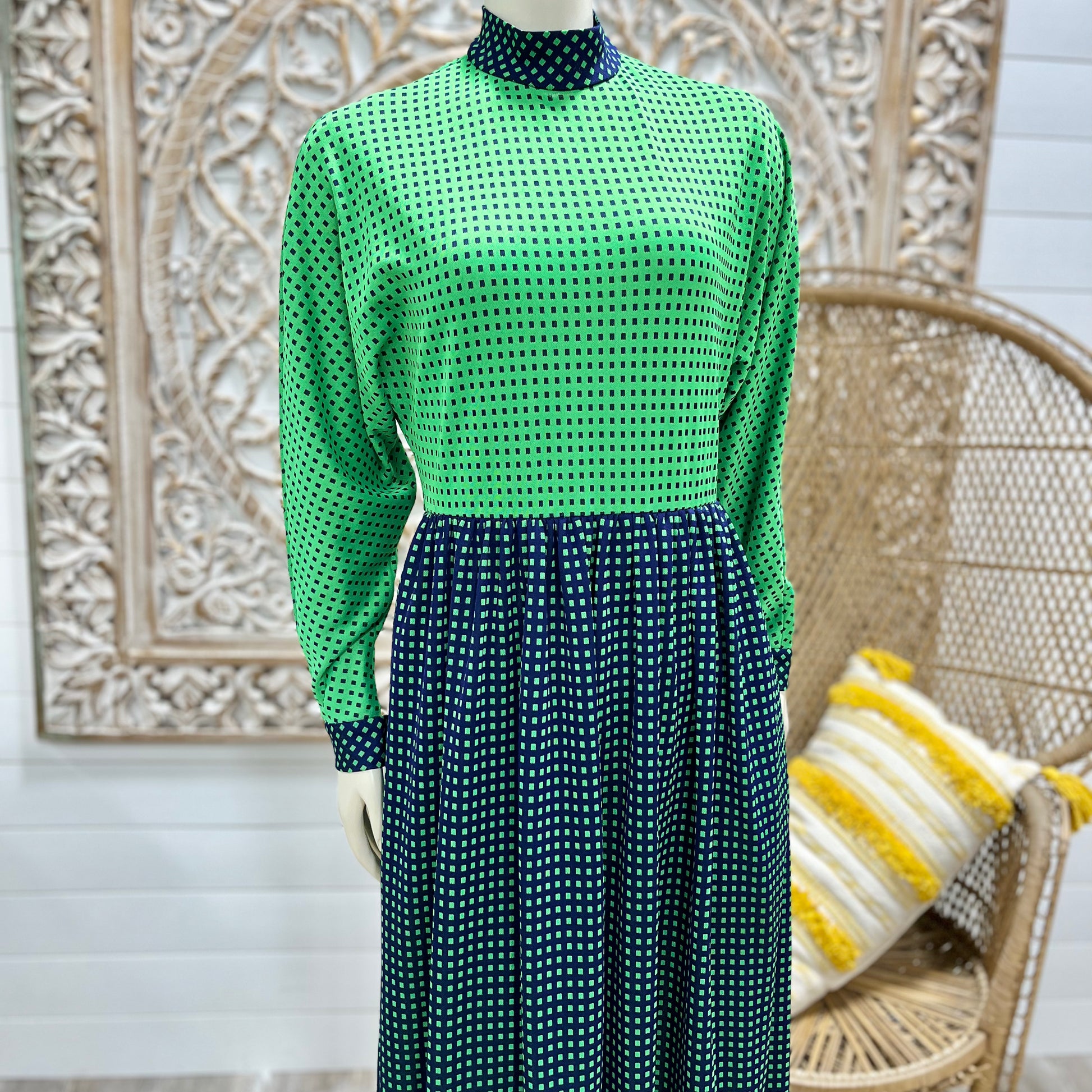 70s Vintage Geometric Square Color Block High Collar Dolman Maxi Dress S