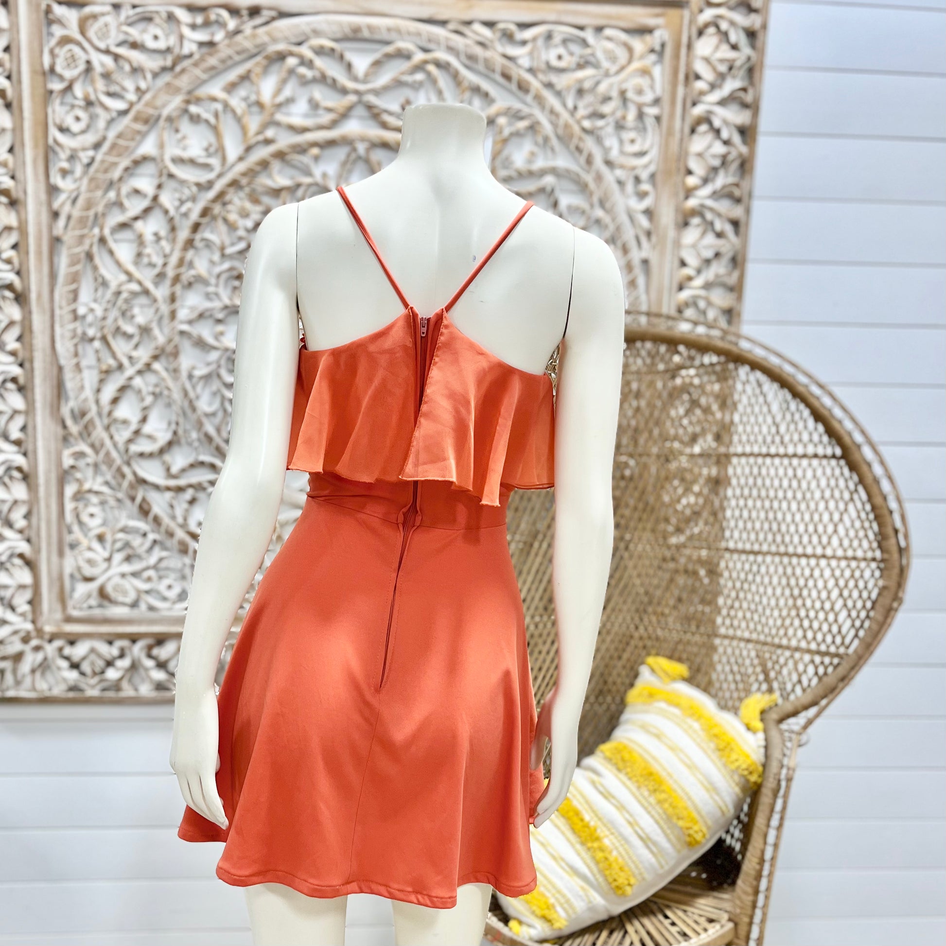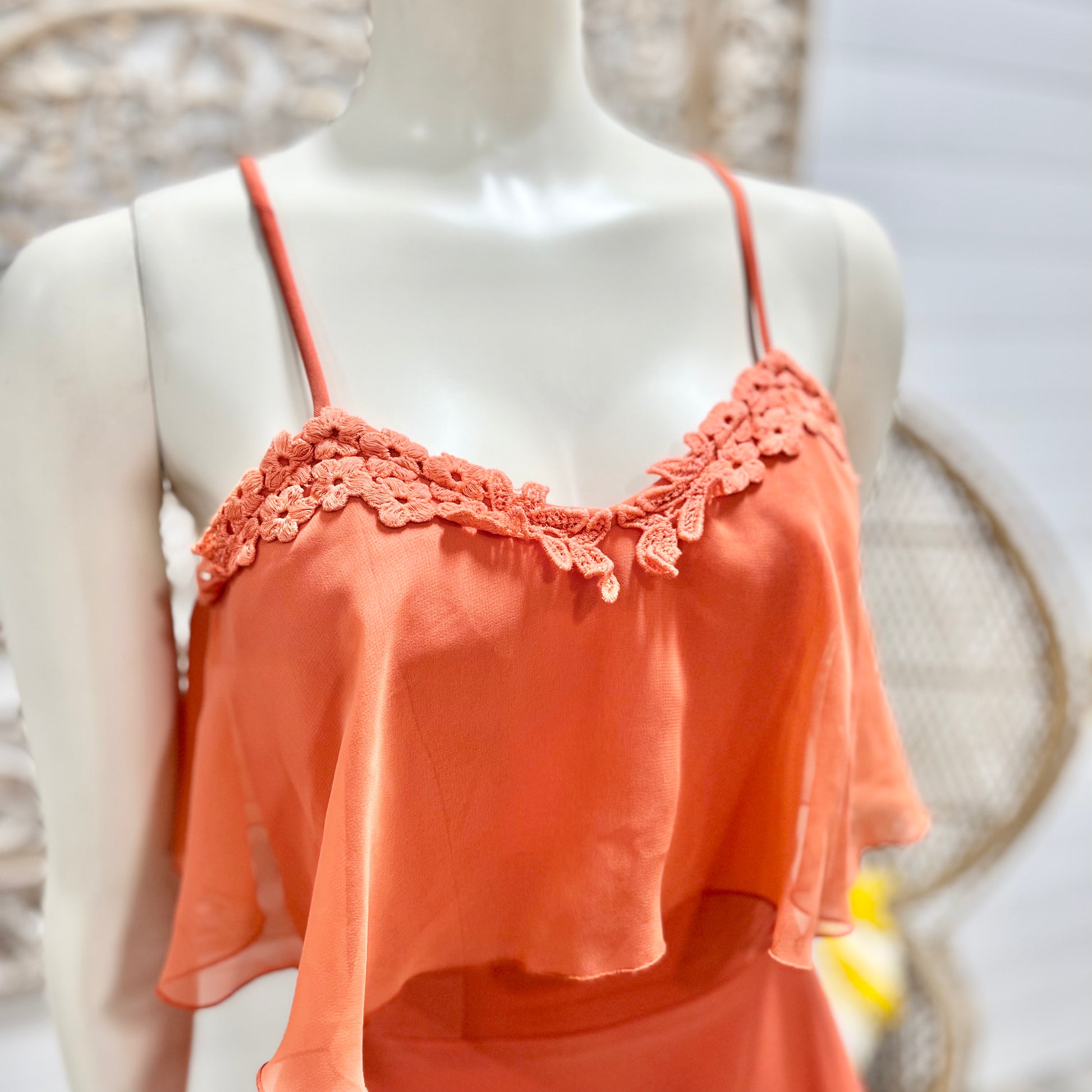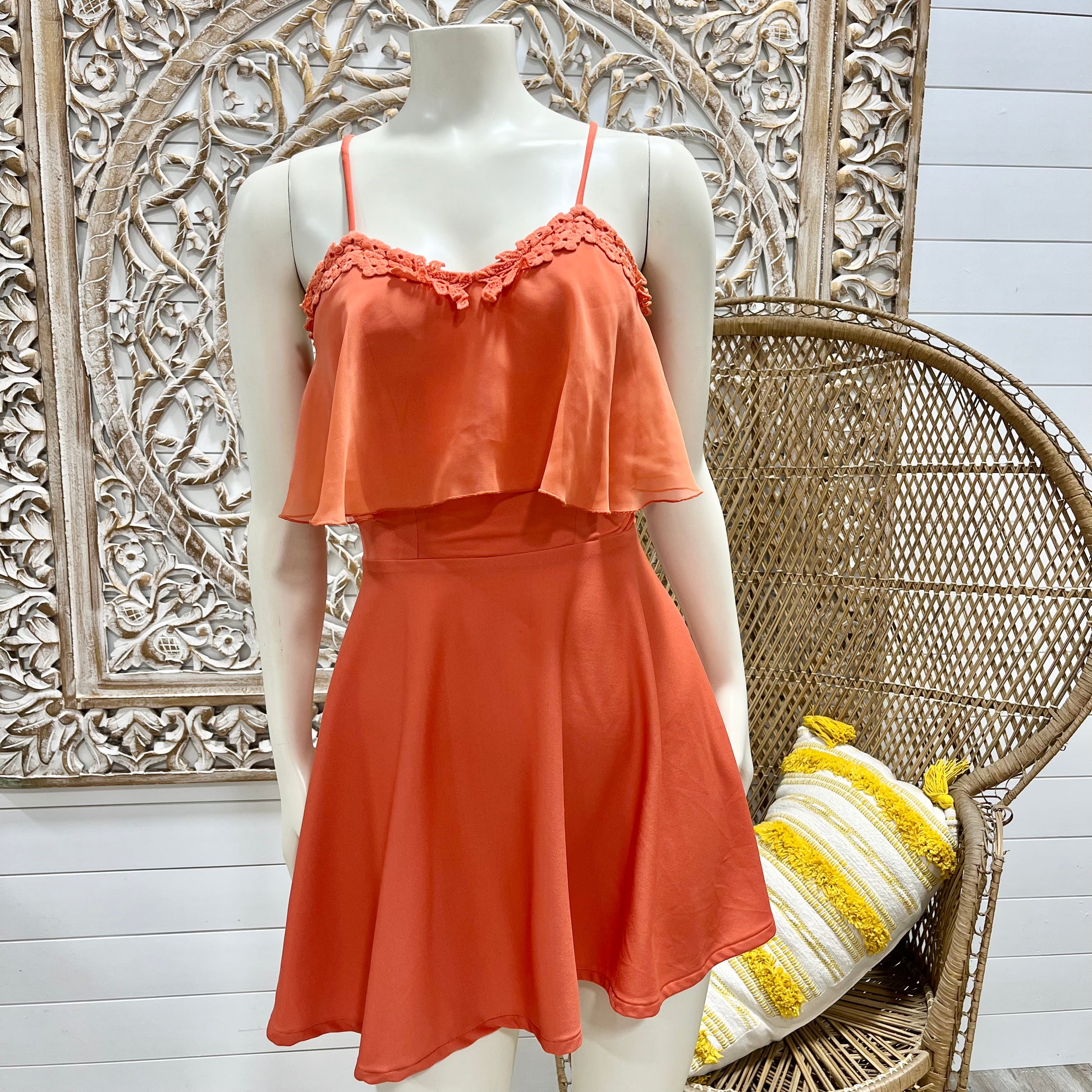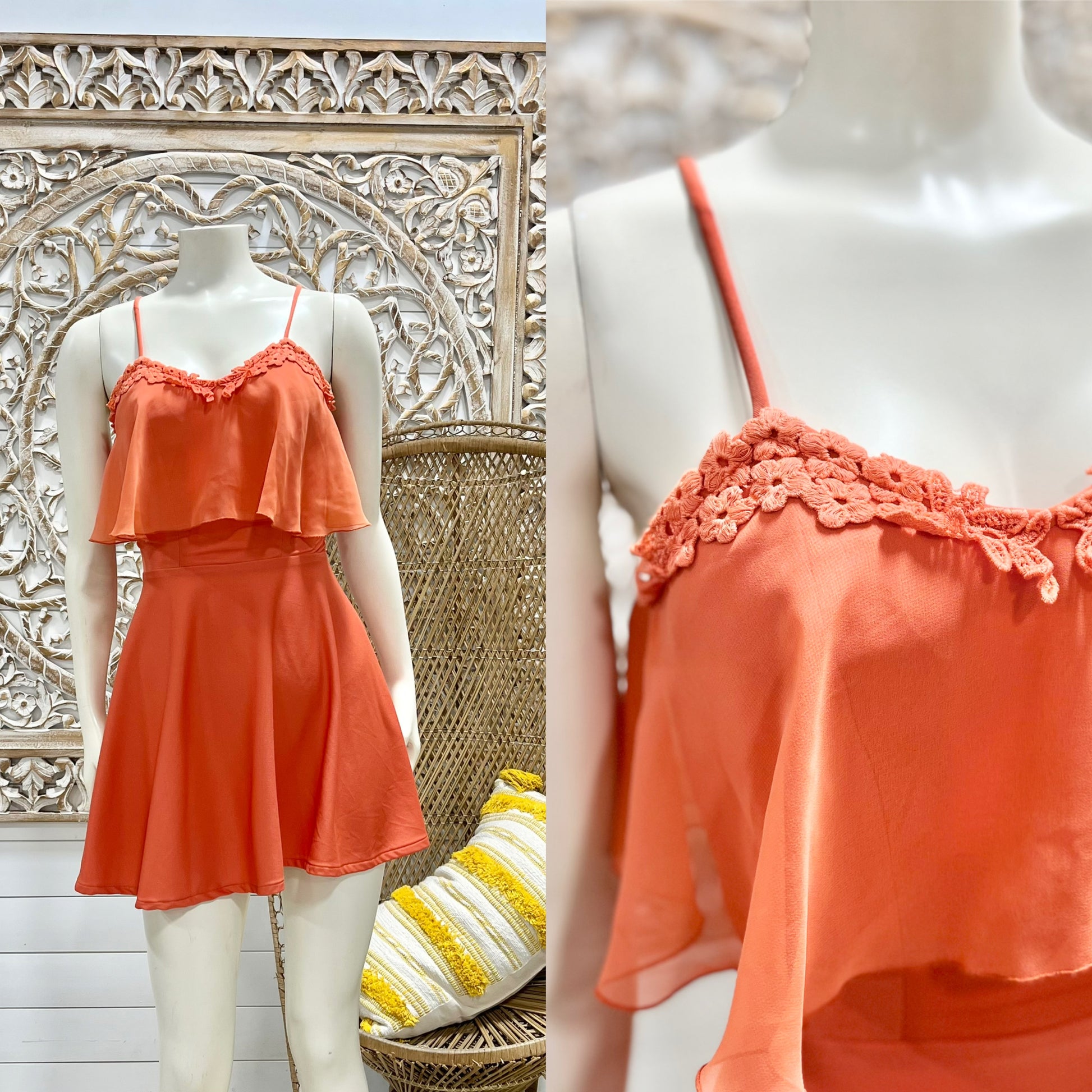 70s Vintage Embroidered Flower Trim Boho Orange Mini Dress XXS