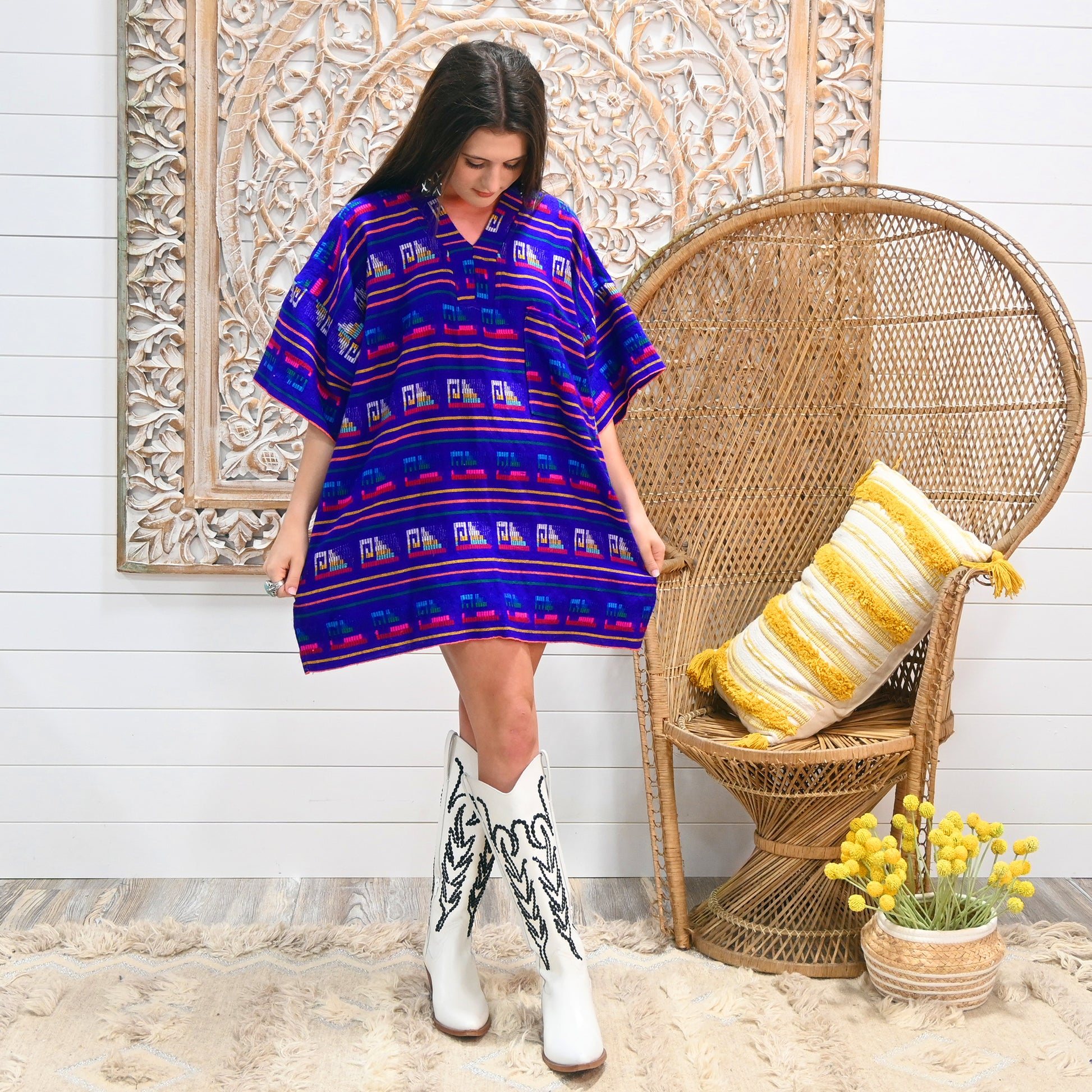 Purple Mexican Embroidered Boho Hippie Vintage Striped 70s Ethnic Tunic Shirt Dress