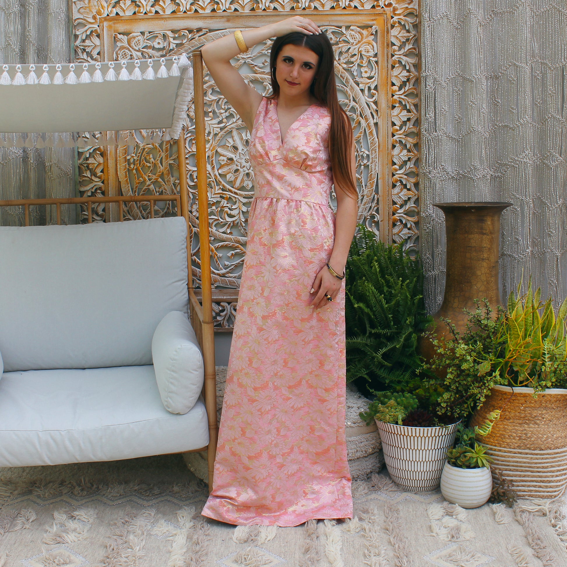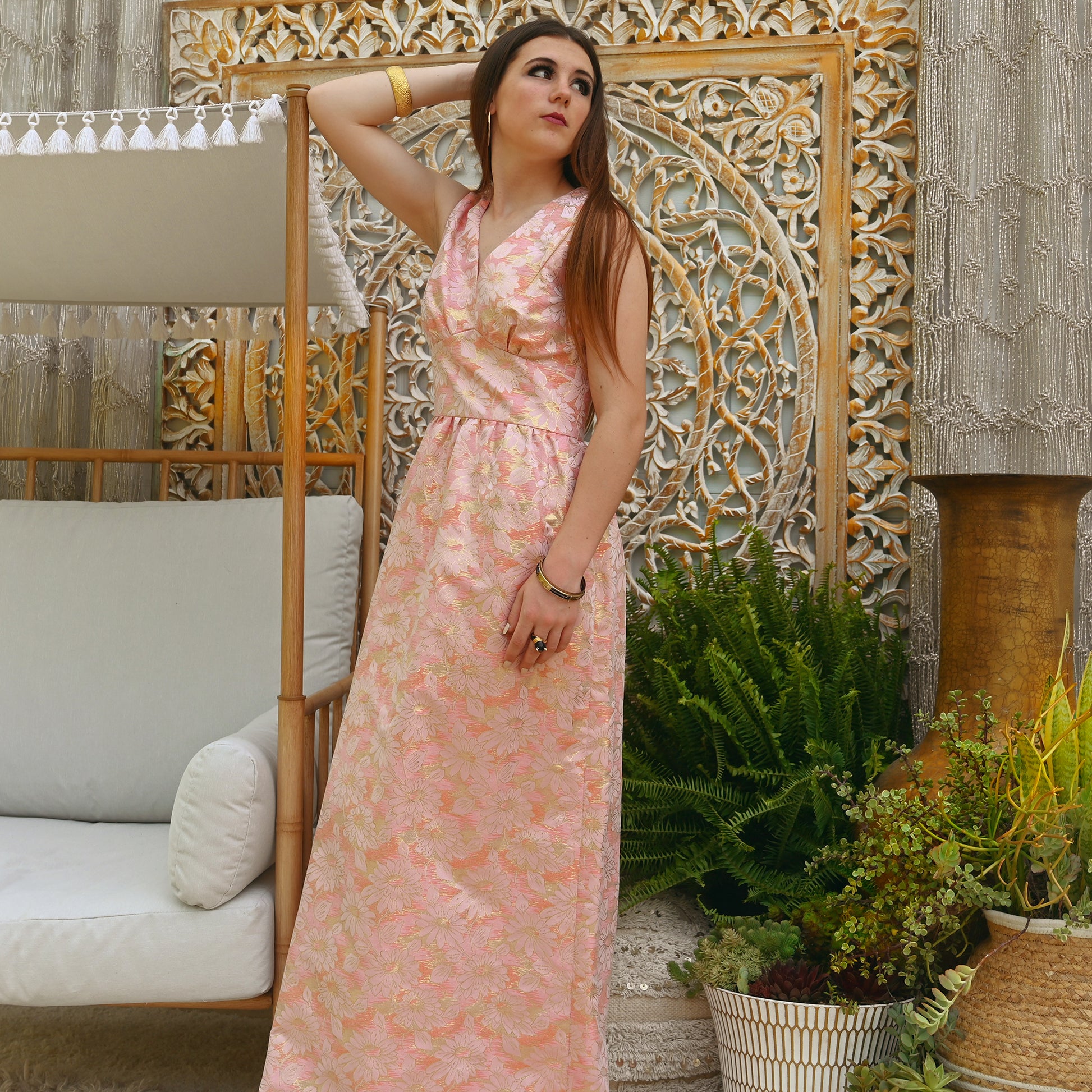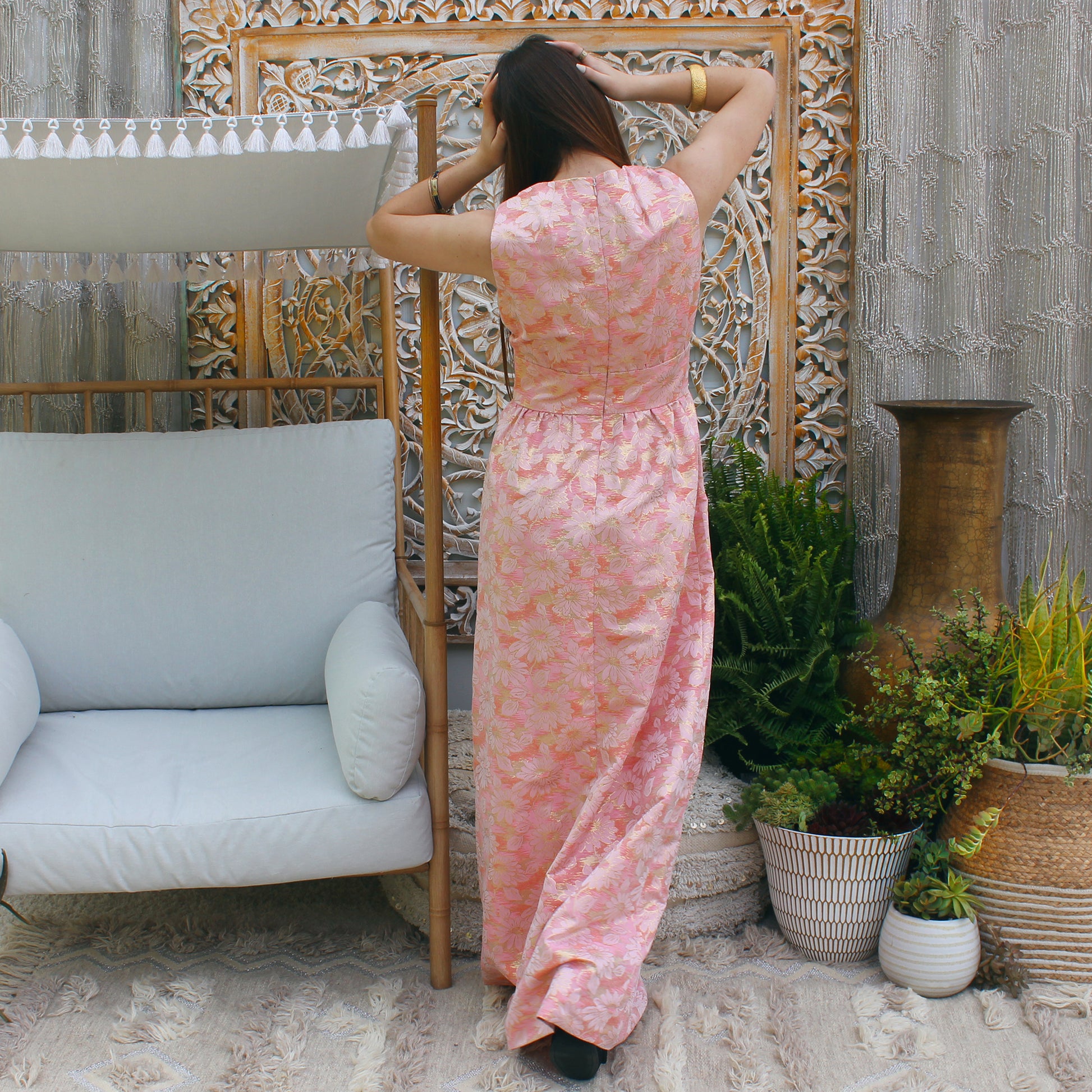 Vintage 60s Gold Pink Lurex Daisy Brocade Evening Gown
