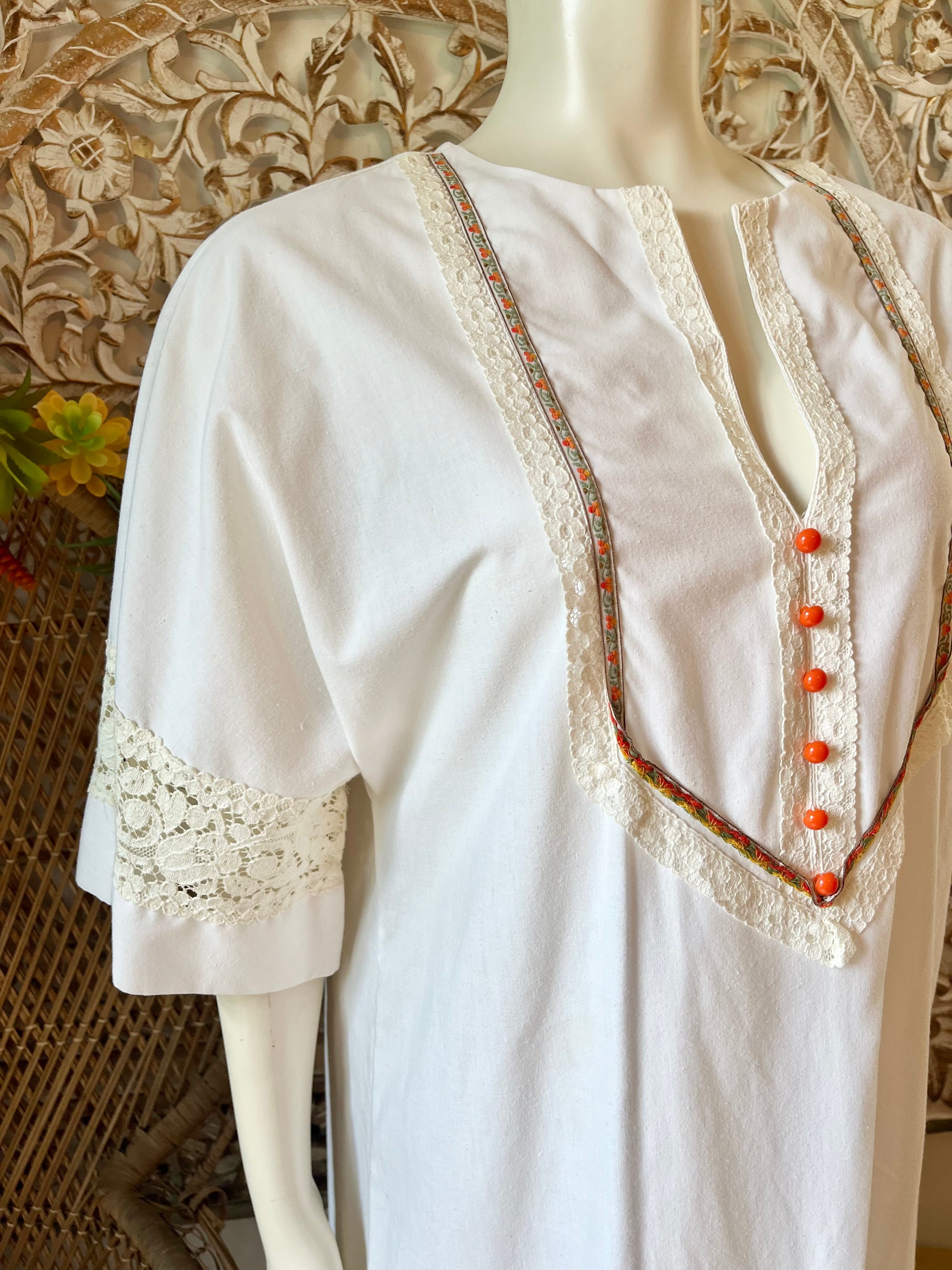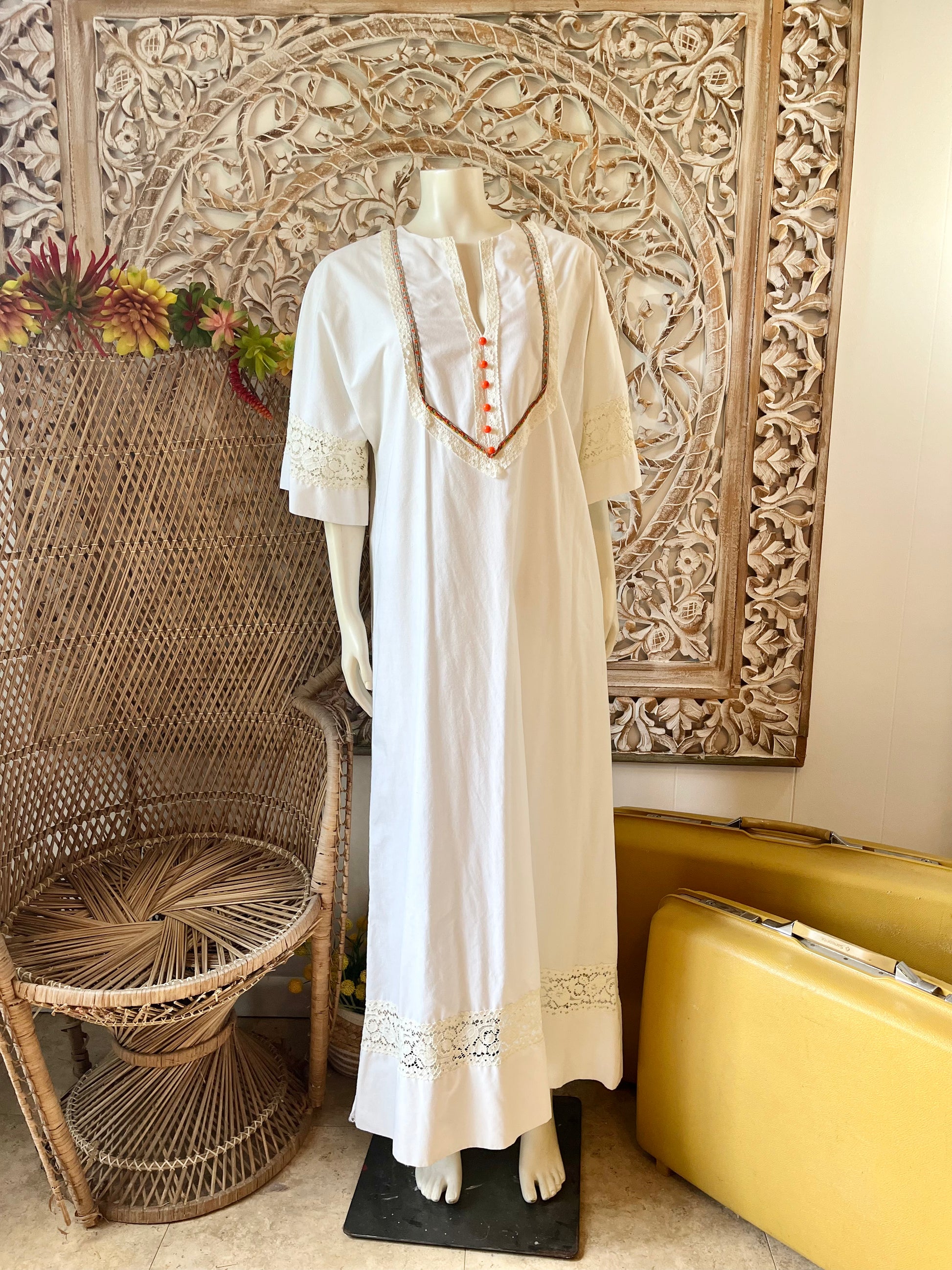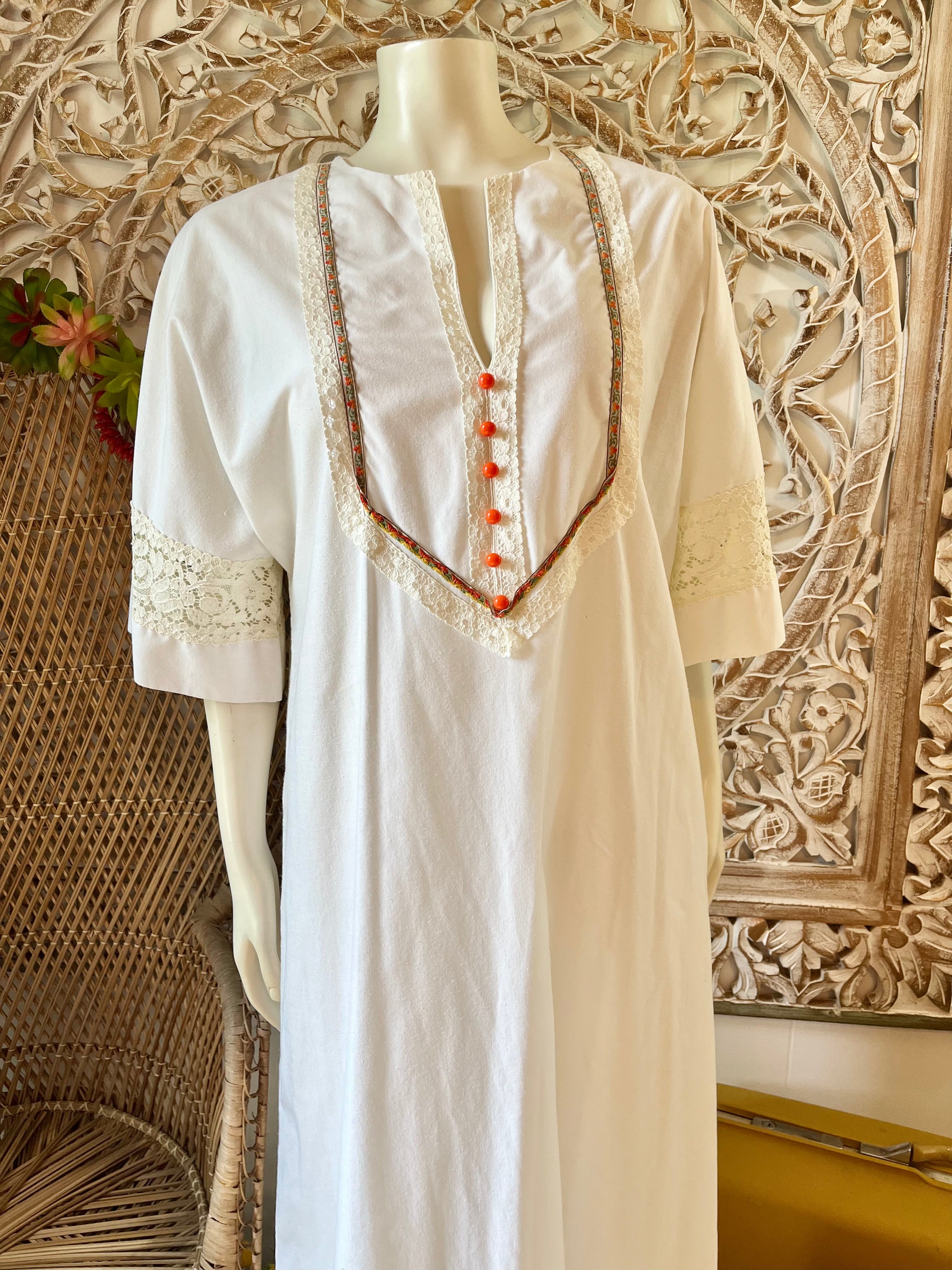 Vintage 70s Beige Bohemian Hippie Lace Caftan Dress