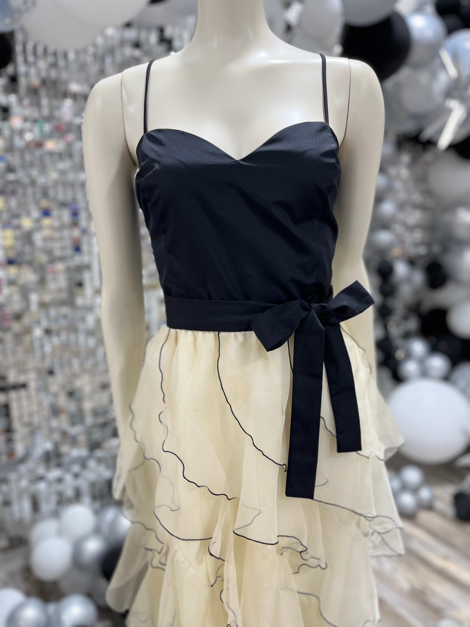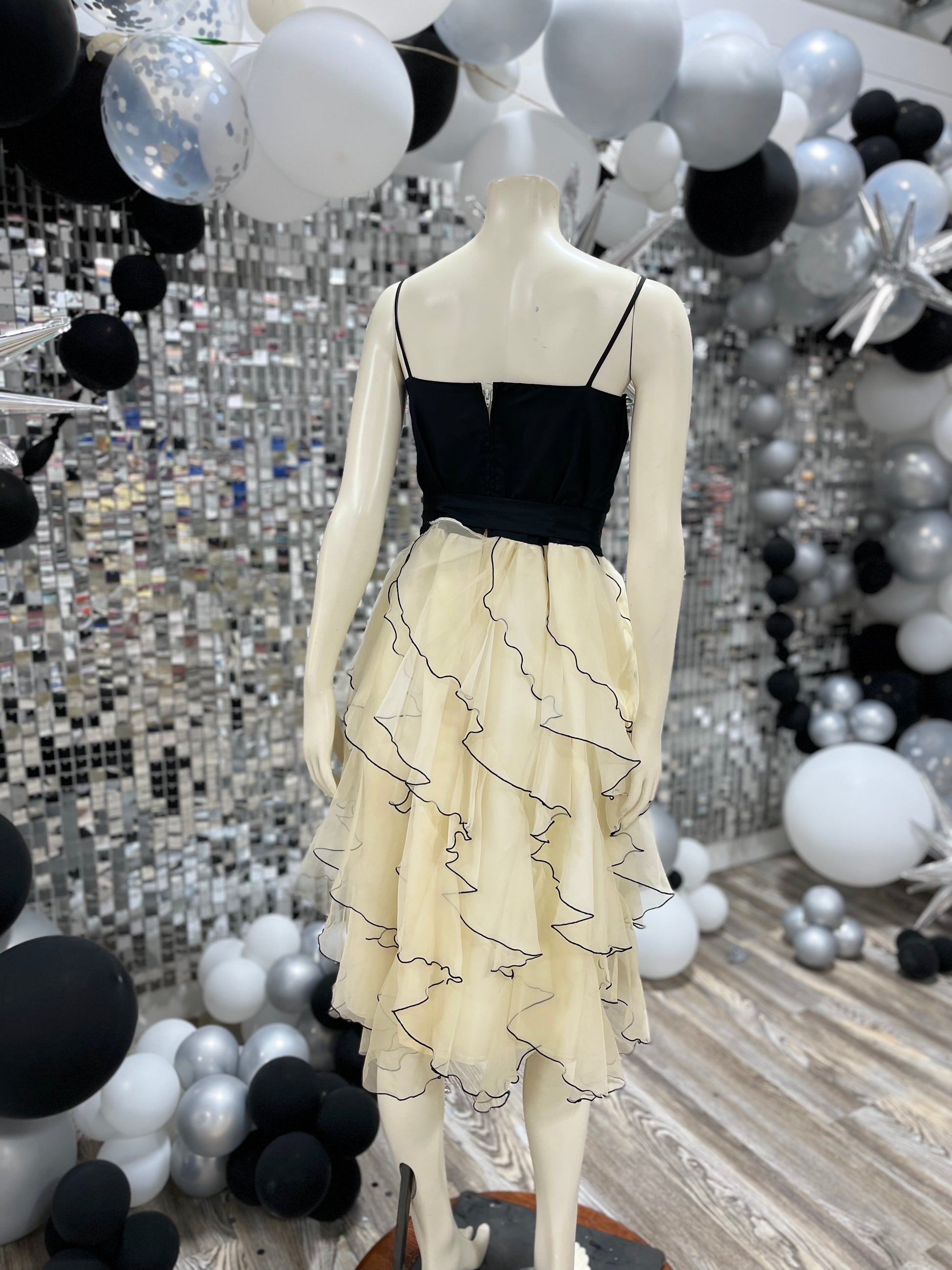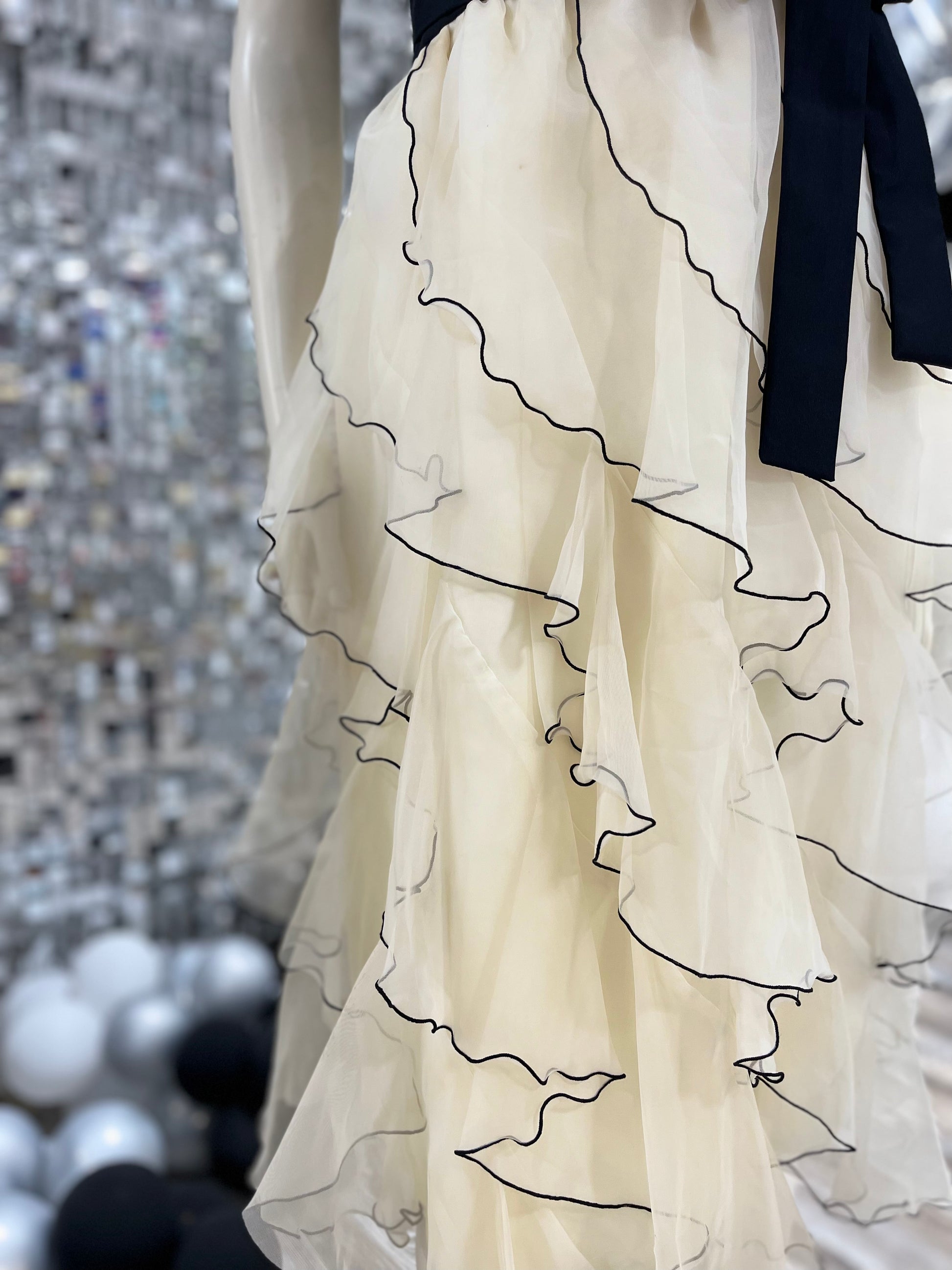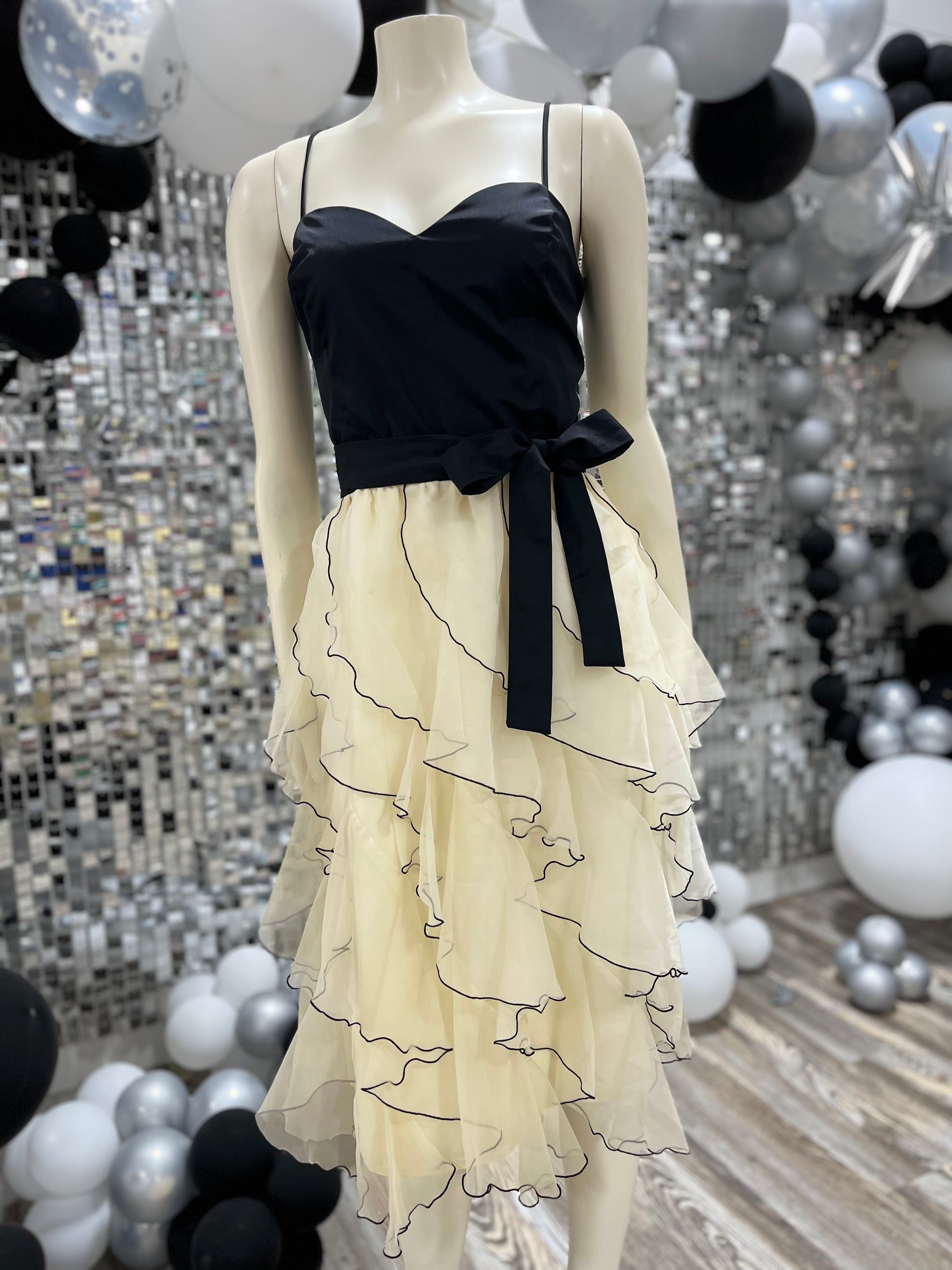 Vintage 70s Black Ivory Tiered Ruffle Cocktail Party Dress L