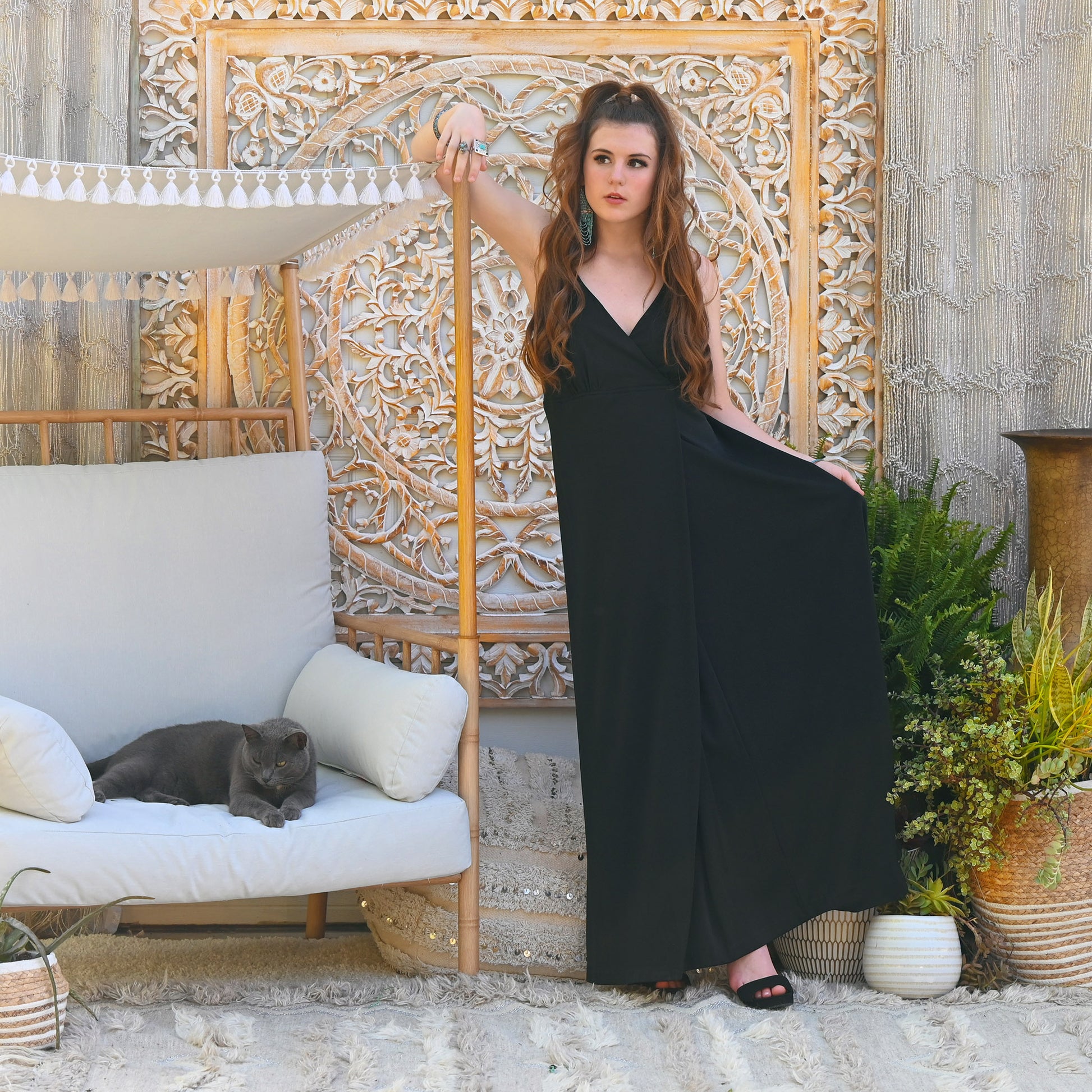 Vintage 70s Black Wrap Disco Spaghetti Strap Evening Maxi Dress S