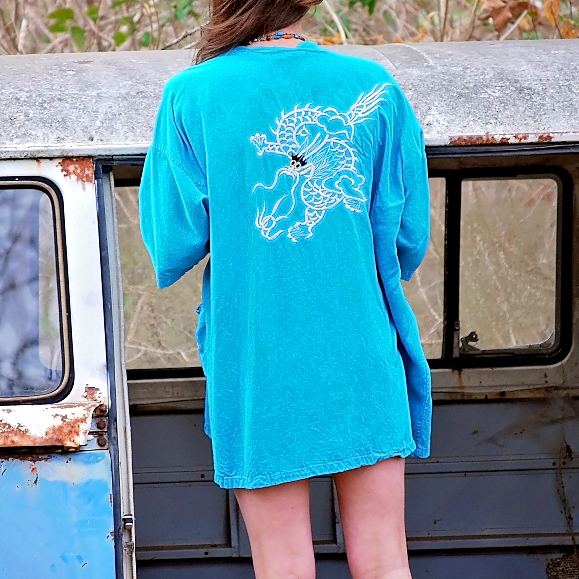 Vintage 70s Blue Embroidered Dragon Duster Kimono