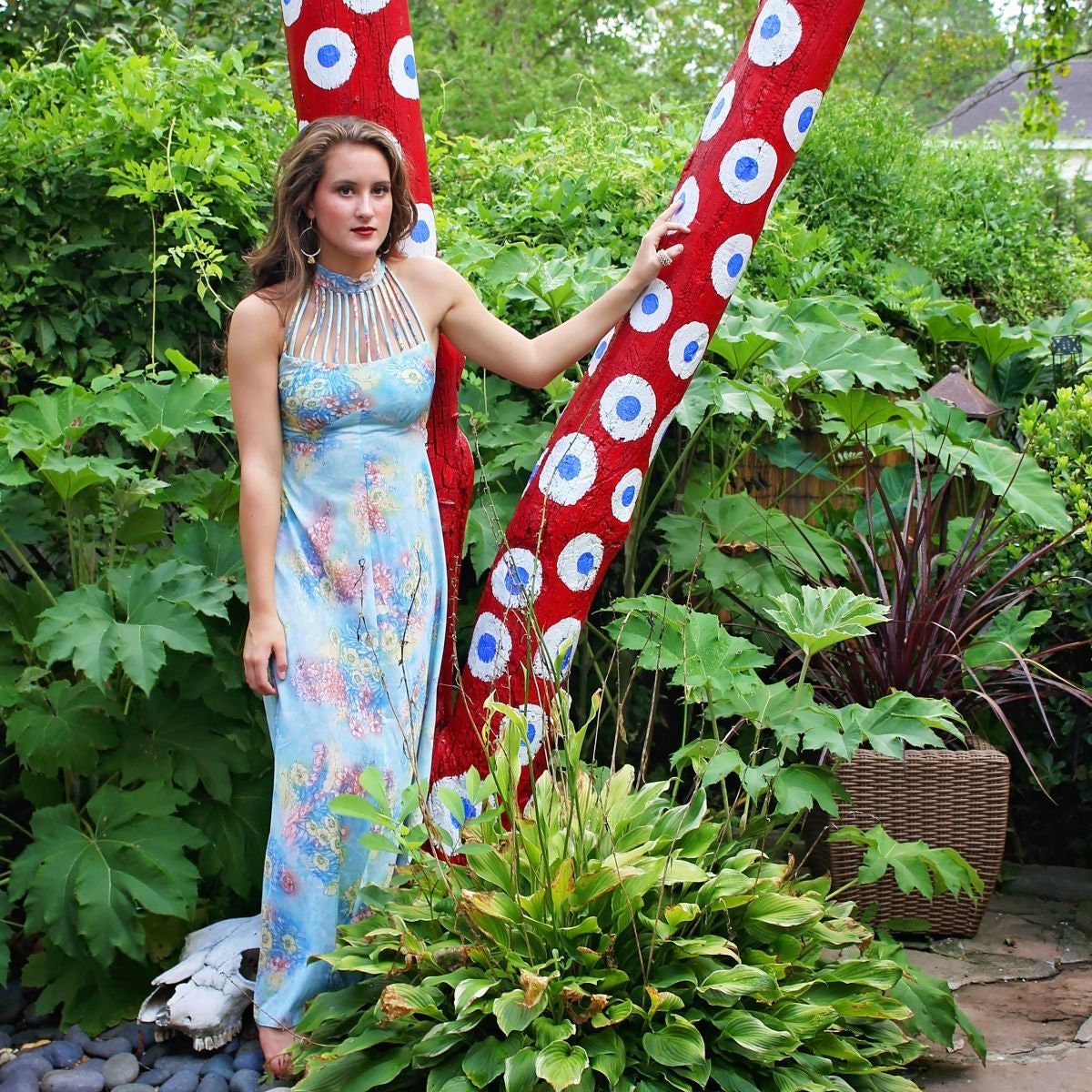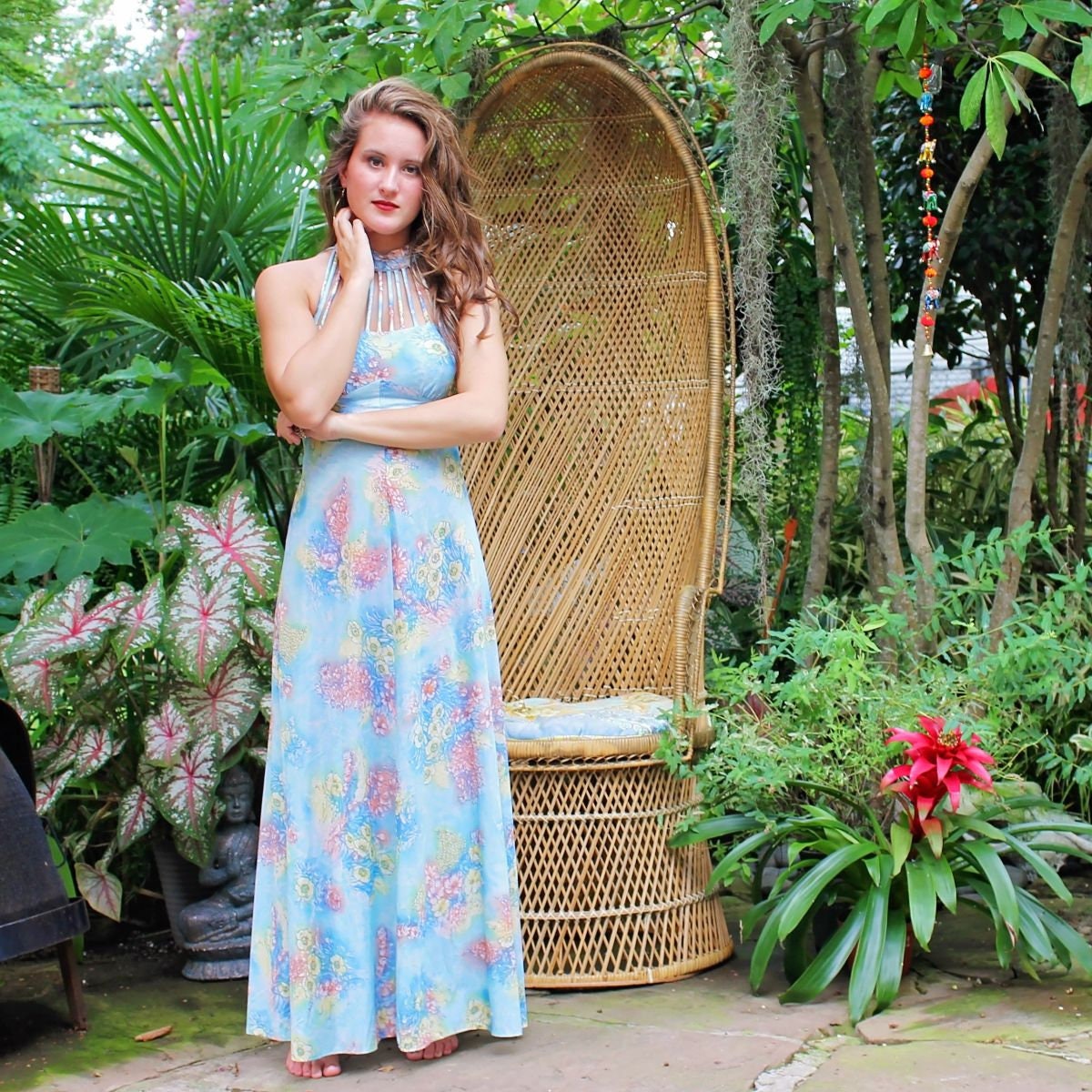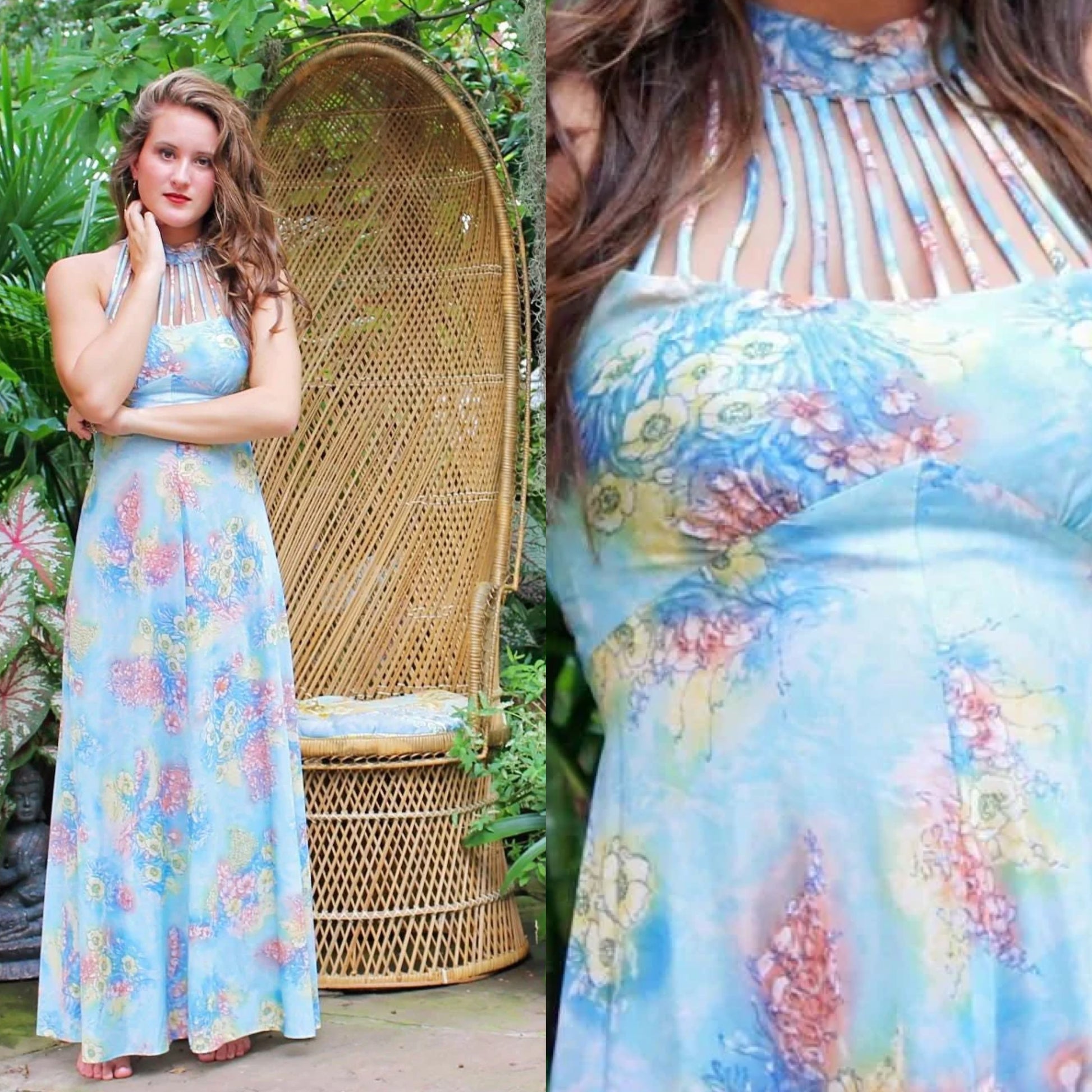 Vintage 70s Blue Floral Cage Top Empire Maxi Dress XS