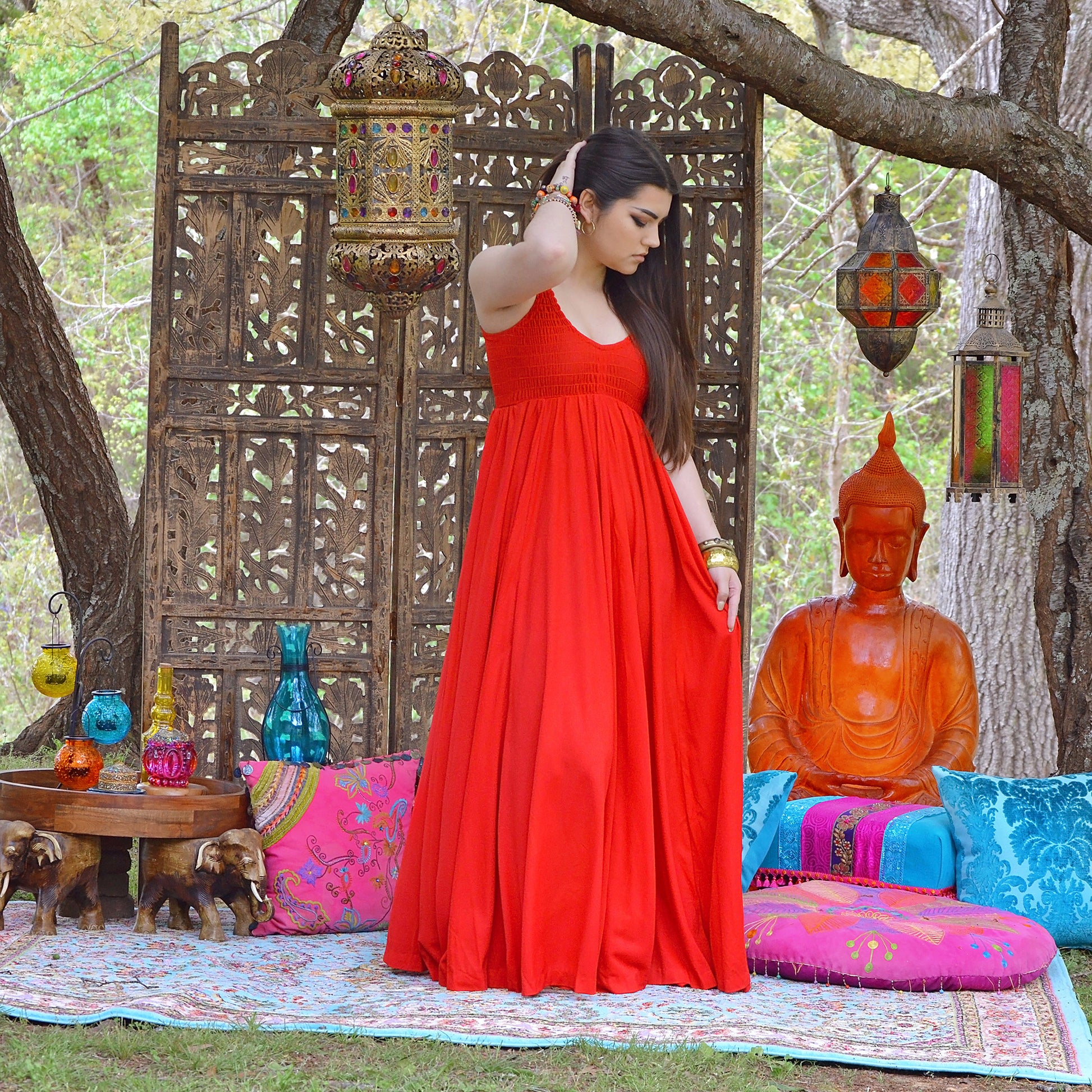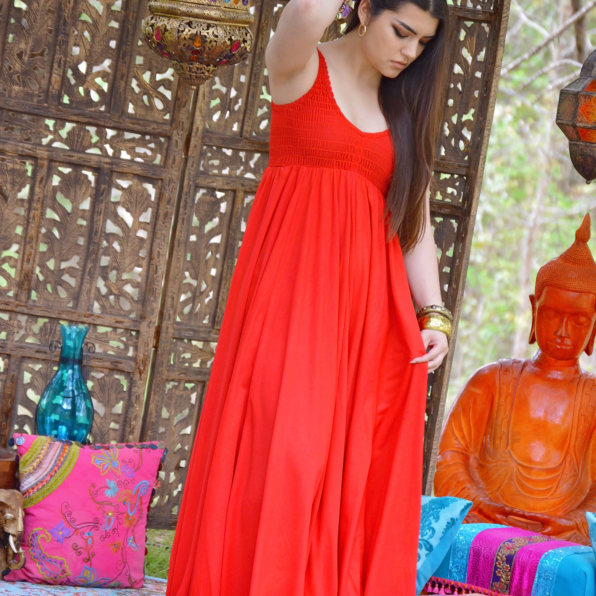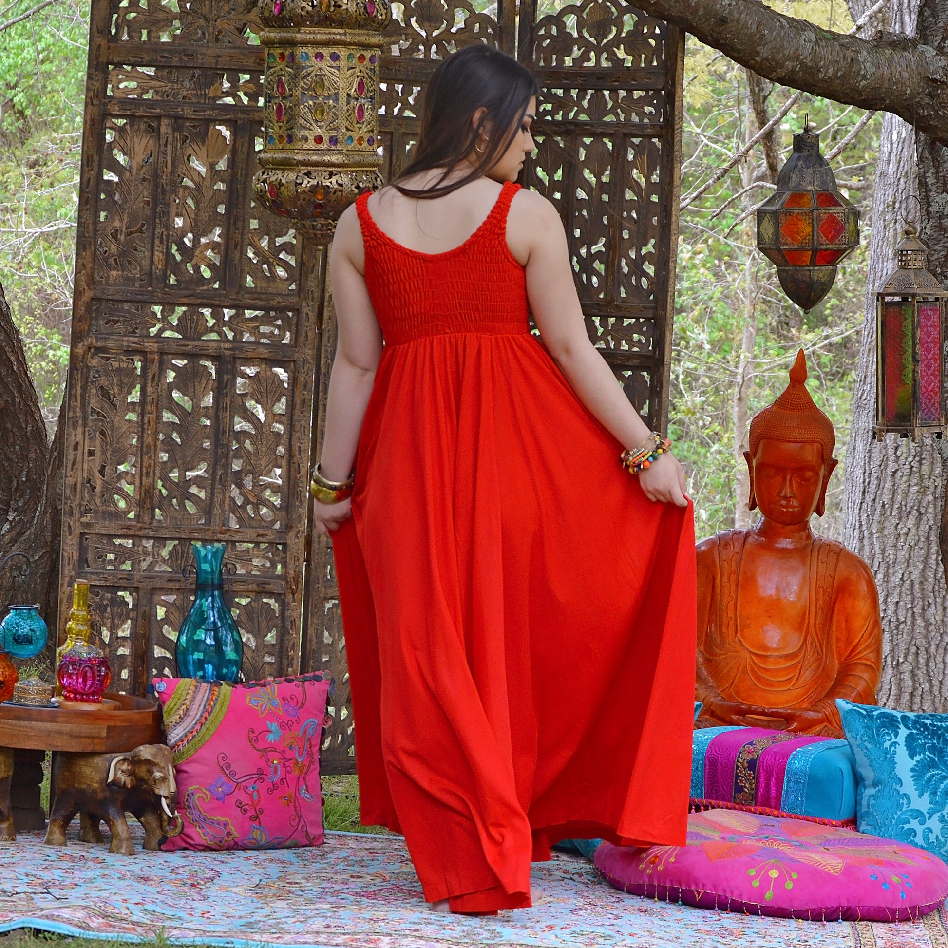 Vintage 70s Fabulous Climax Red Smocked Full Sweep Maxi Dress S