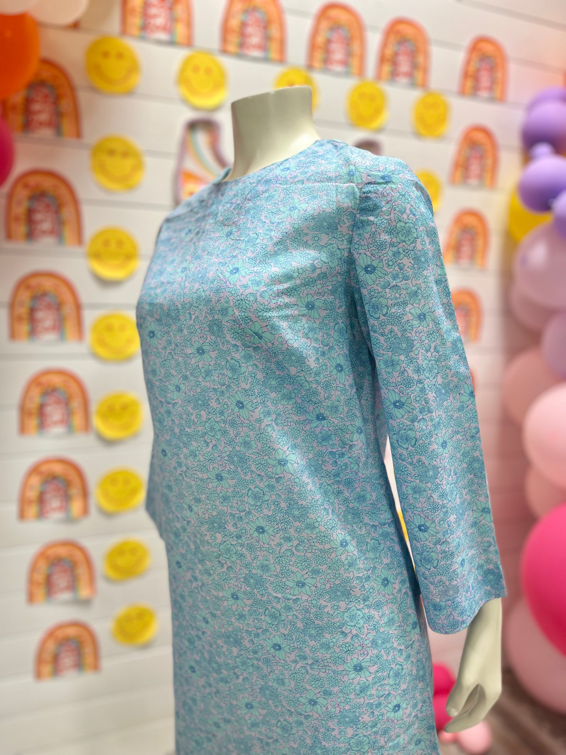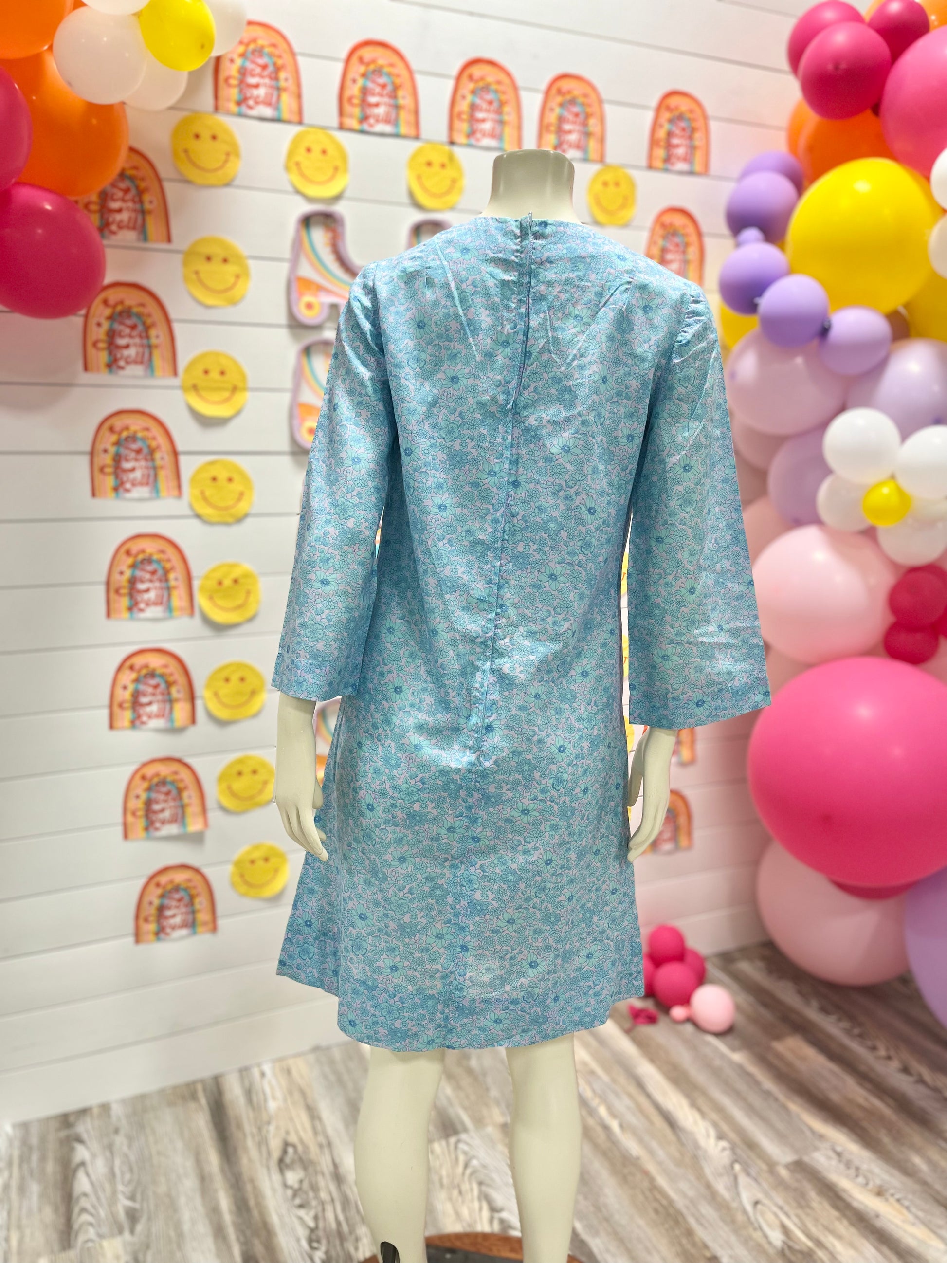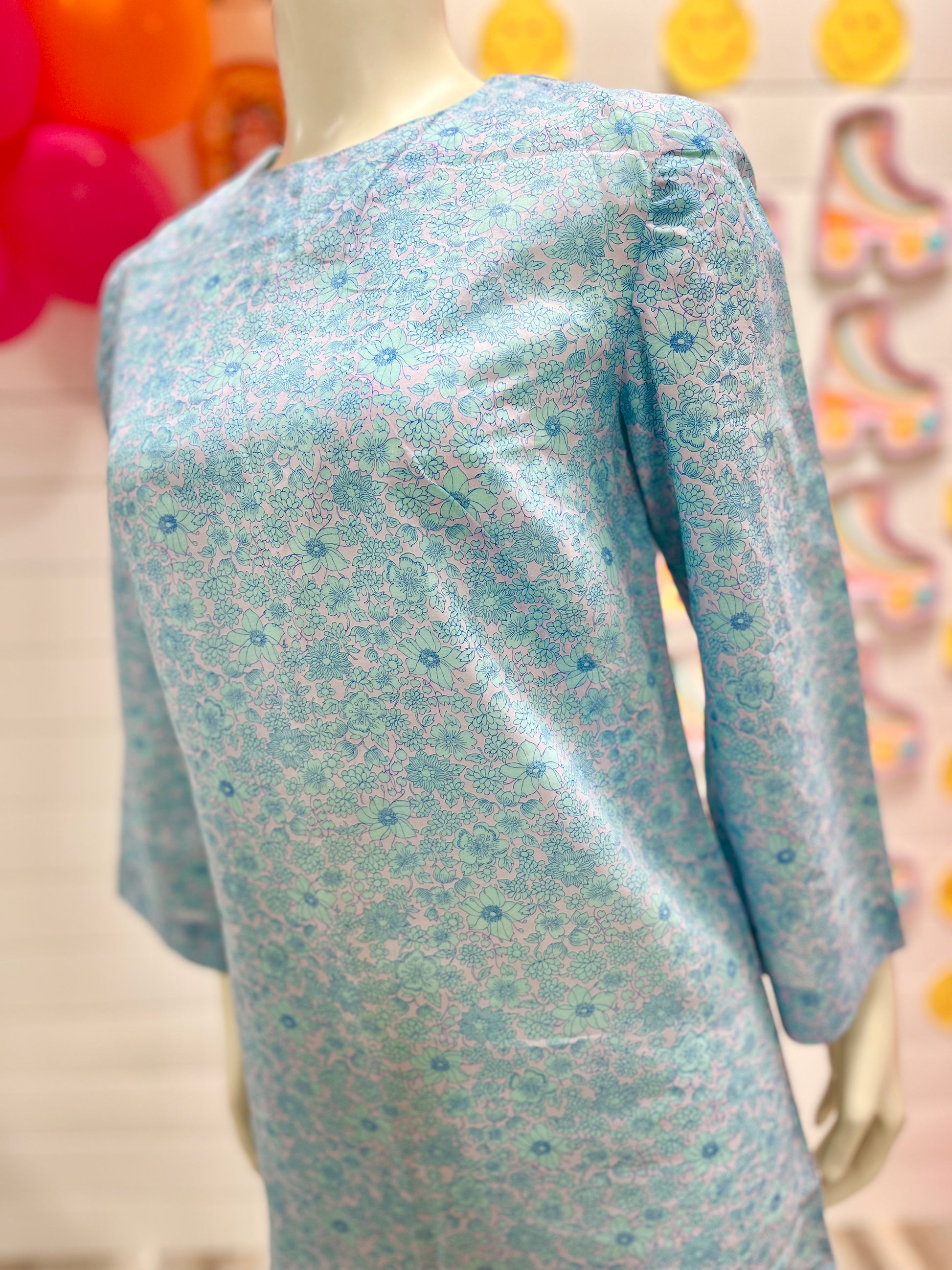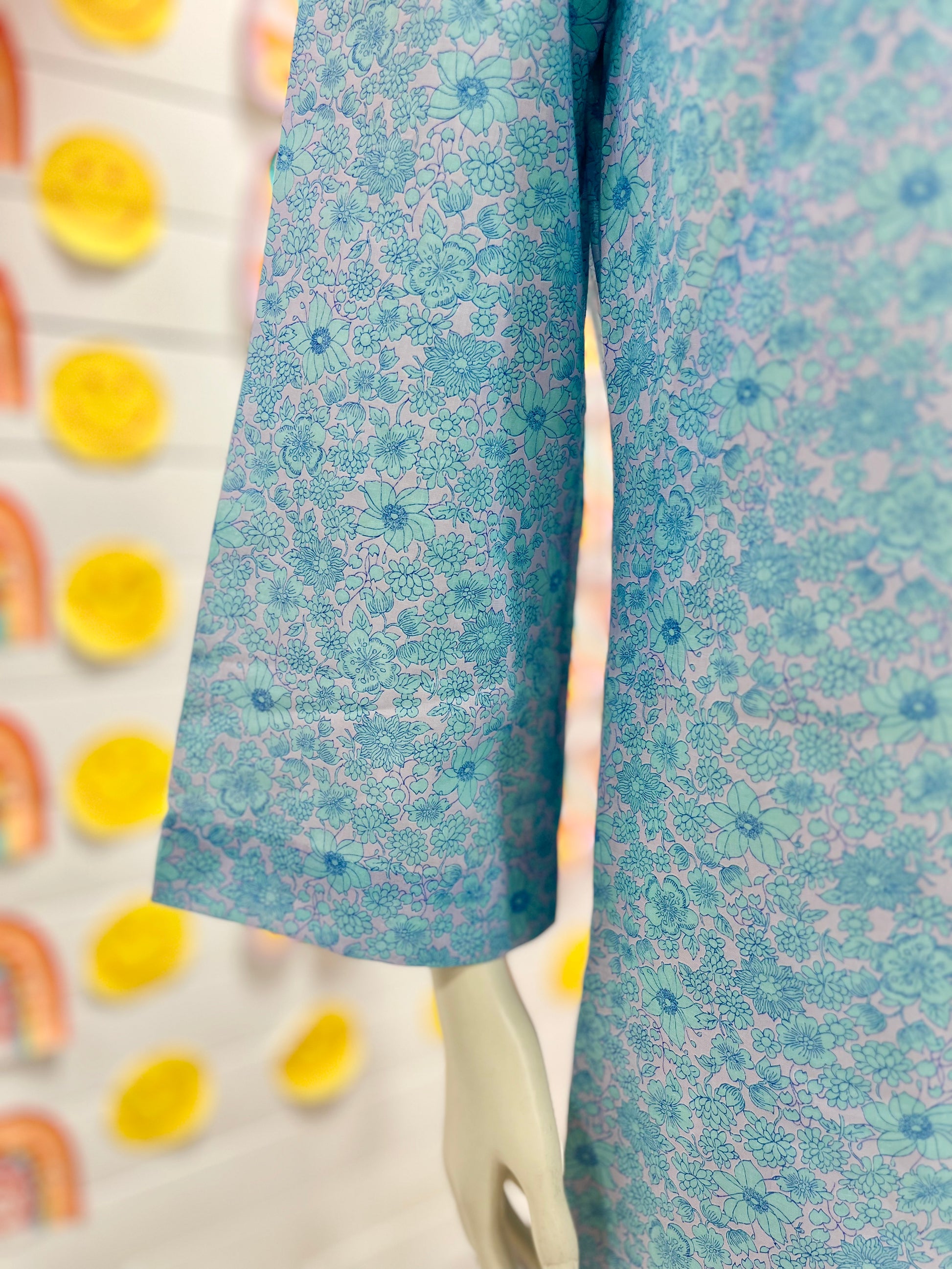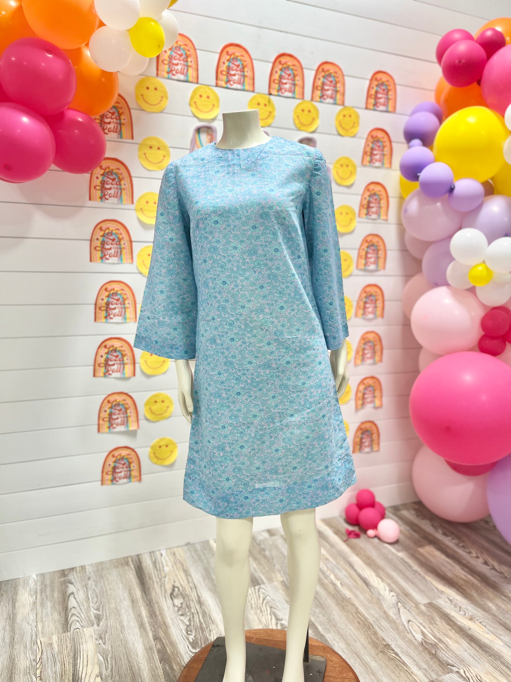 Vintage 70s Blue Boho Tiny Floral Print Hippie Mini Shift Dress