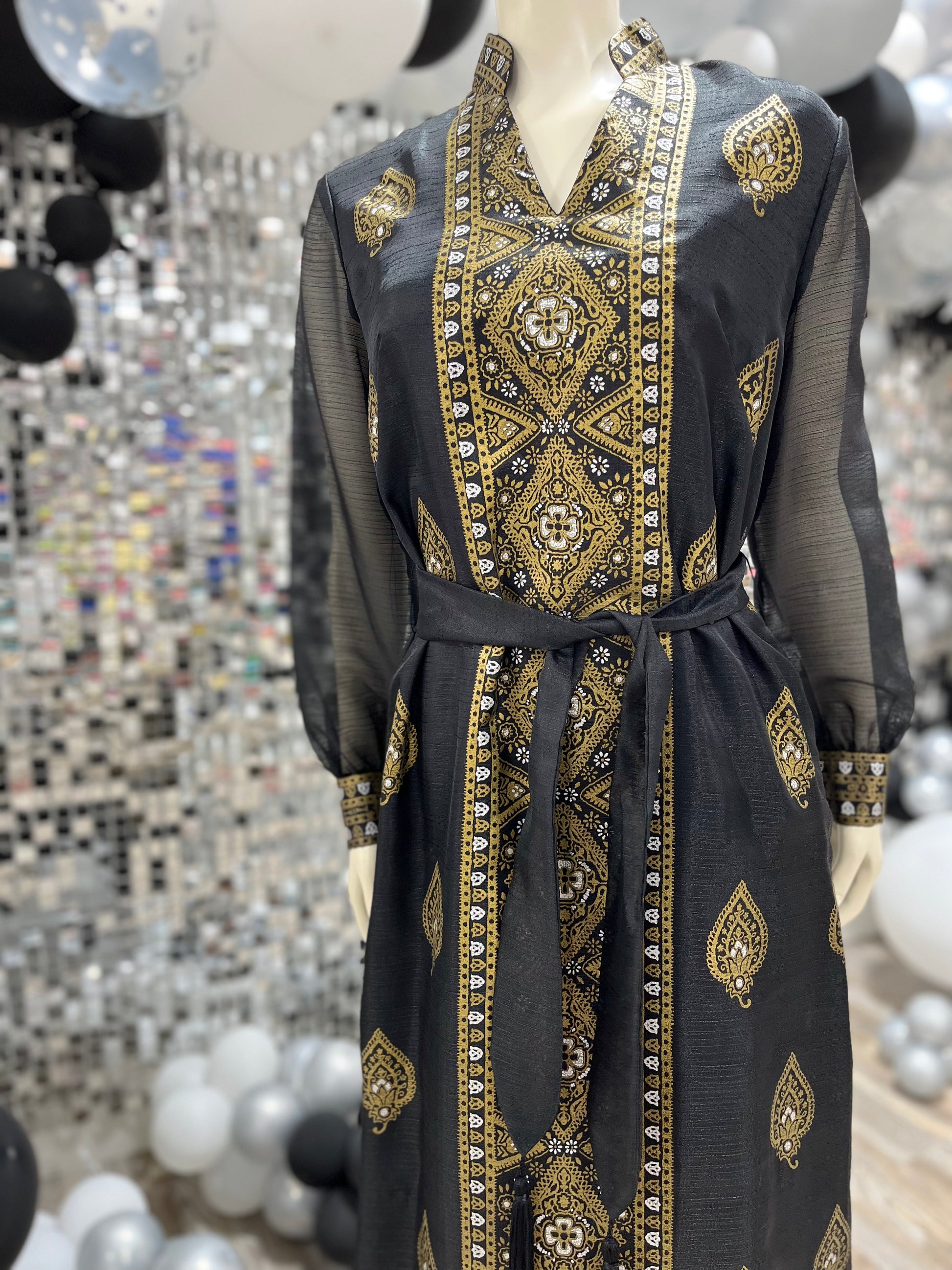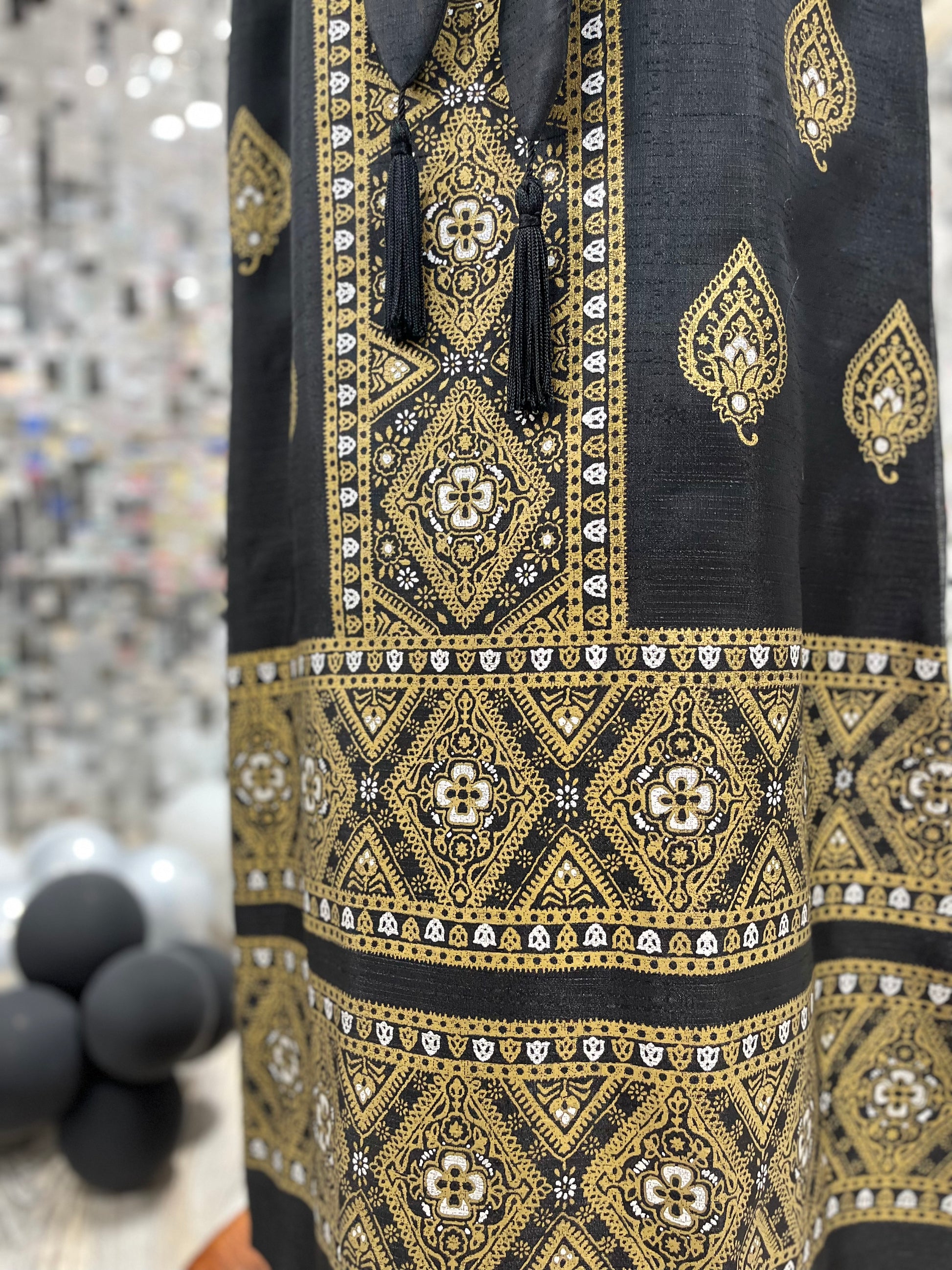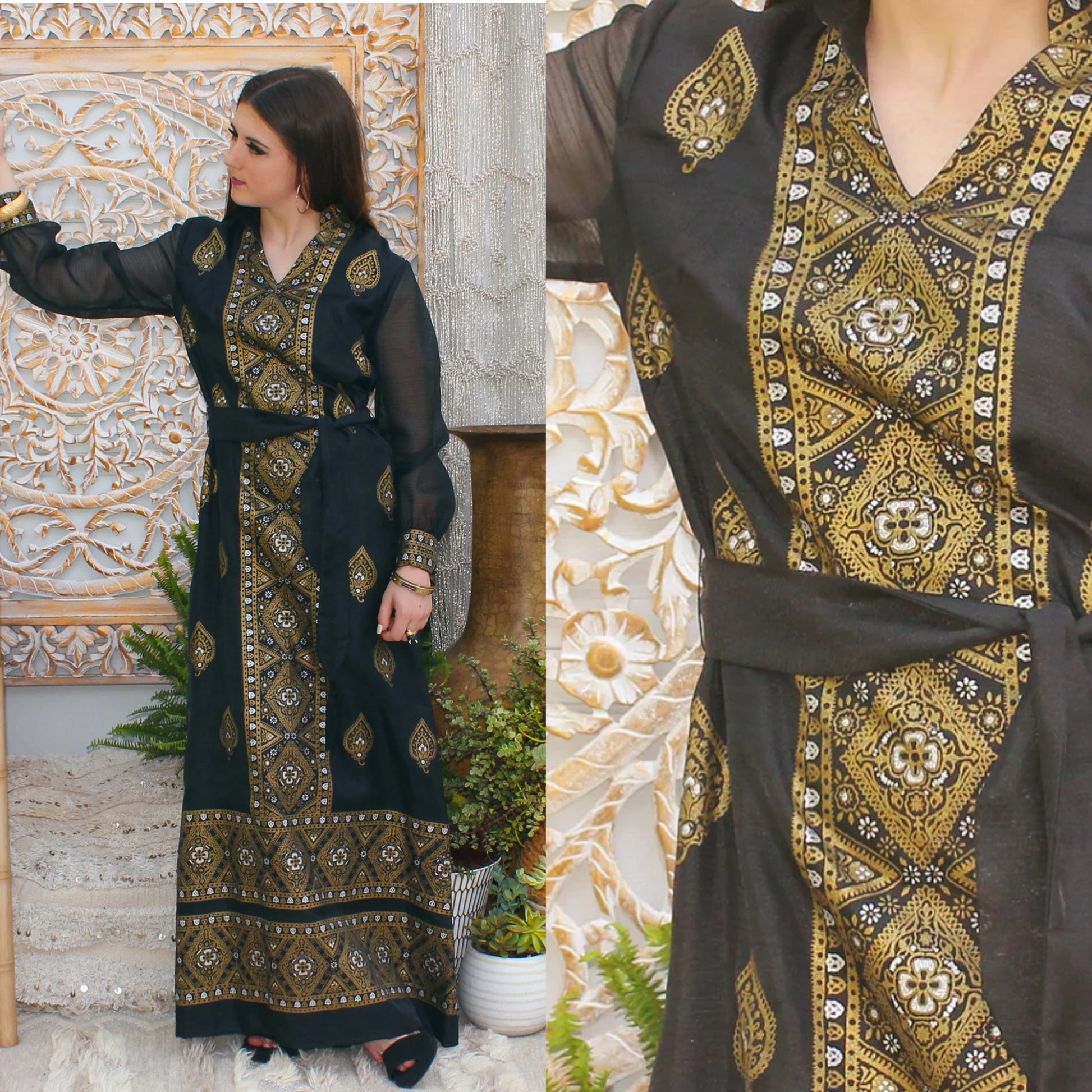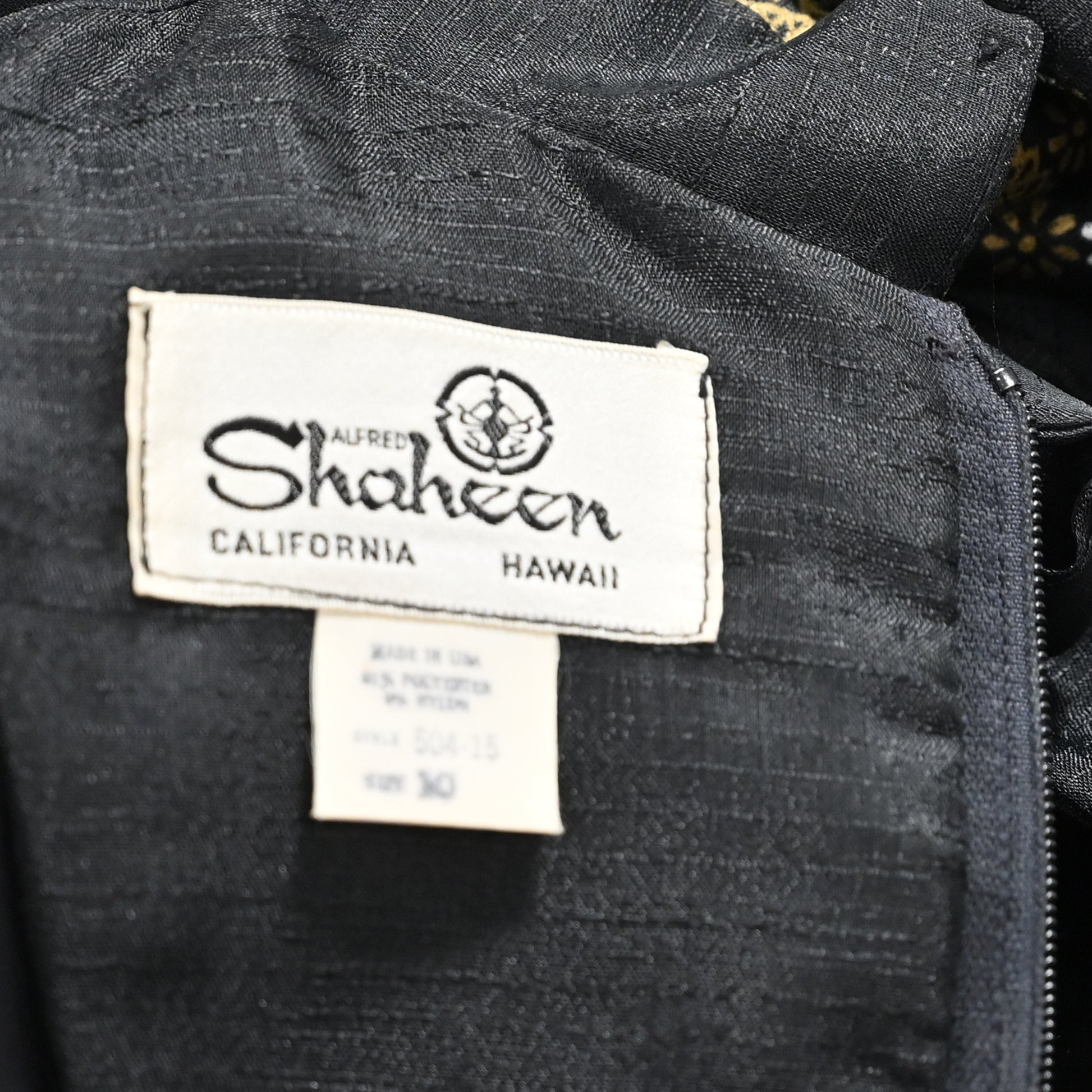 Vintage 70s Incredible Alfred Shaheen Gold Print Evening Maxi Dress M
