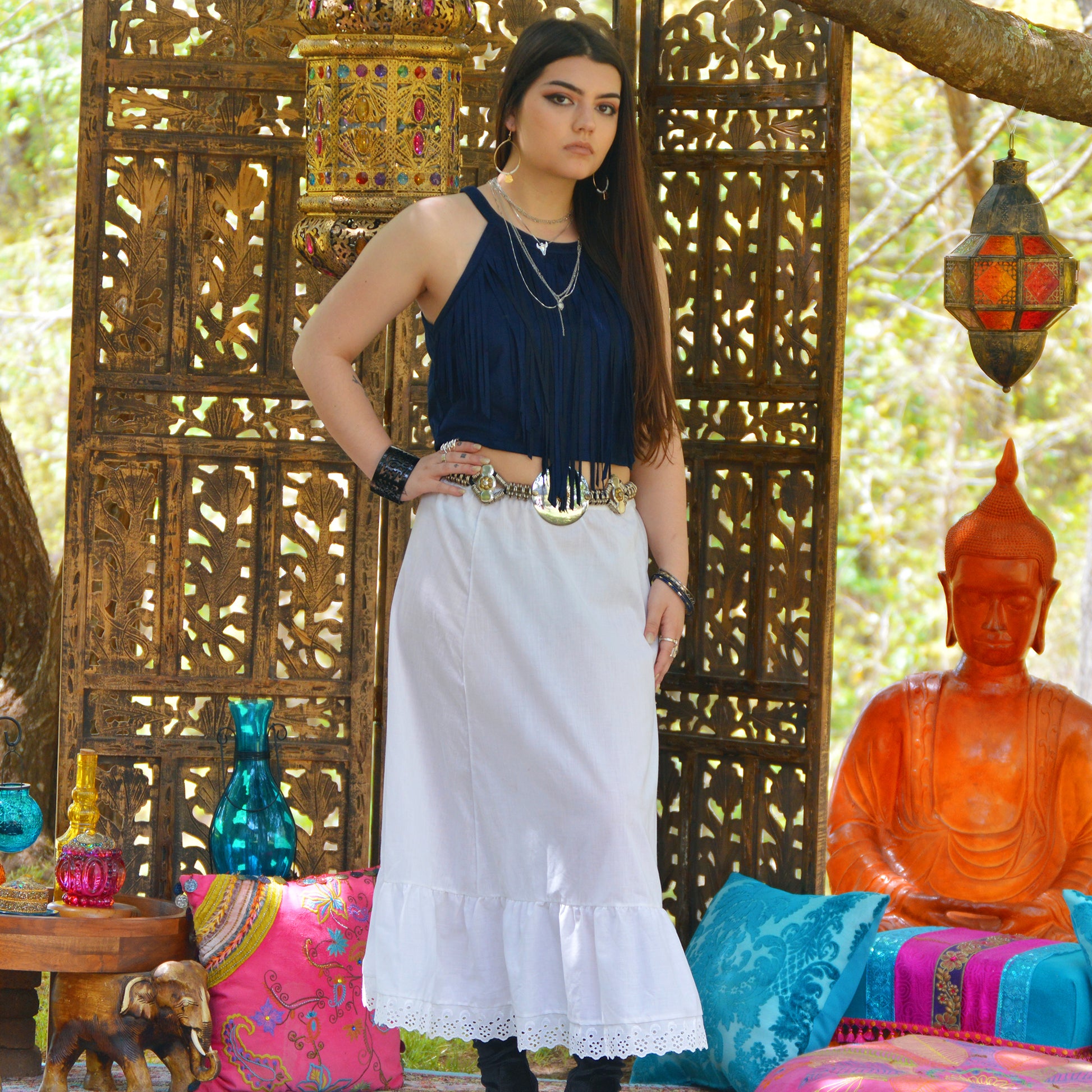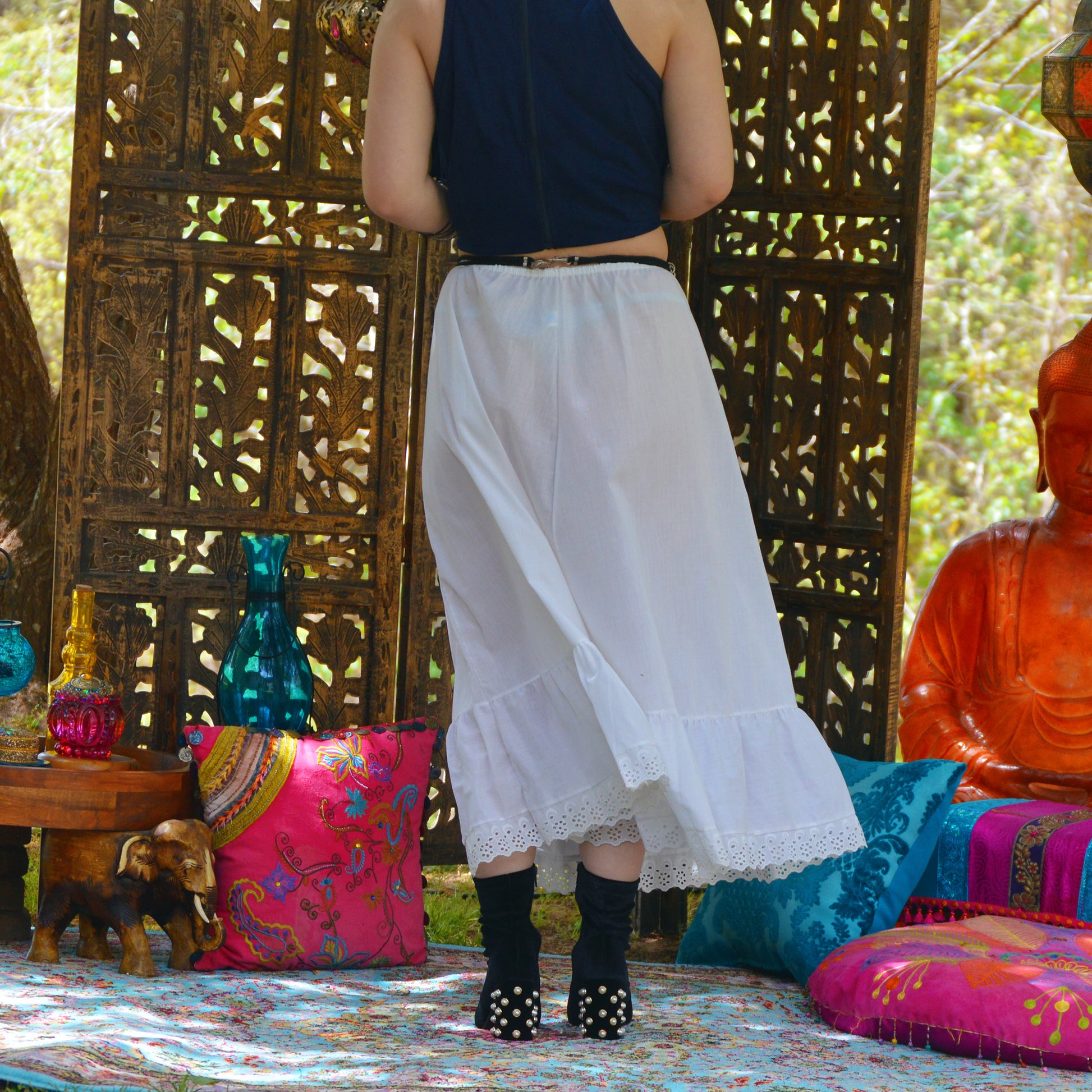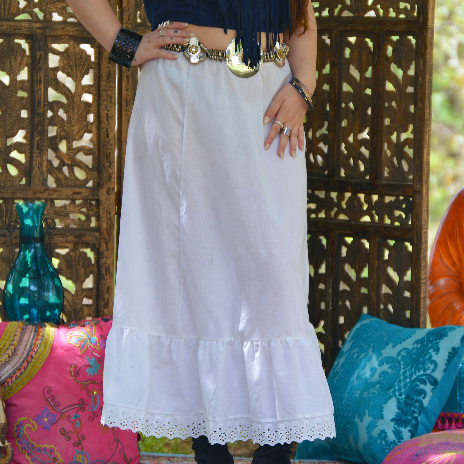 Vintage 70s Ivory Eyelet Lace Ruffle Midi Slip Skirt S/M