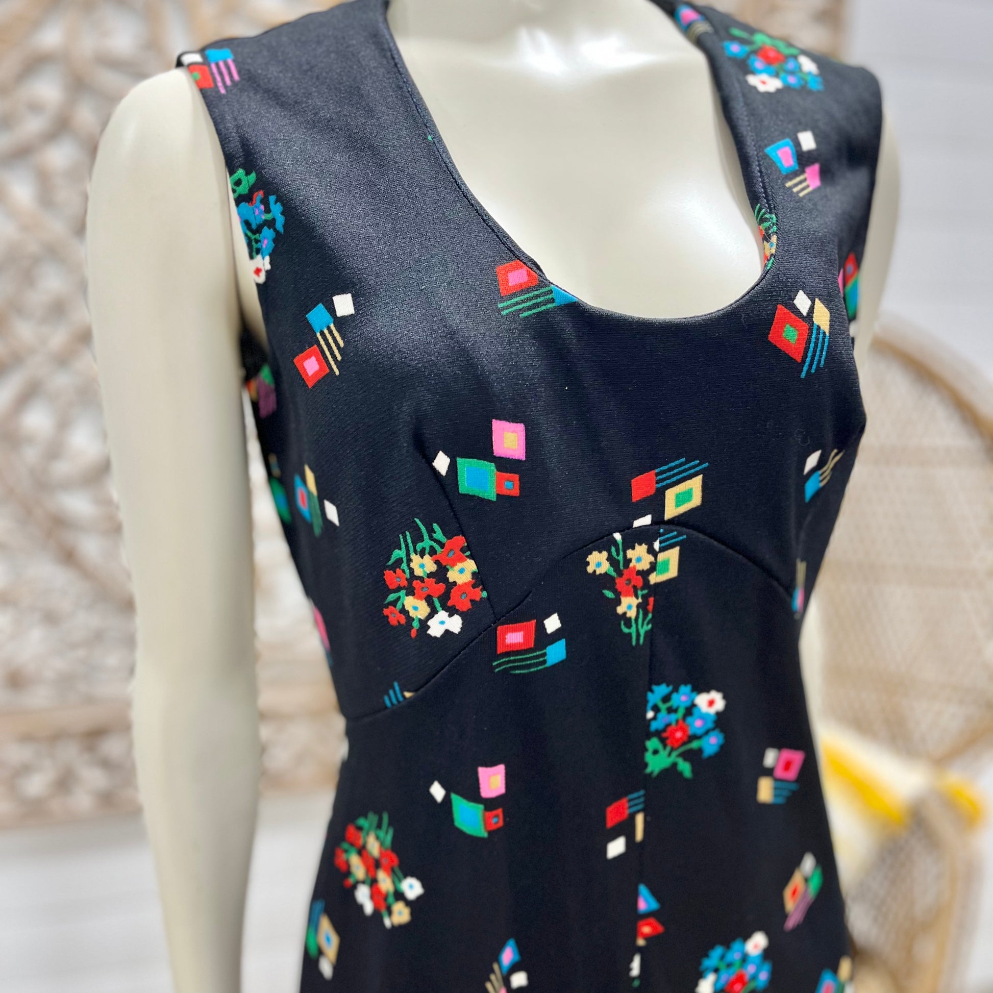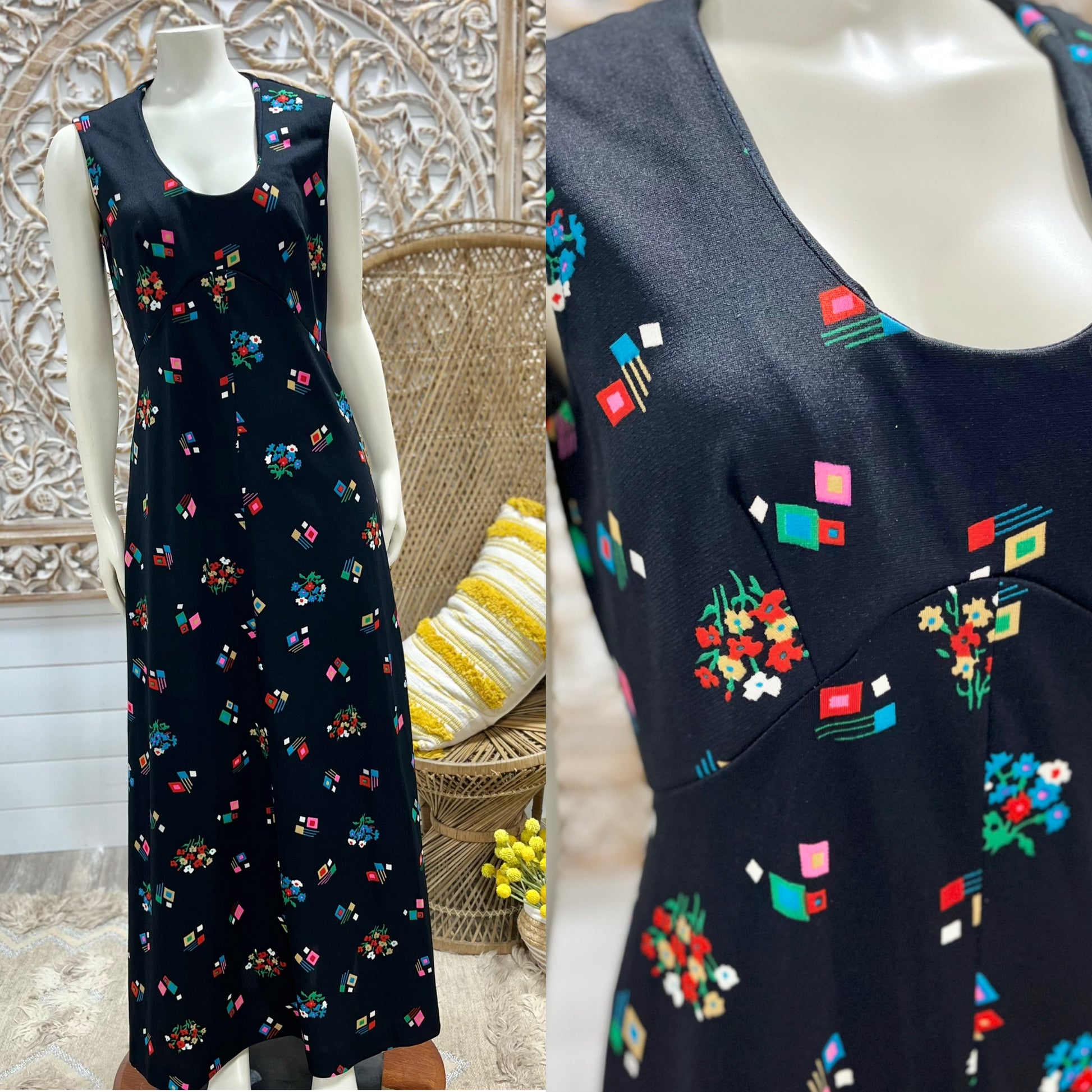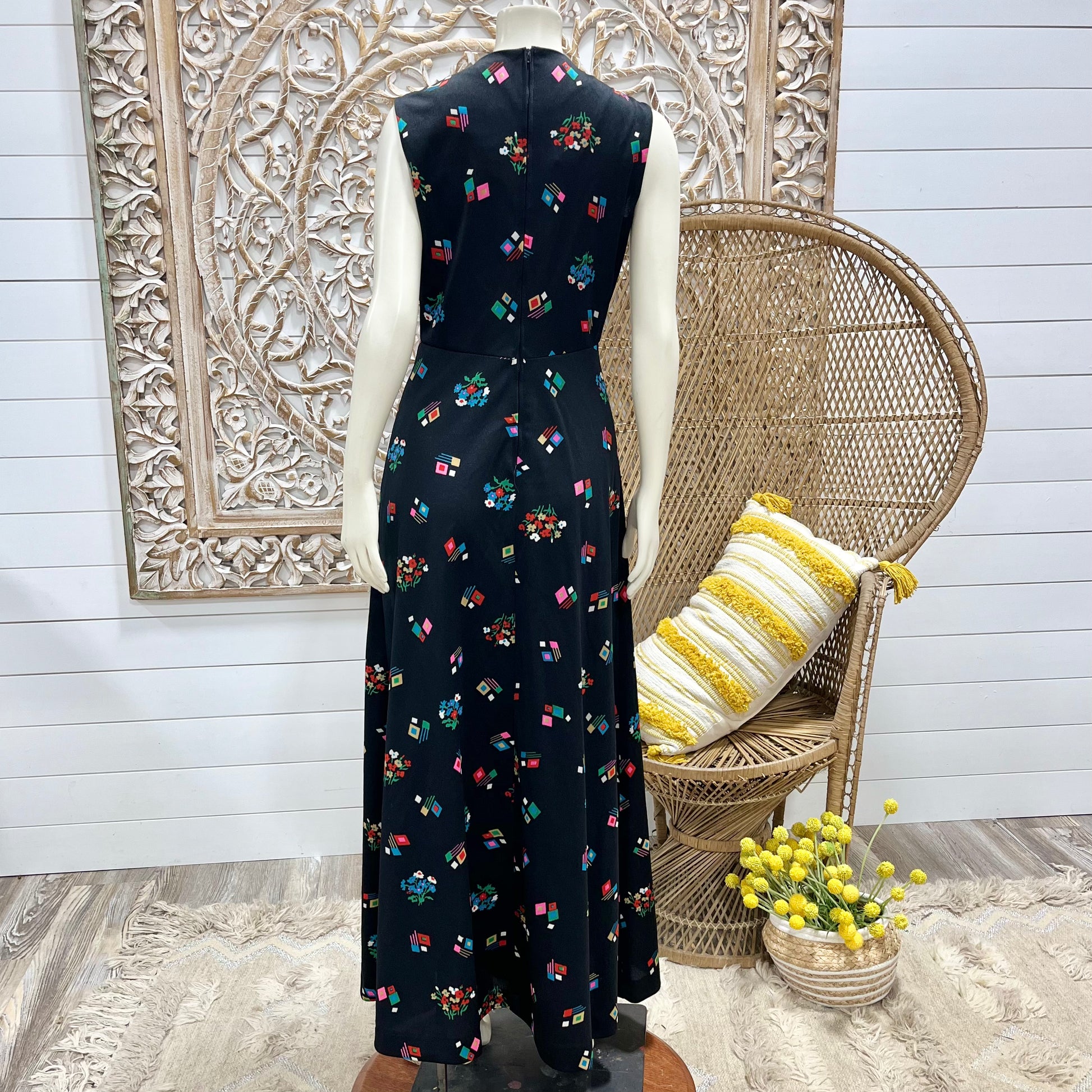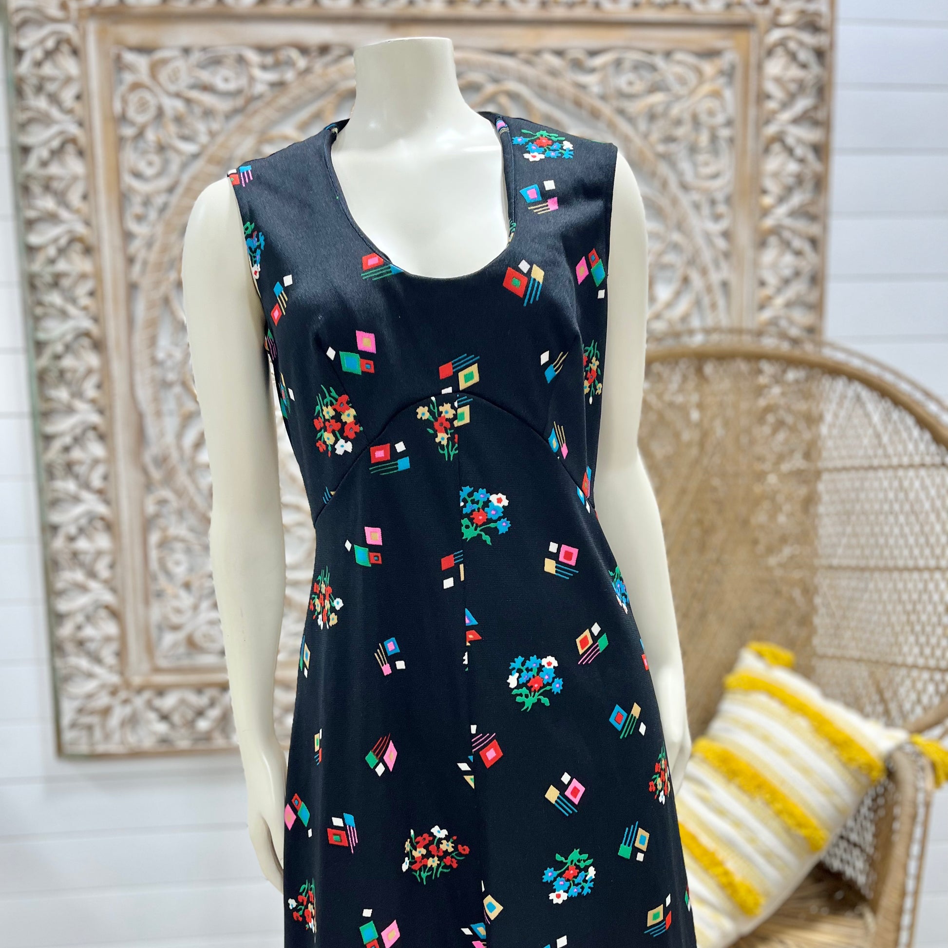 Vintage 70s Black Colorful Floral Geometric Maxi Dress