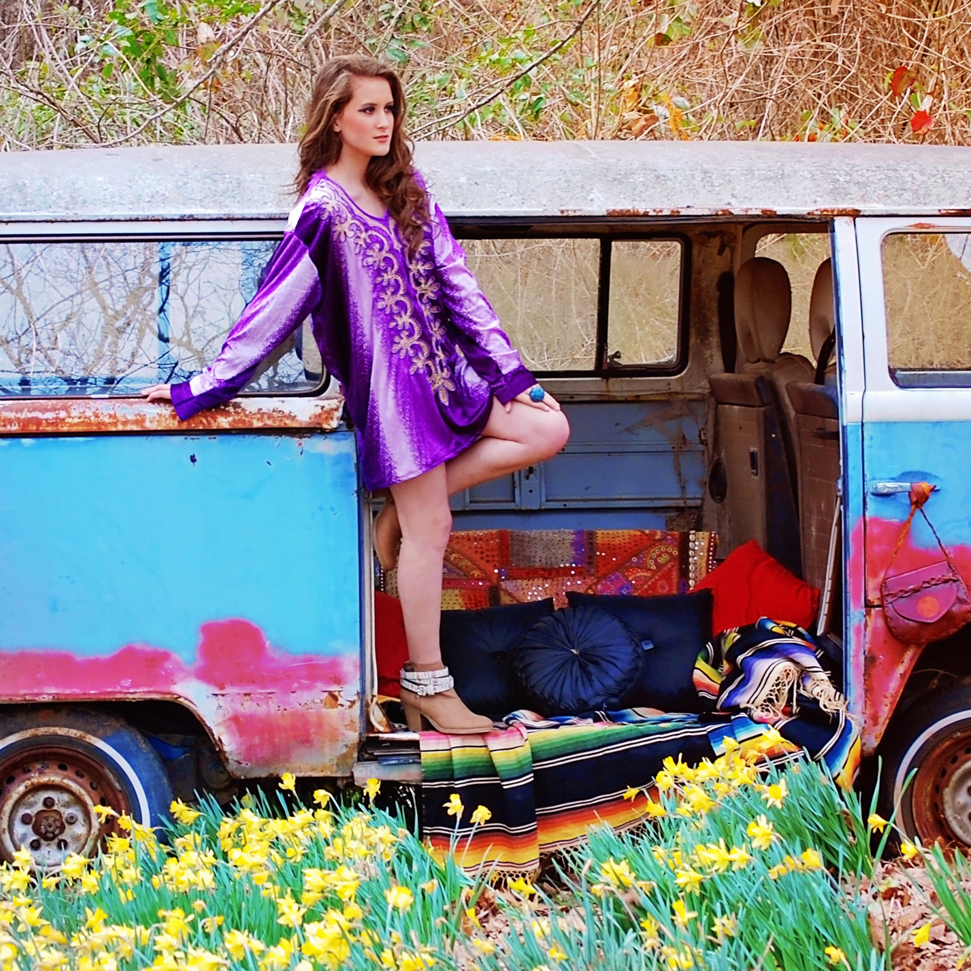 Vintage 70s Oversized Purple Velour Embroidered Caftan Mini Dress