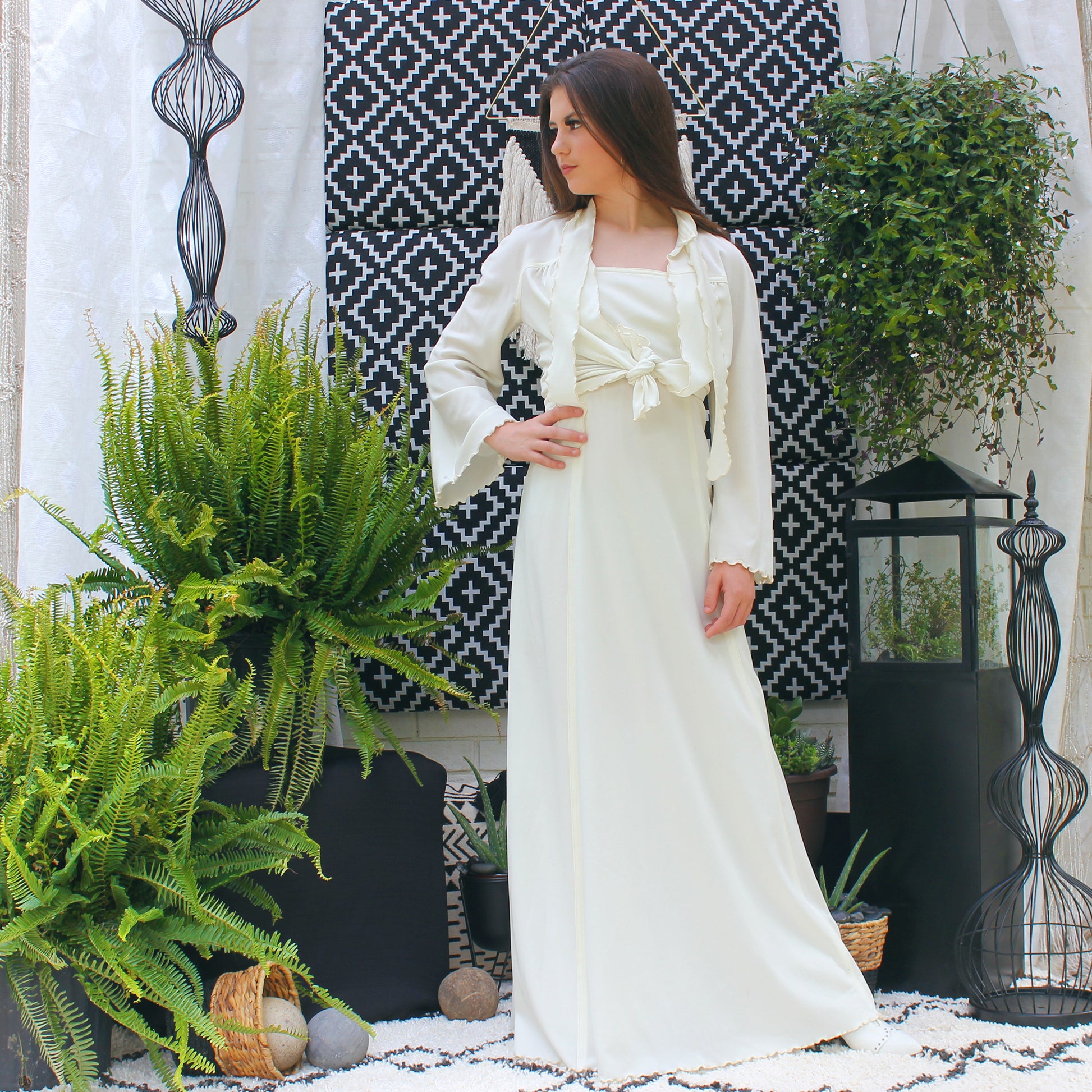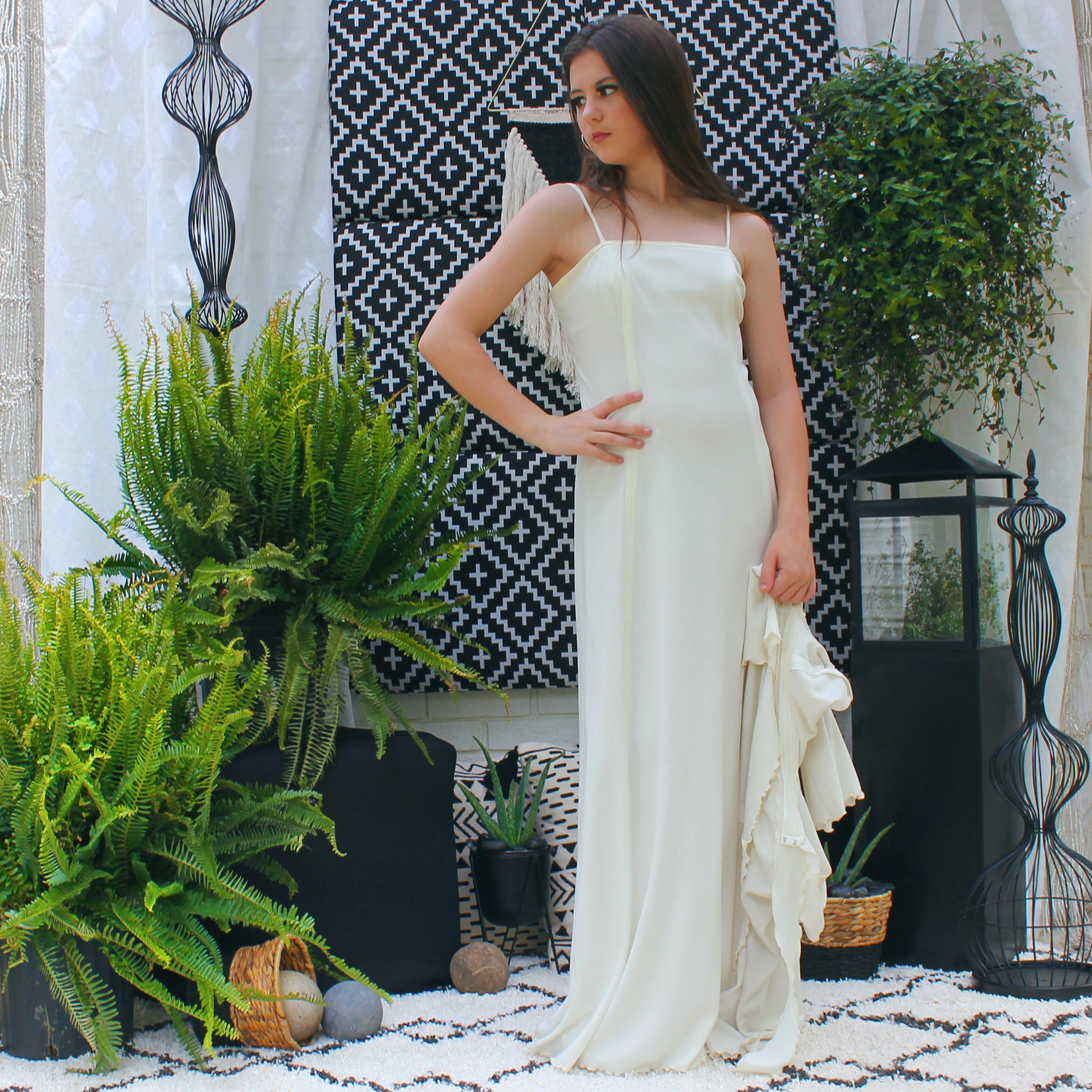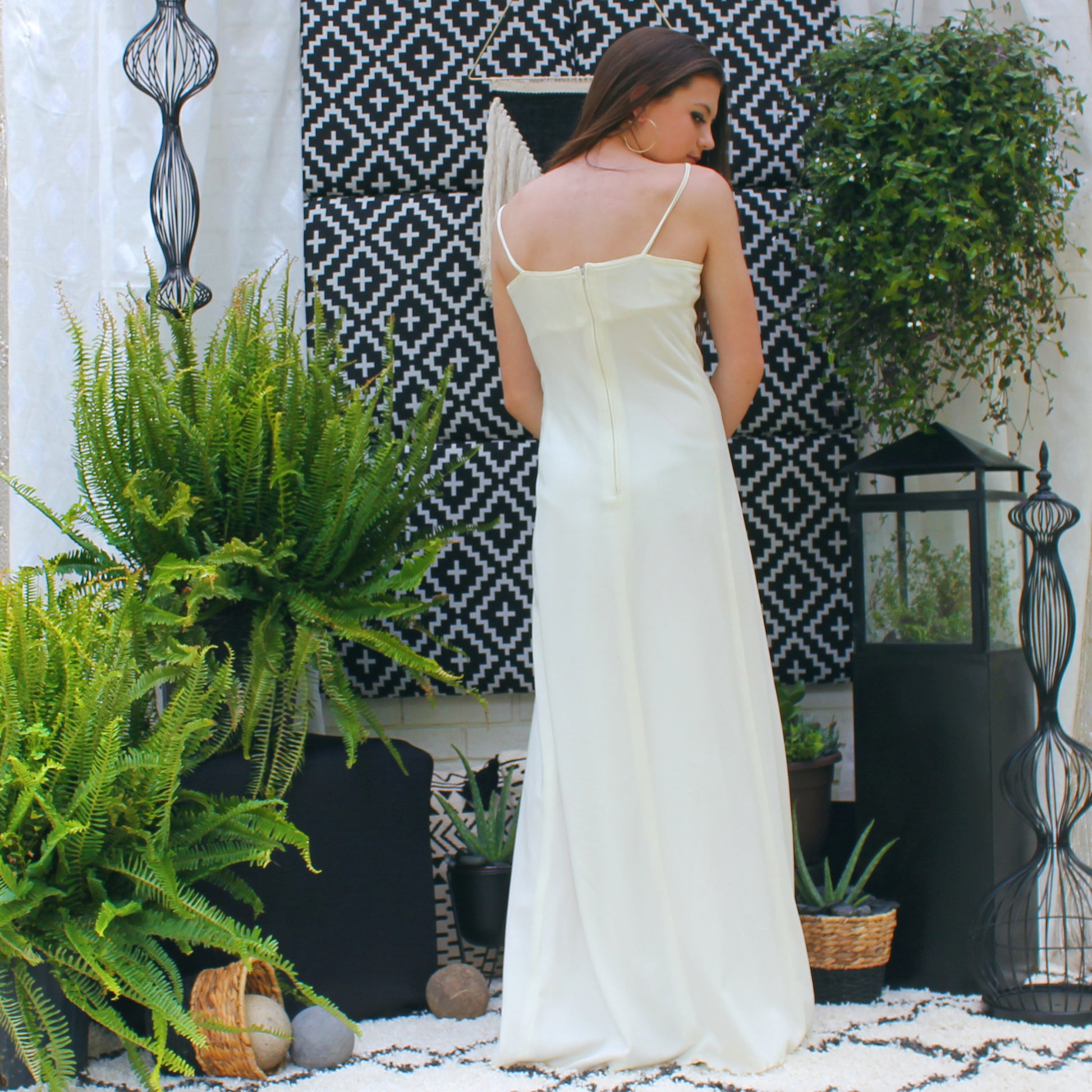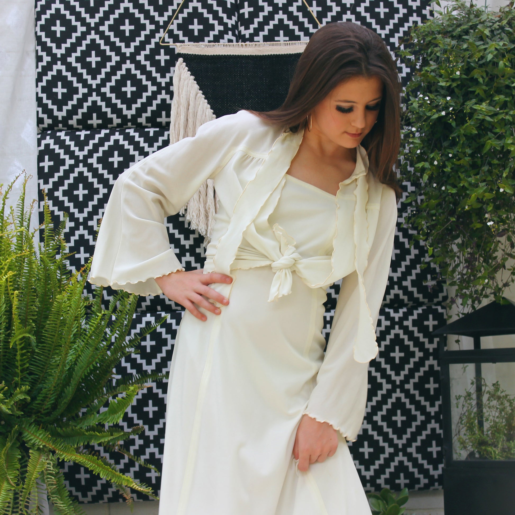 Vintage 70s Ruffle Lettuce Edge Slinky Ivory Maxi Dress and Jacket